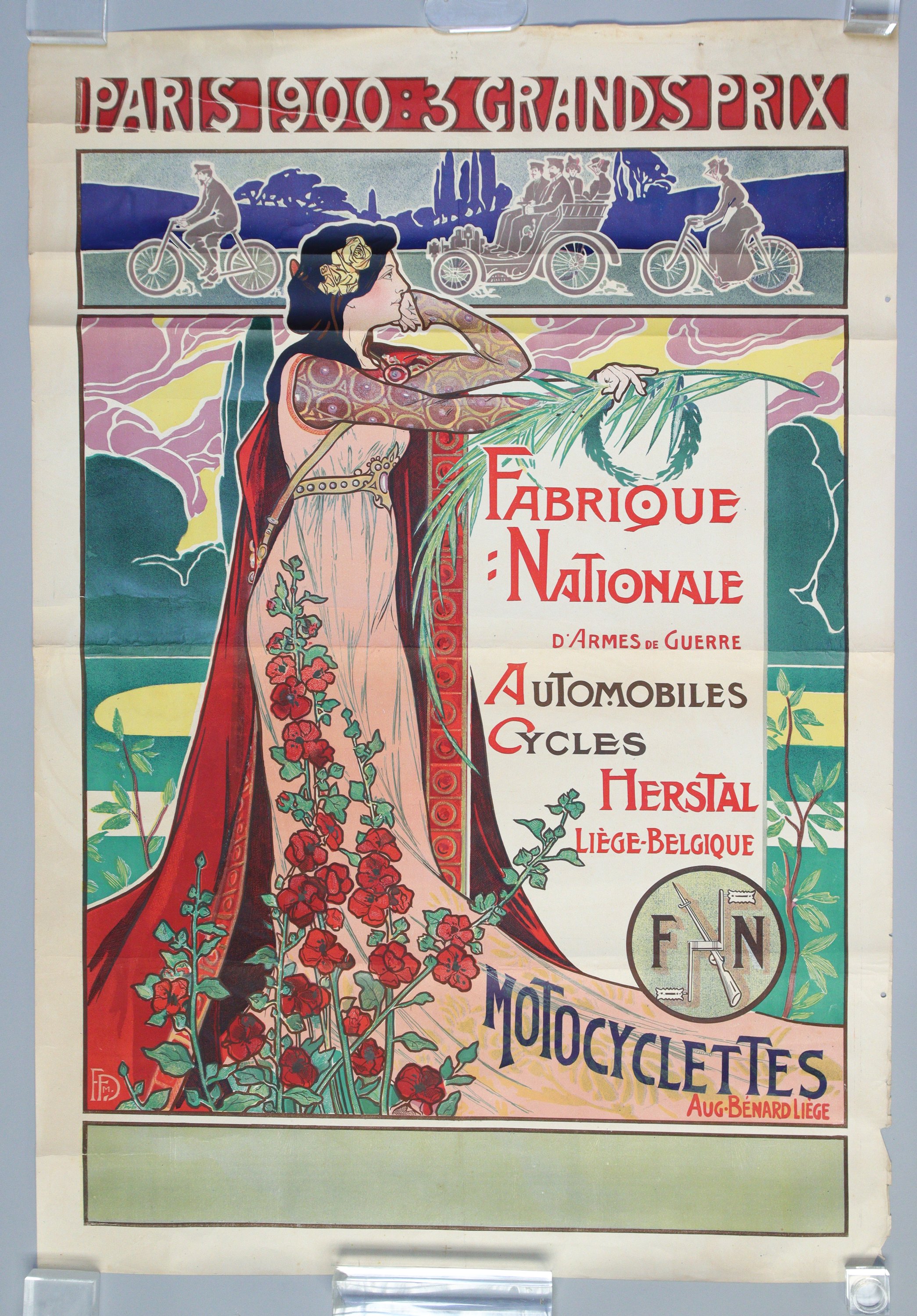 "Pairs 1900 : 3 grands prix / Fabrique Nationale d’armes de guerre. Automobiles, cycles, Herstal, Liège, Belgique / FN / Motocyclettes". Epreuve originale imprimée en couleurs "Aug. Bénard, Liège"