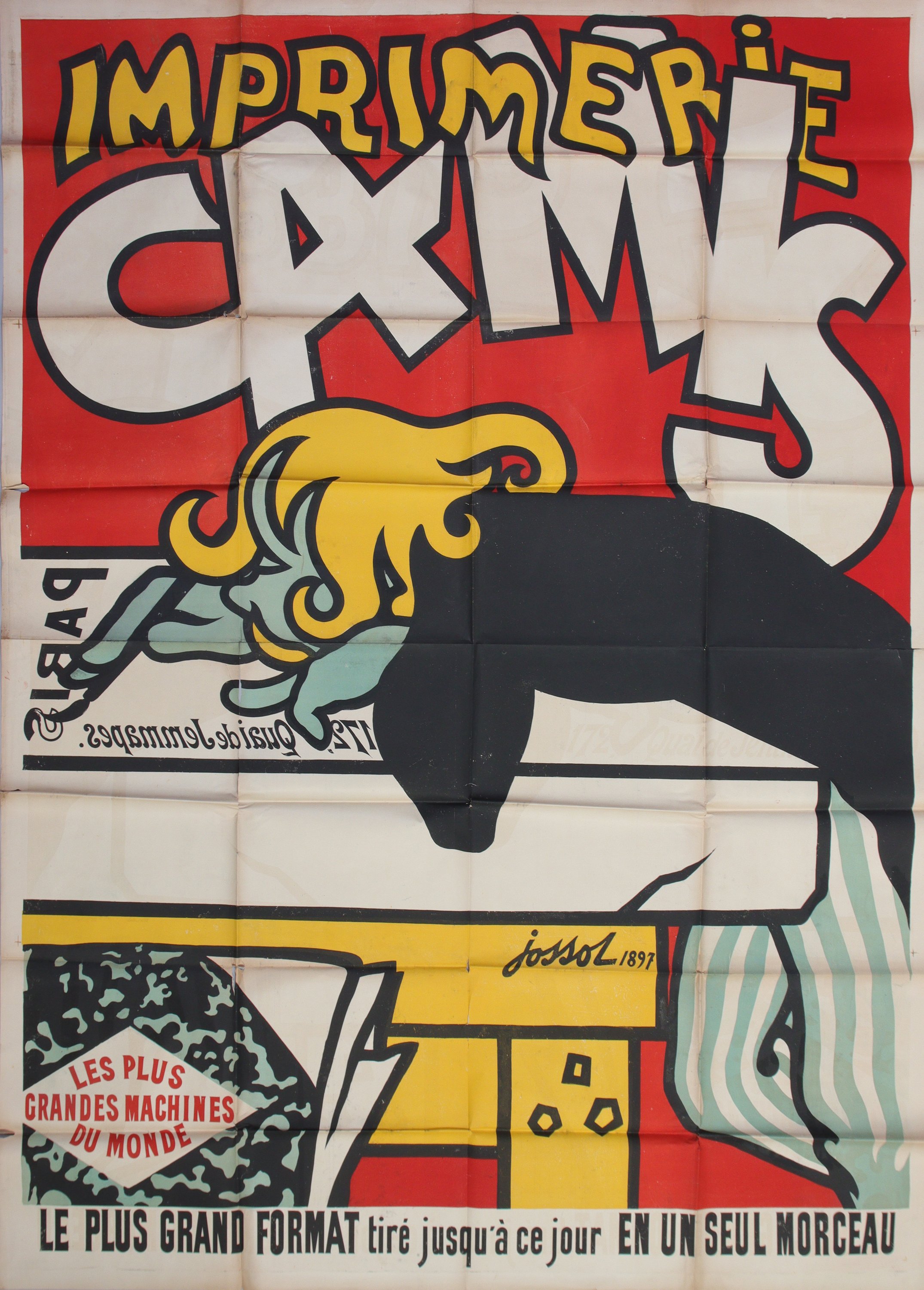 « IMPRIMERIE CAMIS / Les plus grandes machines du monde / Le plus grand format tiré jusqu’à ce jour en un seul morceau ». Signée et datée 1897. Épreuve originale imprimée en couleurs. Env. 260 x 190 cm. Non entoilée (plis, petites déchirures et qqs rousseurs/salissures).