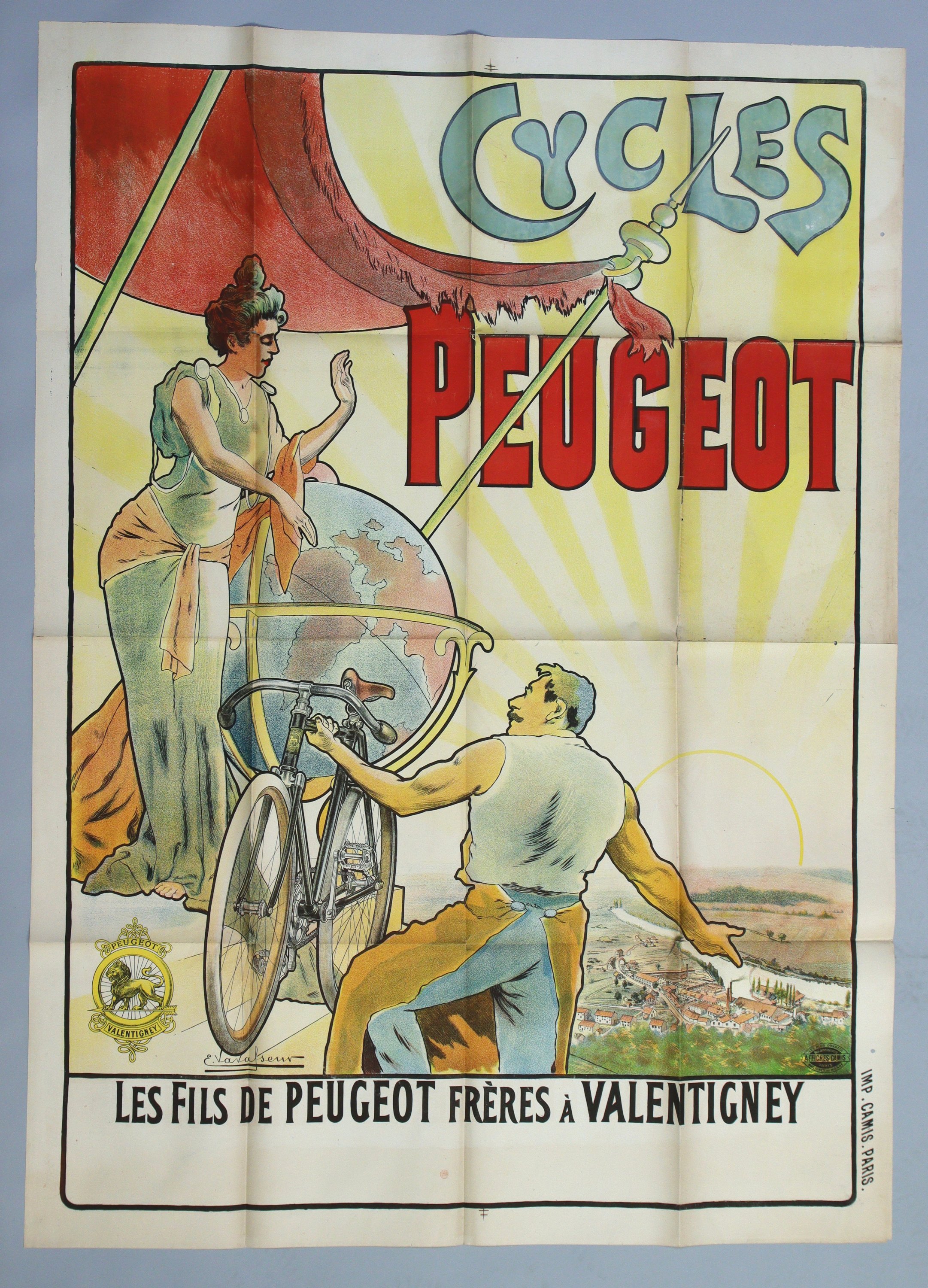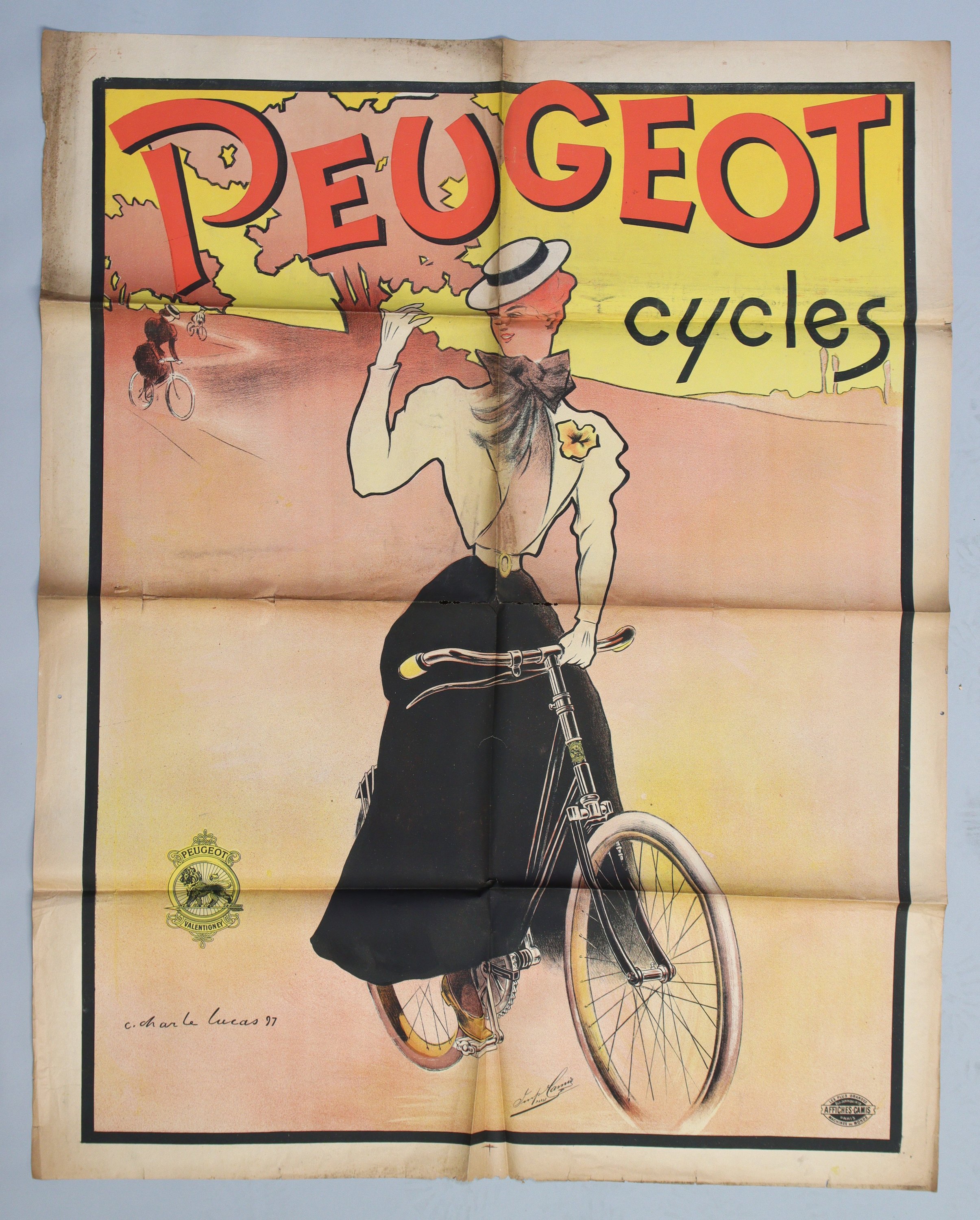 « PEUGEOT cycles ». Signée et datée 1897. Env. 140 x 110 cm (plis, petites déchirures, rousseurs/salissures).