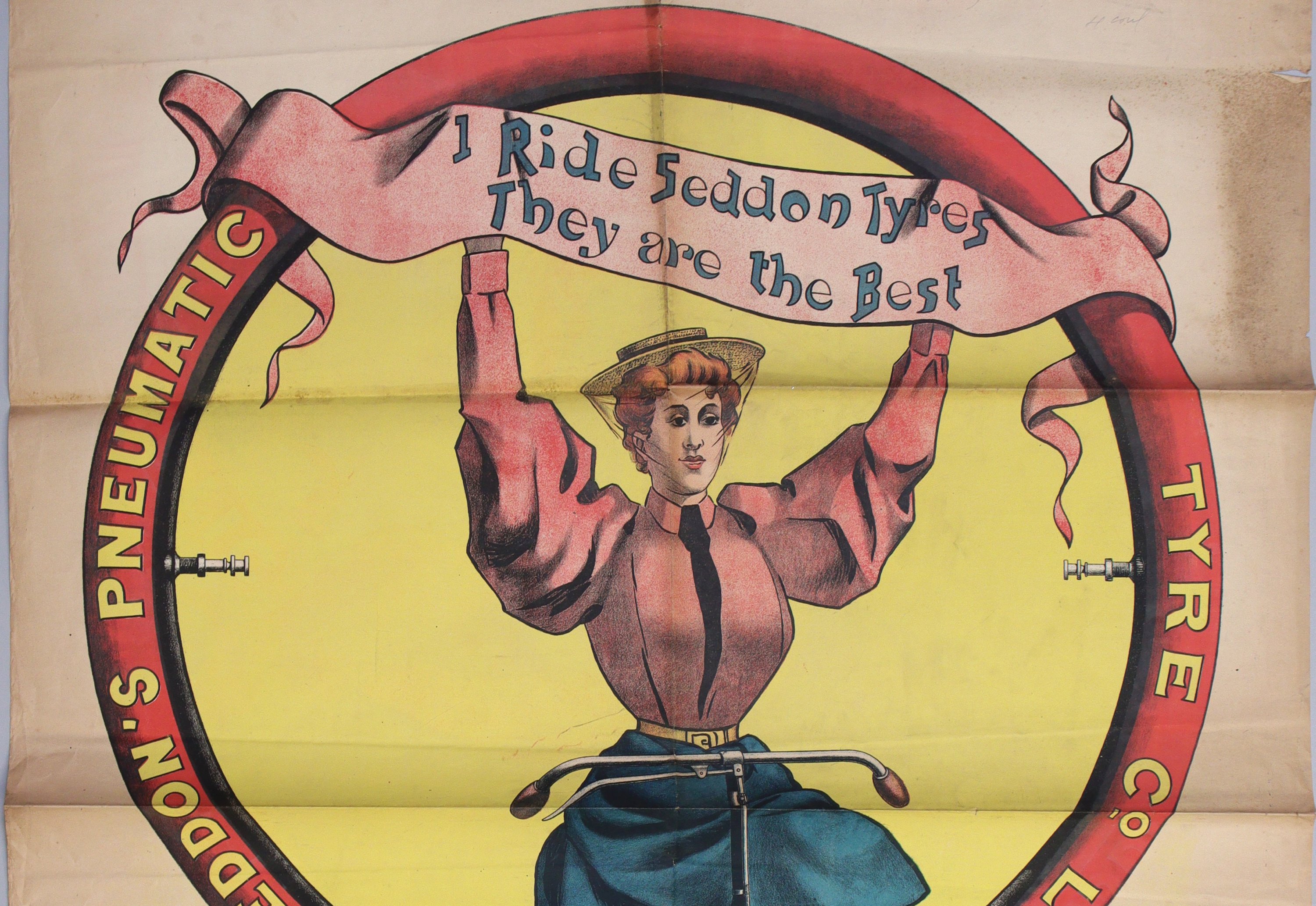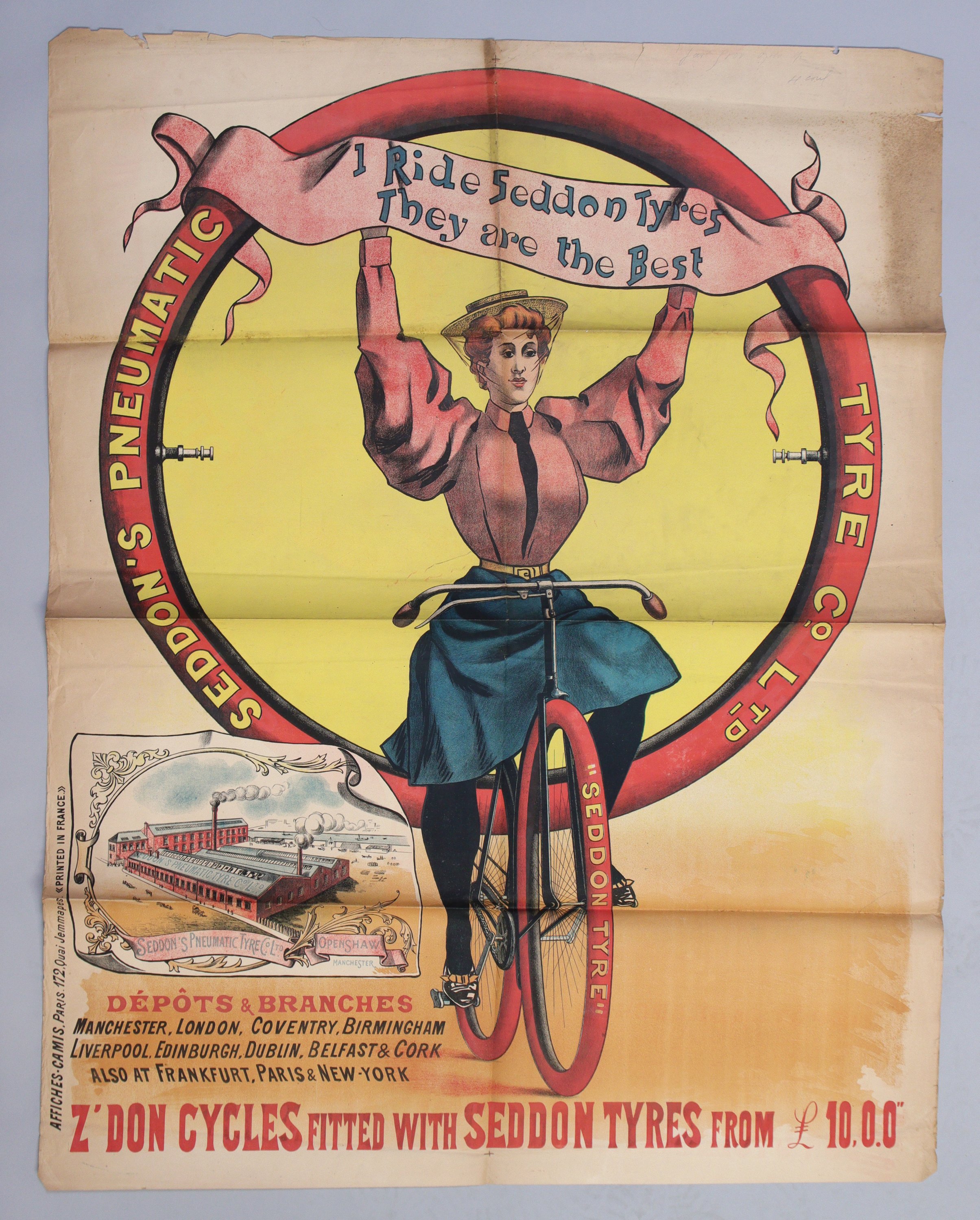 « SEDDONS PNEUMATIC TYRE Co Ltd / I ride Seddon Tyres they are the best / Manchester ». [1895]. Env. 130 x 100 cm (plis, petites déchirures, rousseurs/salissures) ;