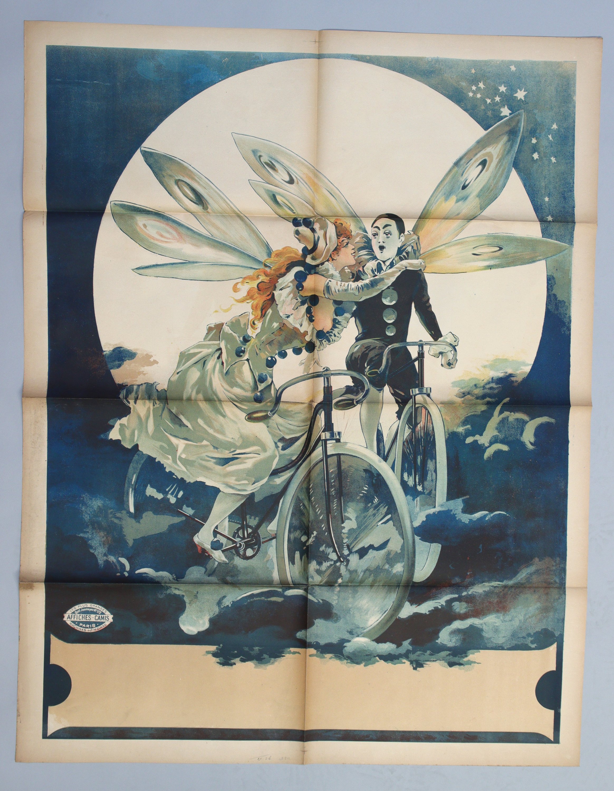 Elégante à bicyclette en promenade [Affiche passe-partout]. Signée. Vers 1898. Env. 130 x 100 cm (plis, petites déchirures, rousseurs/salissures) ;