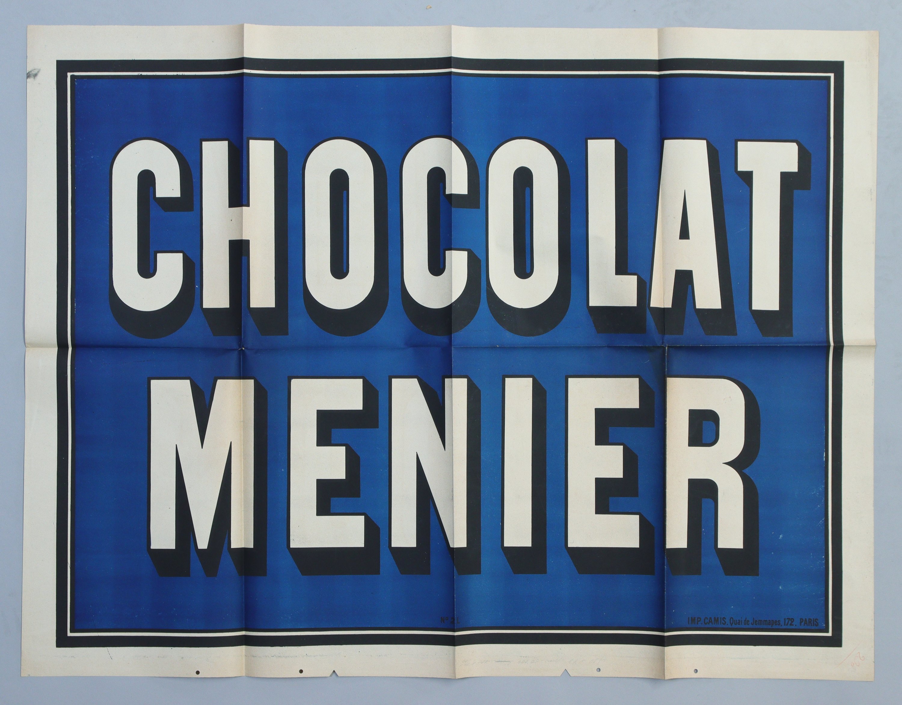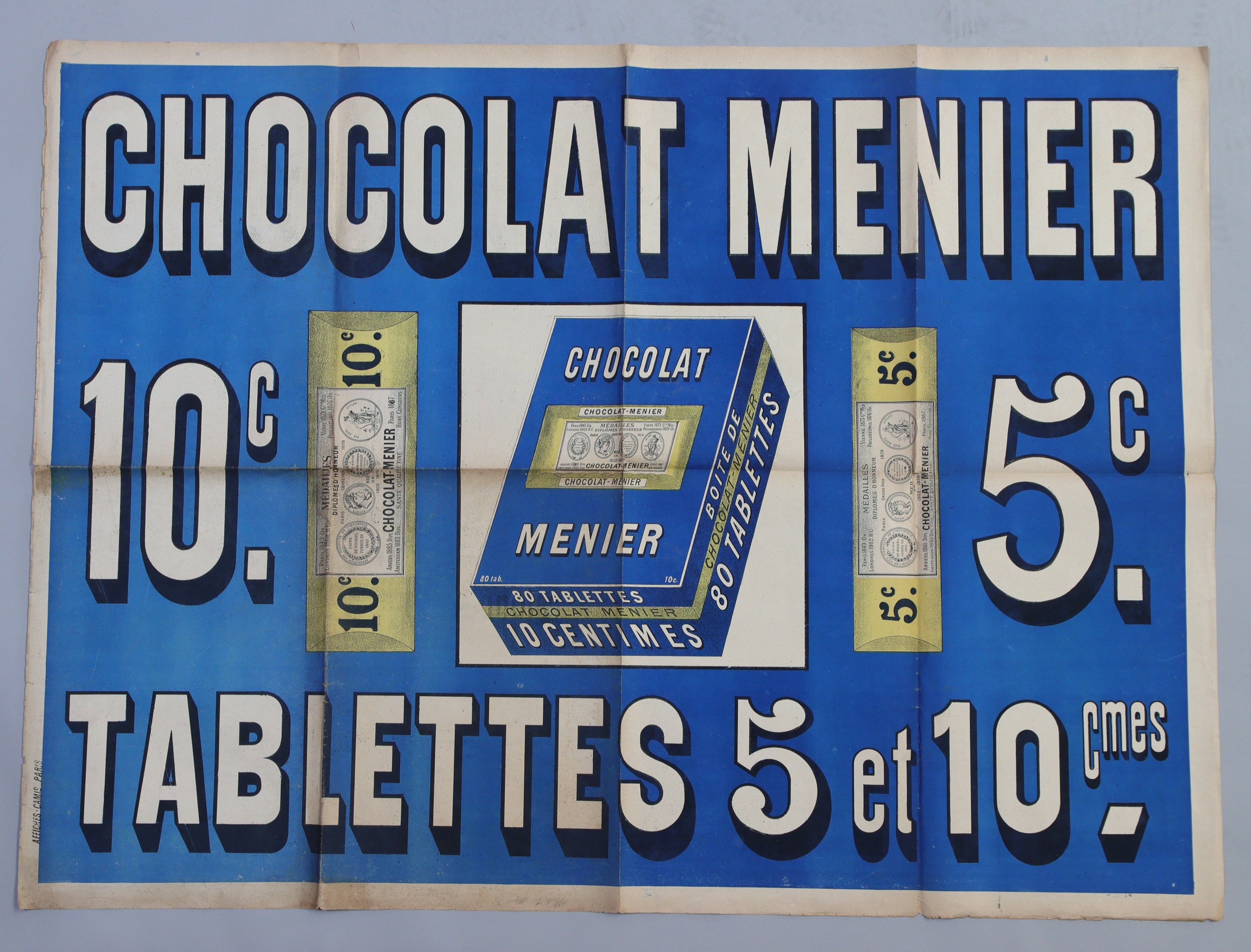 « CHOCOLAT MENIER / Tablettes 5 et 10 cts ». Vers 1898. Env. 80 x 110 cm (plis, petites déchirures, rousseurs/salissures).