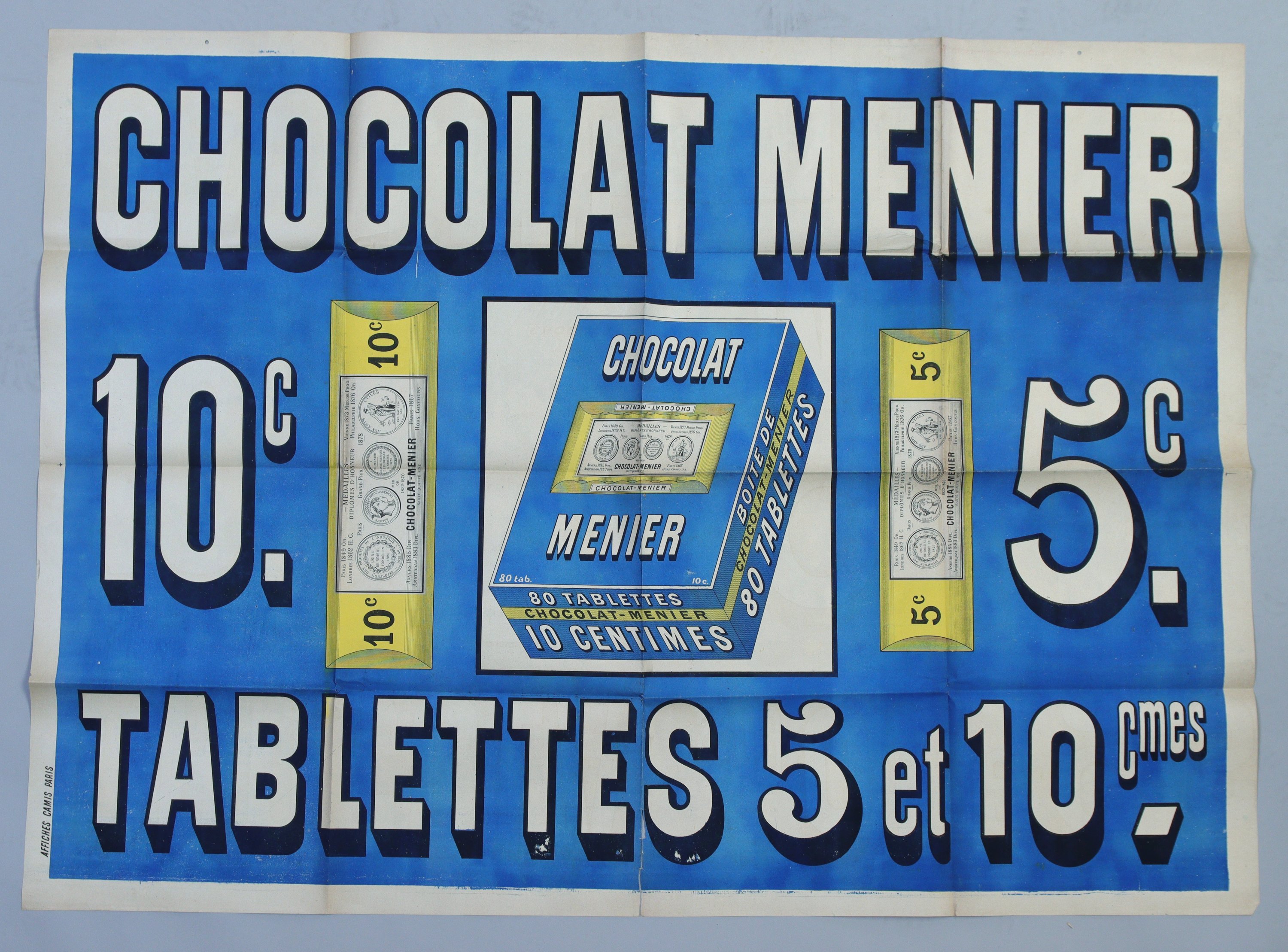 « CHOCOLAT MENIER / Tablettes 5 et 10 cts ». [1898]. Env. 150 x 110 cm (plis, petites déchirures, rousseurs/salissures) ;