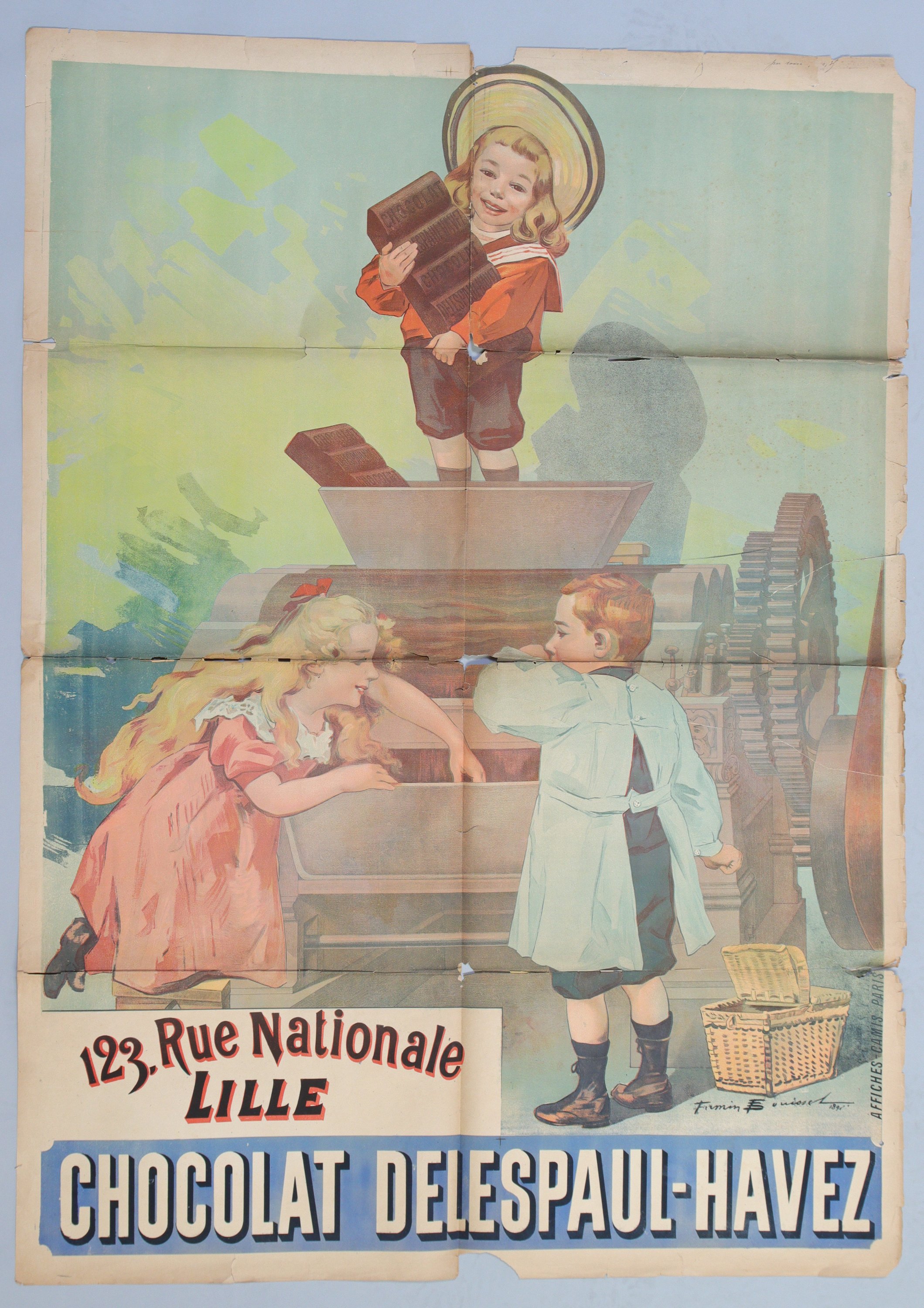 « CHOCOLAT DELESPAUL-HAVEZ / 12 rue Nationale Lille ». Signée et datée 1896. Env. 140 x 100 cm. En létat (plis, déchirures, manques, rousseurs/salissures).