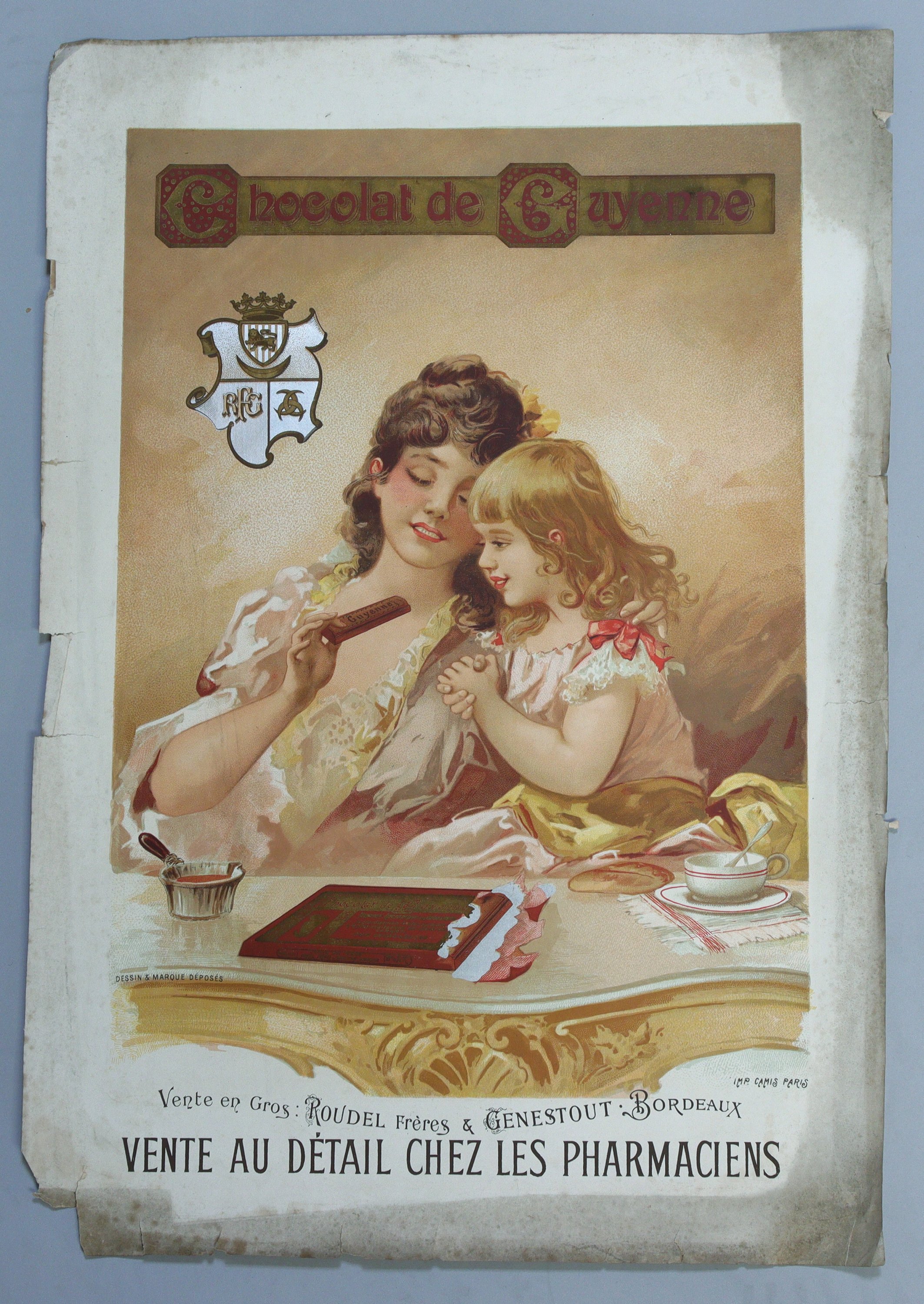 « CHOCOLAT de GUYENNE / Vente au détail chez tous les pharmaciens / Roudel frères & Genestout Bordeaux ». Vers 1896. 54 x 37 cm (déchirures, rousseurs/salissures) ;