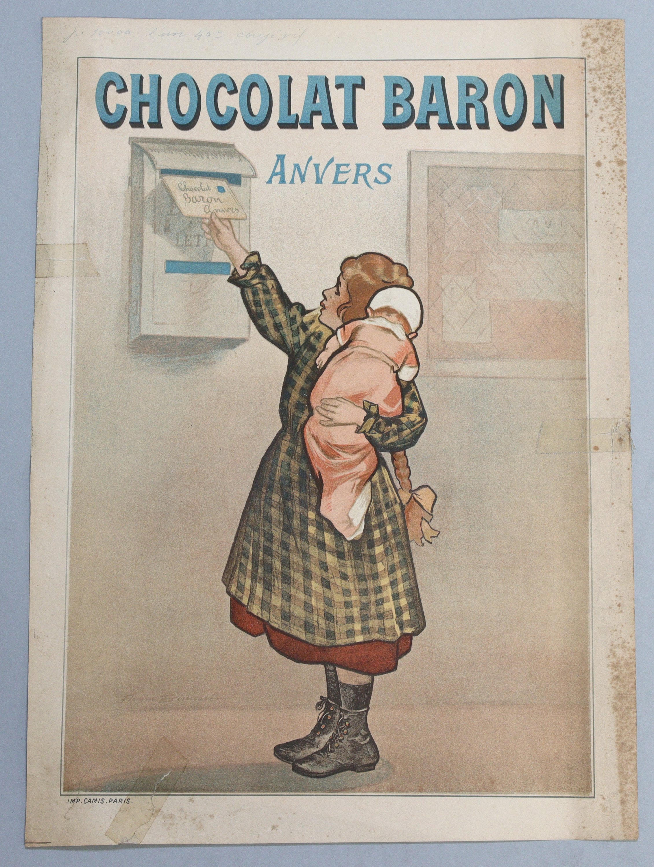 « CHOCOLAT BARON / Anvers ». Vers 1898. 45 x 32 cm (petites déchirures collées avec du scotch, rousseurs/salissures).