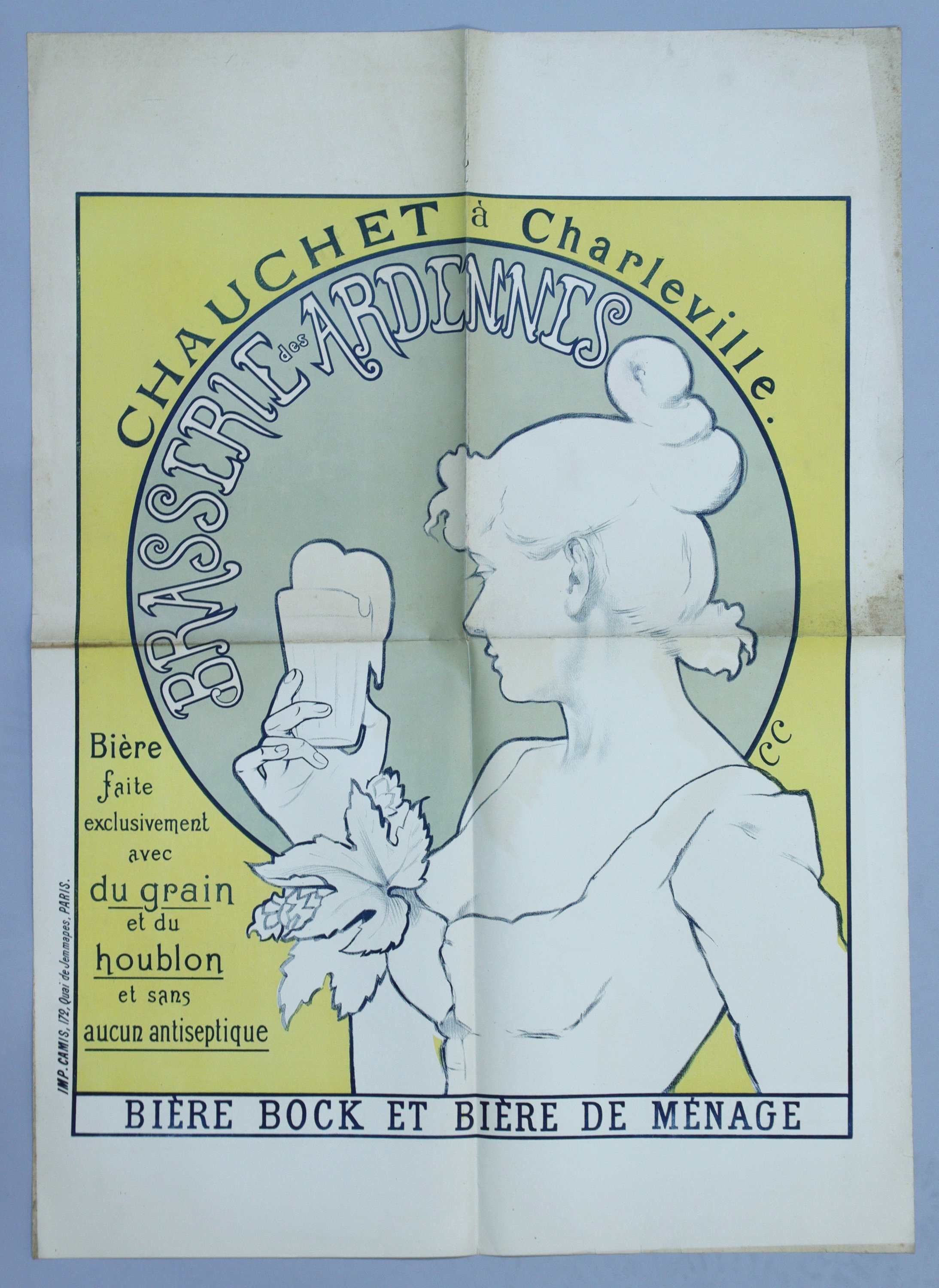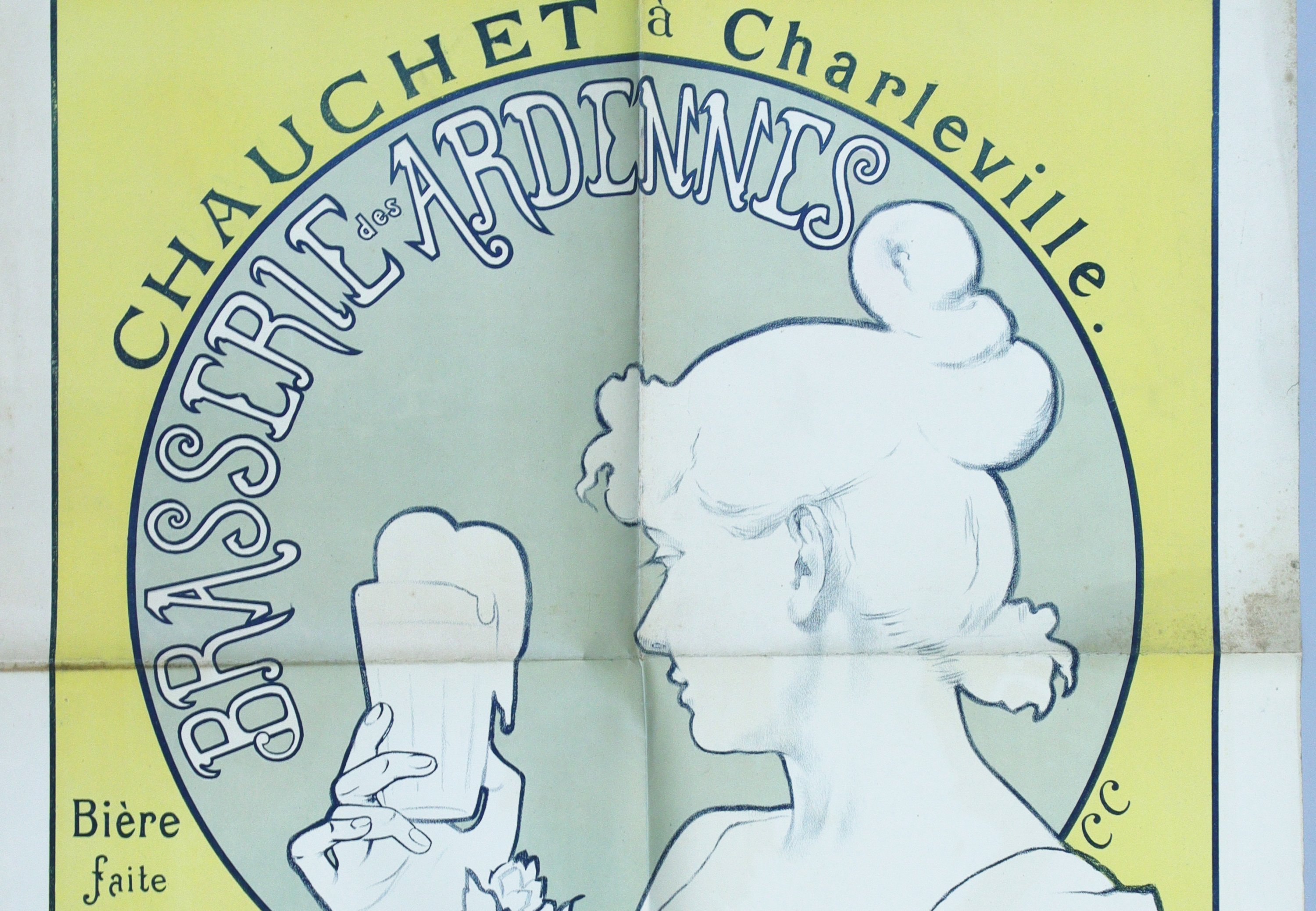 « BRASSERIE DES ARDENNES / Chauchet à Charleville / Bière Bock et Bière de ménage ». Vers 1895. Env. 92 x 66 cm (plis, petites déchirures en marge, qqs rousseurs/salissures). Bel exemplaire.