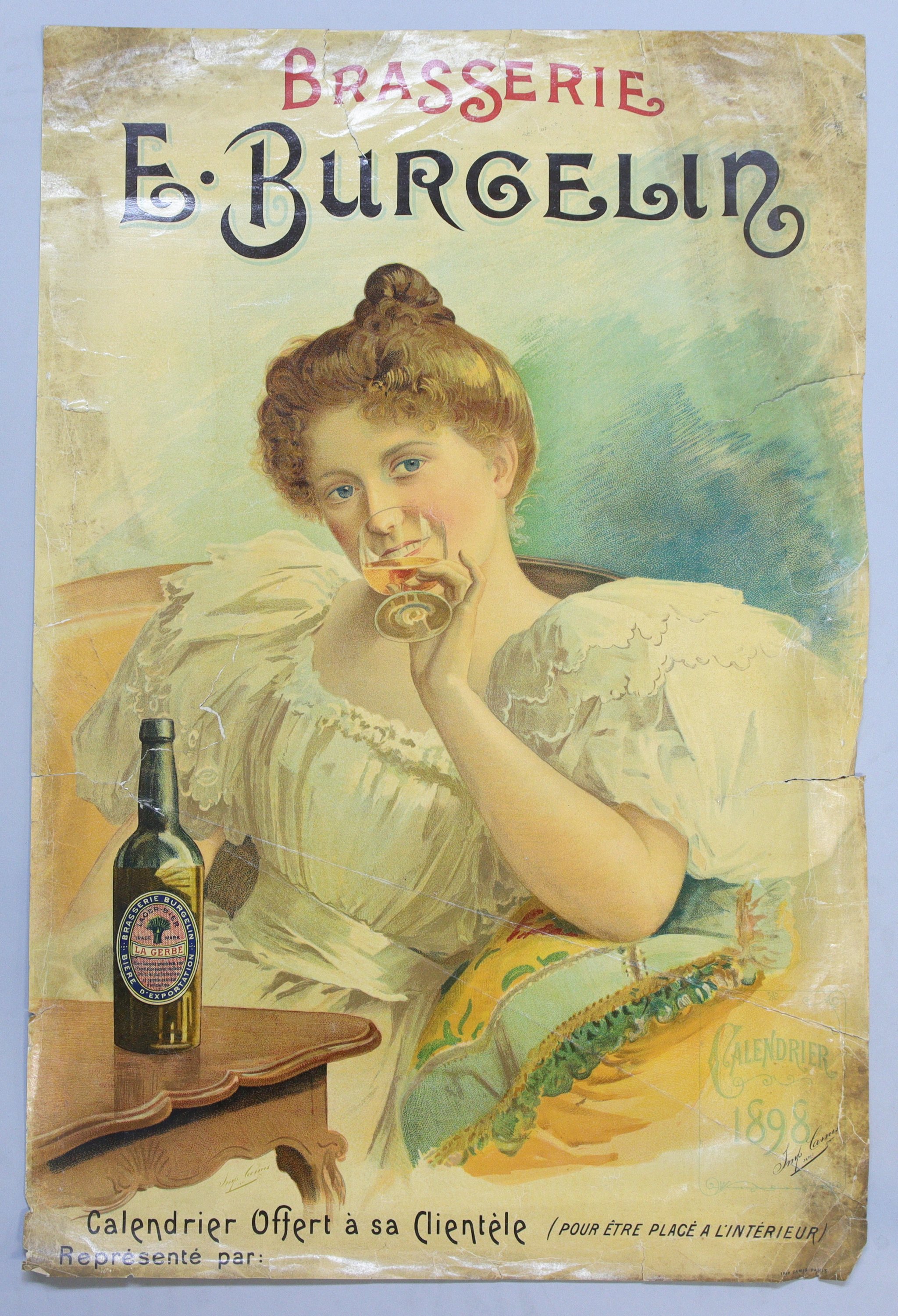 « BRASSERIE E. BURGELIN / Calendrier 1898 ». 59 x 40 cm. En létat (plis, déchirures, rousseurs/salissures).