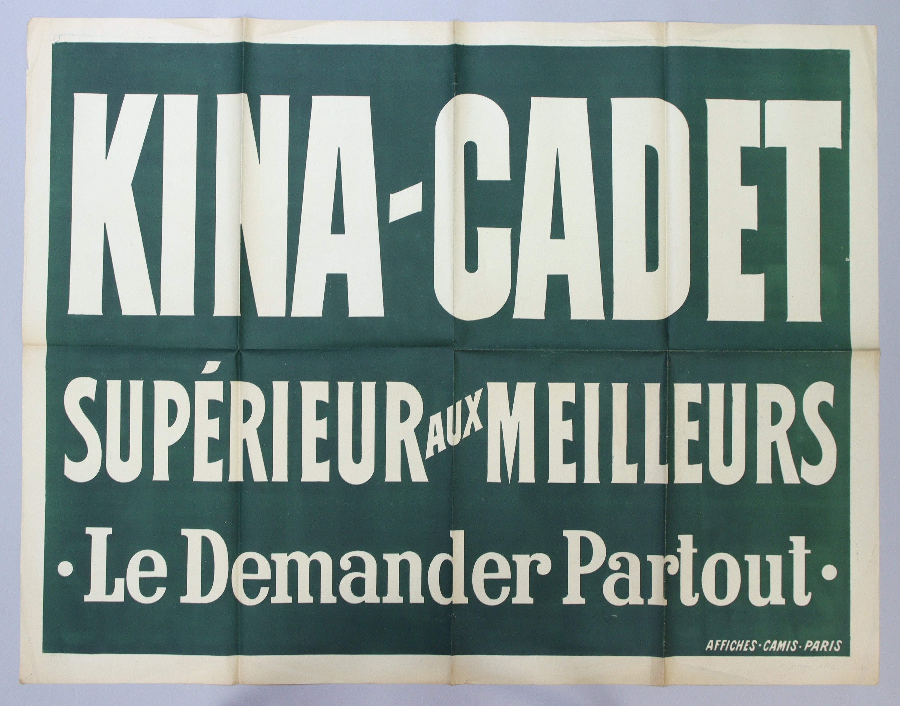 « KINA CADET / Supérieur aux meilleurs / Le demander partout ». Vers 1898. Env. 130 x 100 cm (plis, petites déchirures, rousseurs/salissures).