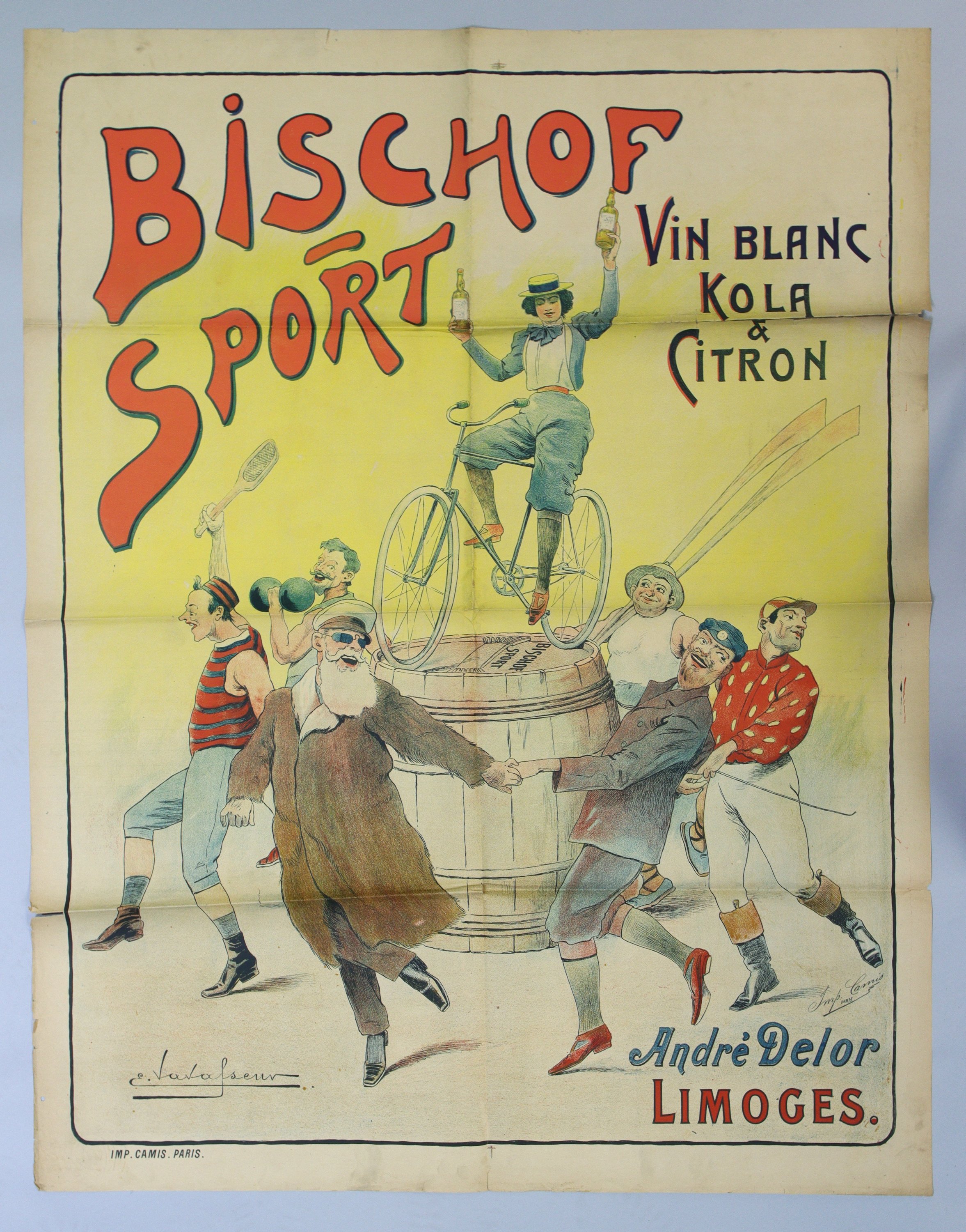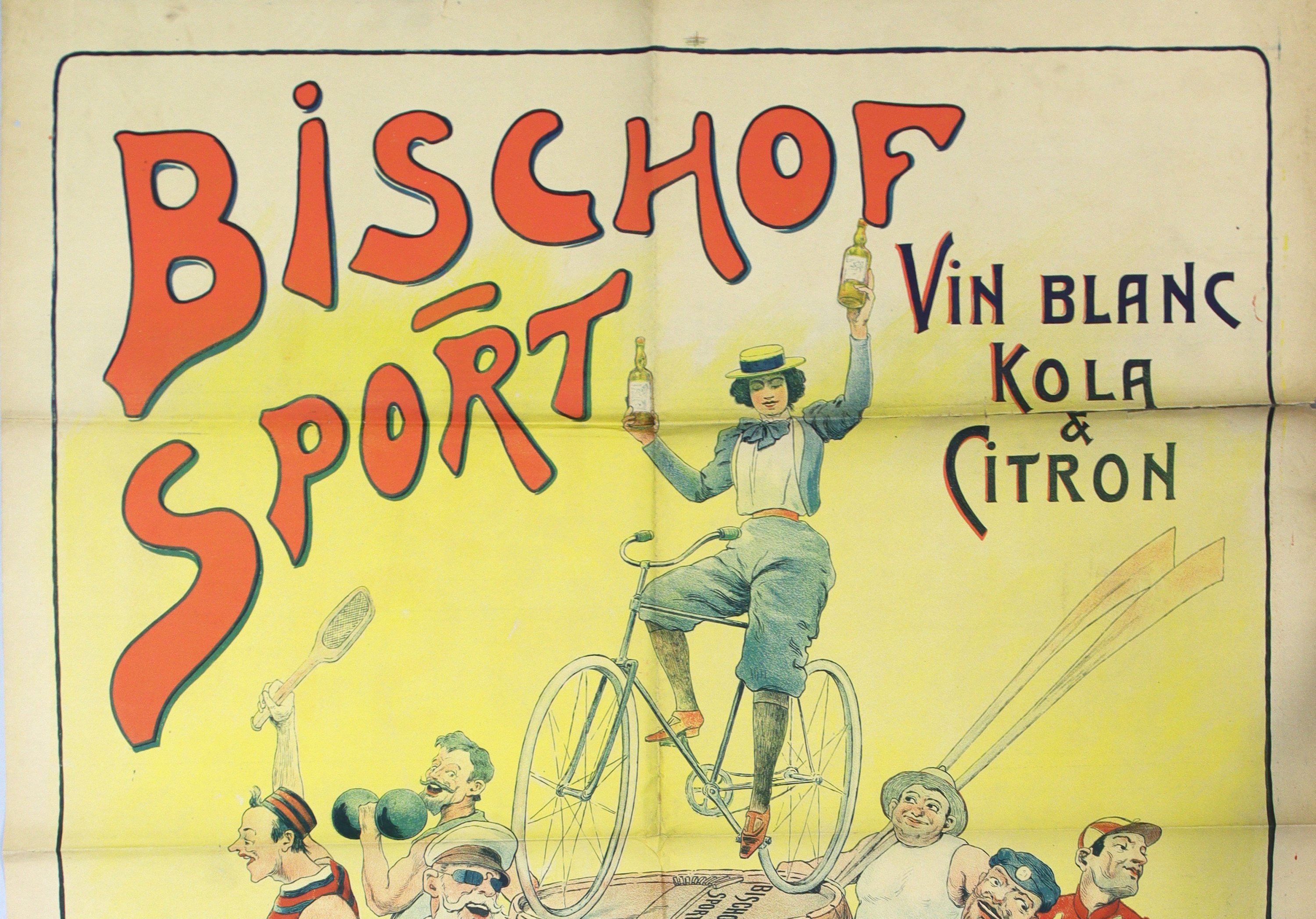 « BISCHOT SPORT / Vin blanc Kola & citron / André Delor Limoges ». Signée. Vers 1898. Env. 130 x 100 cm (plis, petites déchirures en marge, rousseurs/salissures) ;