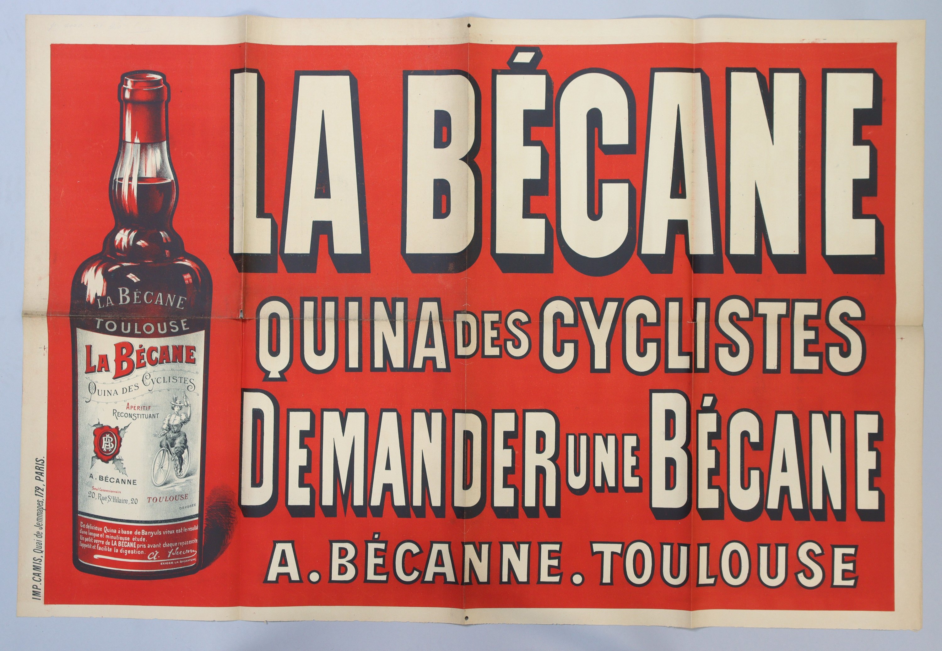 « LA BECANE / Quina des cyclistes / Demander une bécane / A. Bécanne Toulouse ». Vers 1898. Env. 80 x 120 cm (plis, rousseurs/salissures) ;