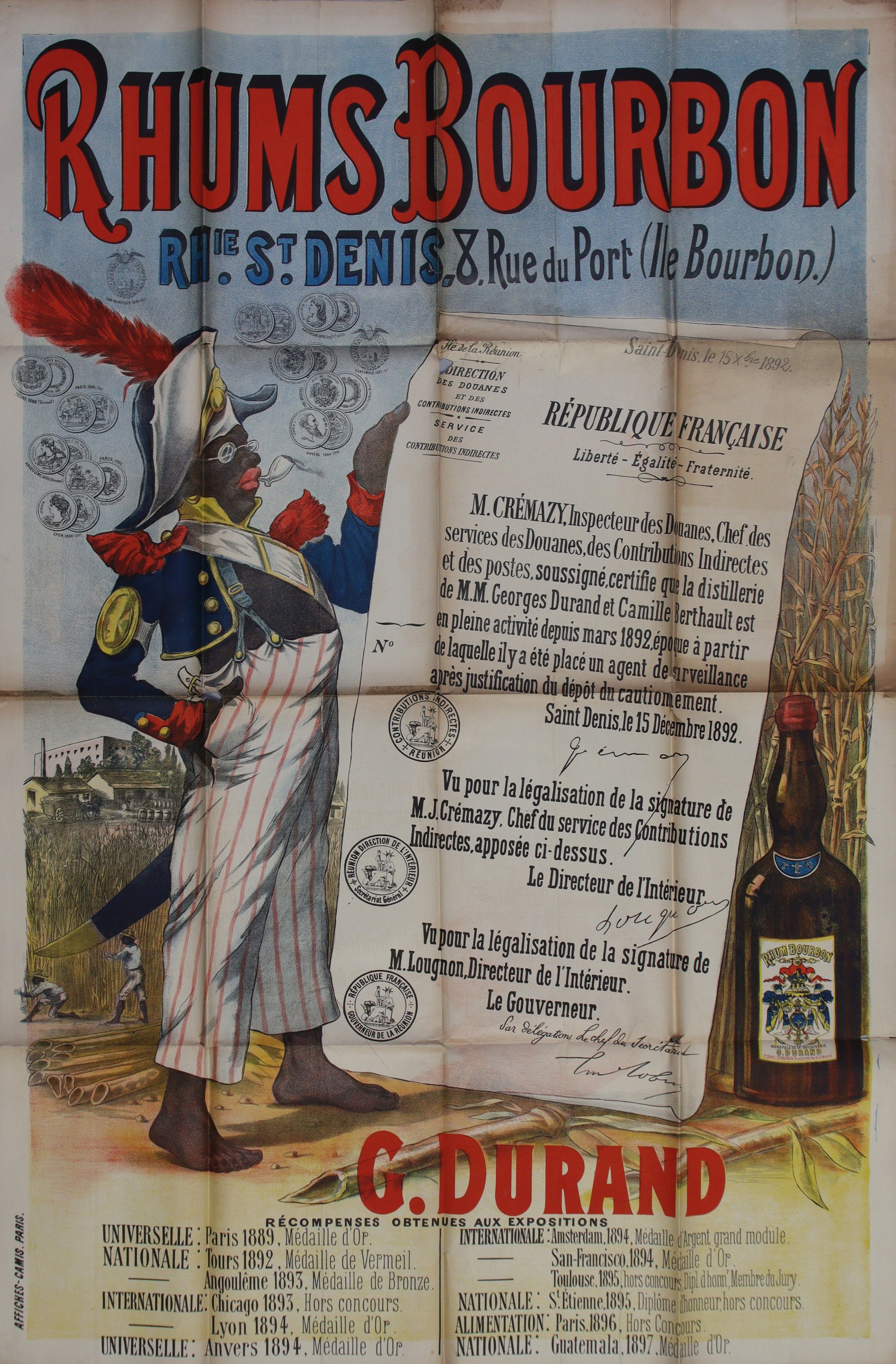 « RHUMS BOURBON / Rhie St Denis 8 rue du Port (Ile Bourbon) / G. Durand ». Vers 1898. Env. 200 x 129 cm (plis, petites déchirures et petits manques, rousseurs/salissures). Rarissime épreuve.