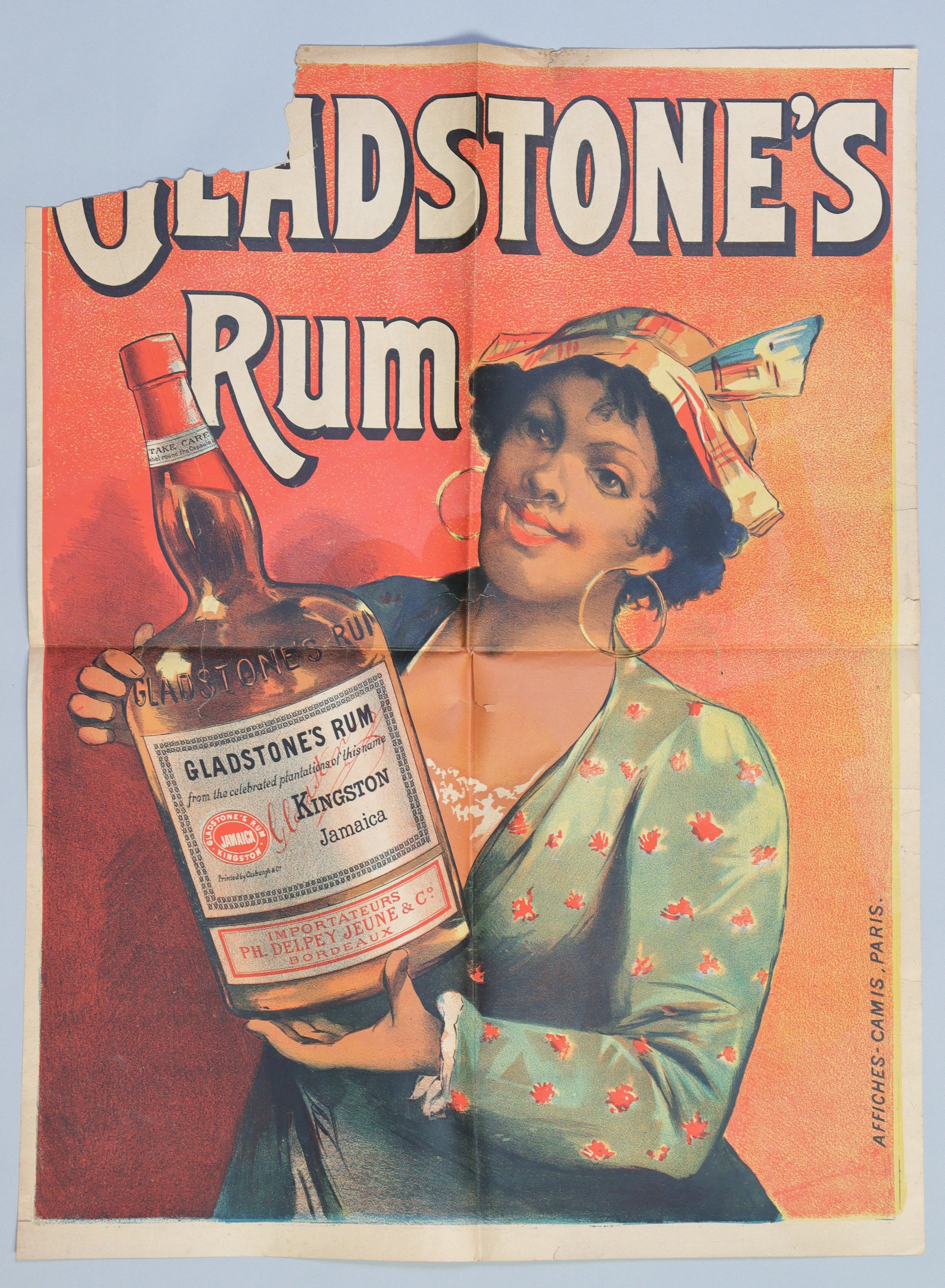 « GLADSTONES RUM ». Vers 1898. Env. 80 x 60 cm (plis, manque en haut à droite, déchirures, rousseurs/salissures).