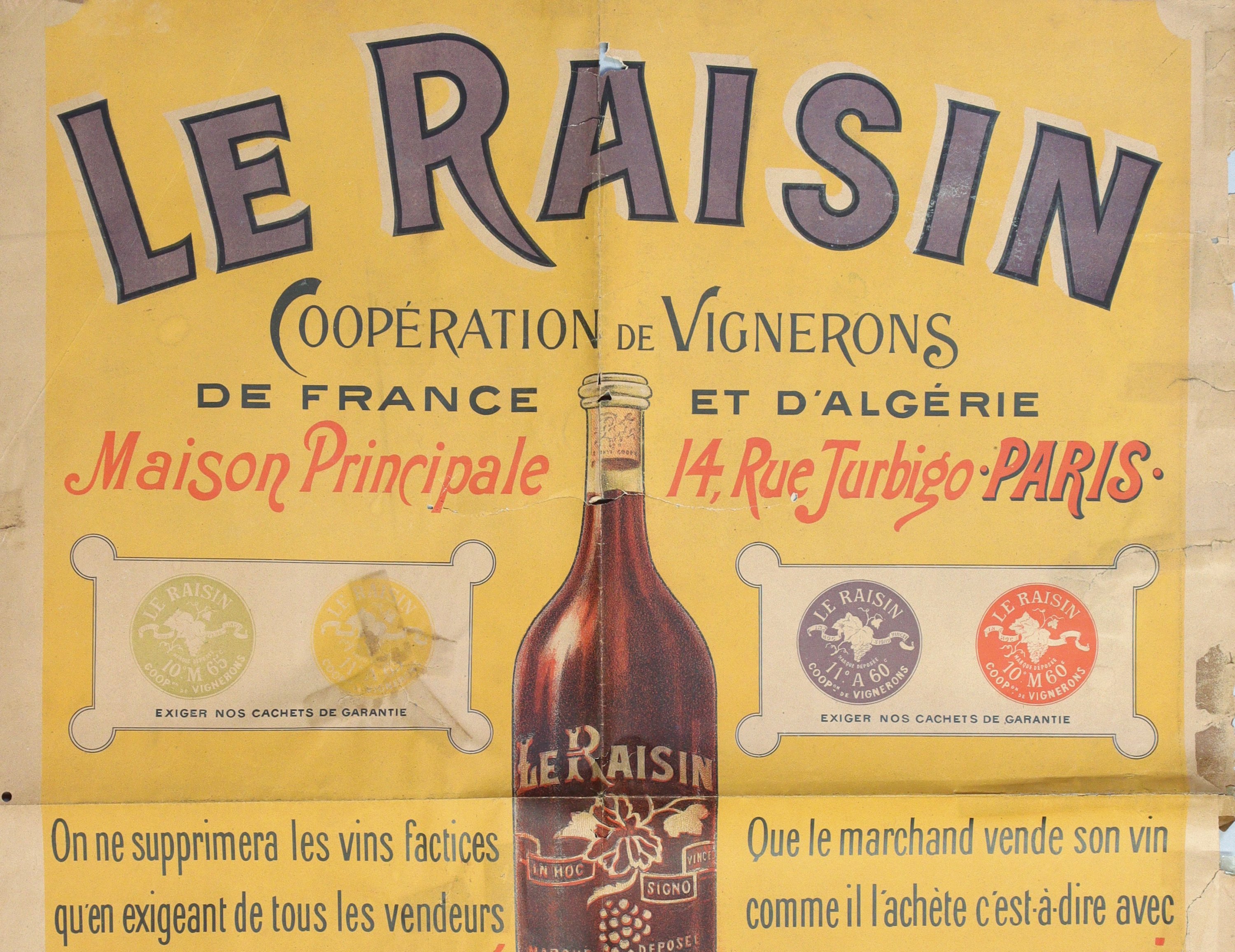 « LE RAISIN / Coopérative de vignerons de France et dAlgérie ». Signée. Vers 1898. Env. 80 x 60 cm. En létat (plis, déchirures, rousseurs/salissures, tâches) ;