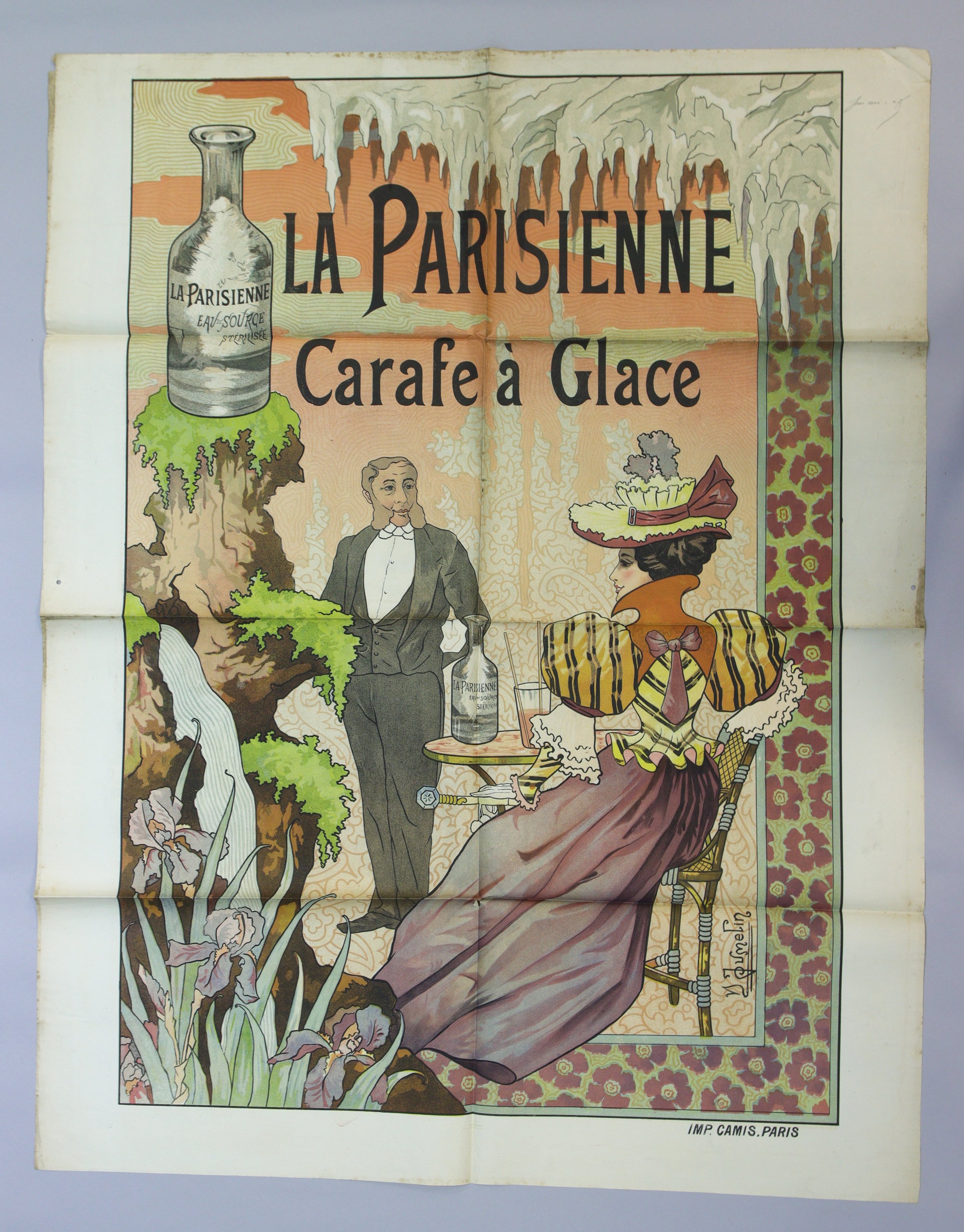« LA PARISIENNE / Carafe à leau / Eau de source stérilisée ». Signée. Vers 1898. Env. 130 x 100 cm (plis, petites déchirures, rousseurs/salissures) ;