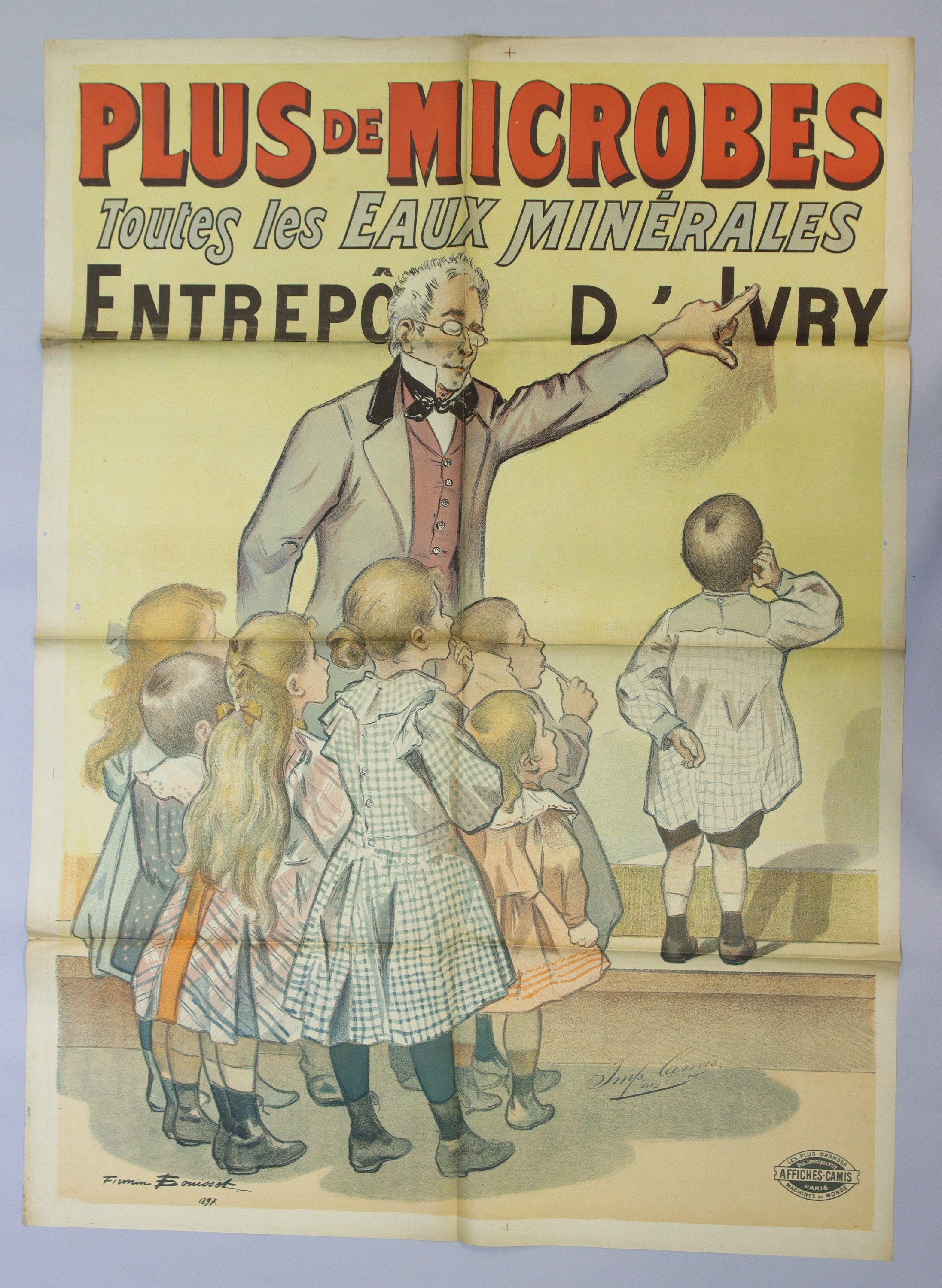 « Plus de microbes / Toutes les EAUX MINERALES : Entrepôt dIvry ». Signée et datée 1897. Env. 140 x 100 cm (plis, qqs petites déchirures, rousseurs/salissures) ;