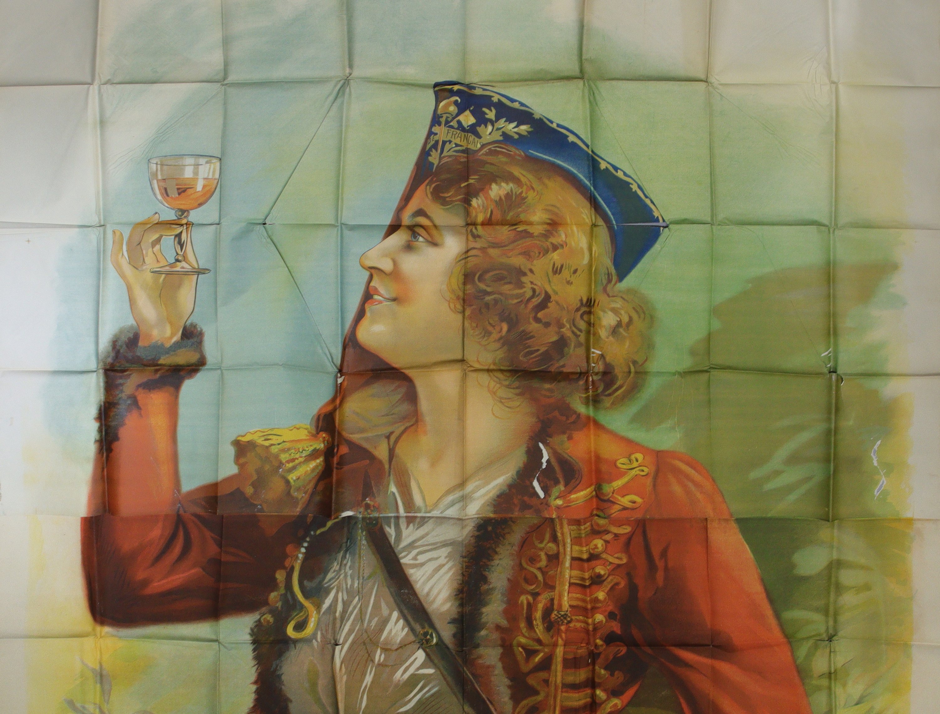 Delna la vivandière [Le vin Désiles]. Affiche avant la lettre. Signée. Vers 1898. Rarissime épreuve grand format en deux parties, imprimée sur « la plus grande machine du monde » de l’époque, env. 300 x 248 cm. En l’état (plis, déchirures, rousseurs/salissures).