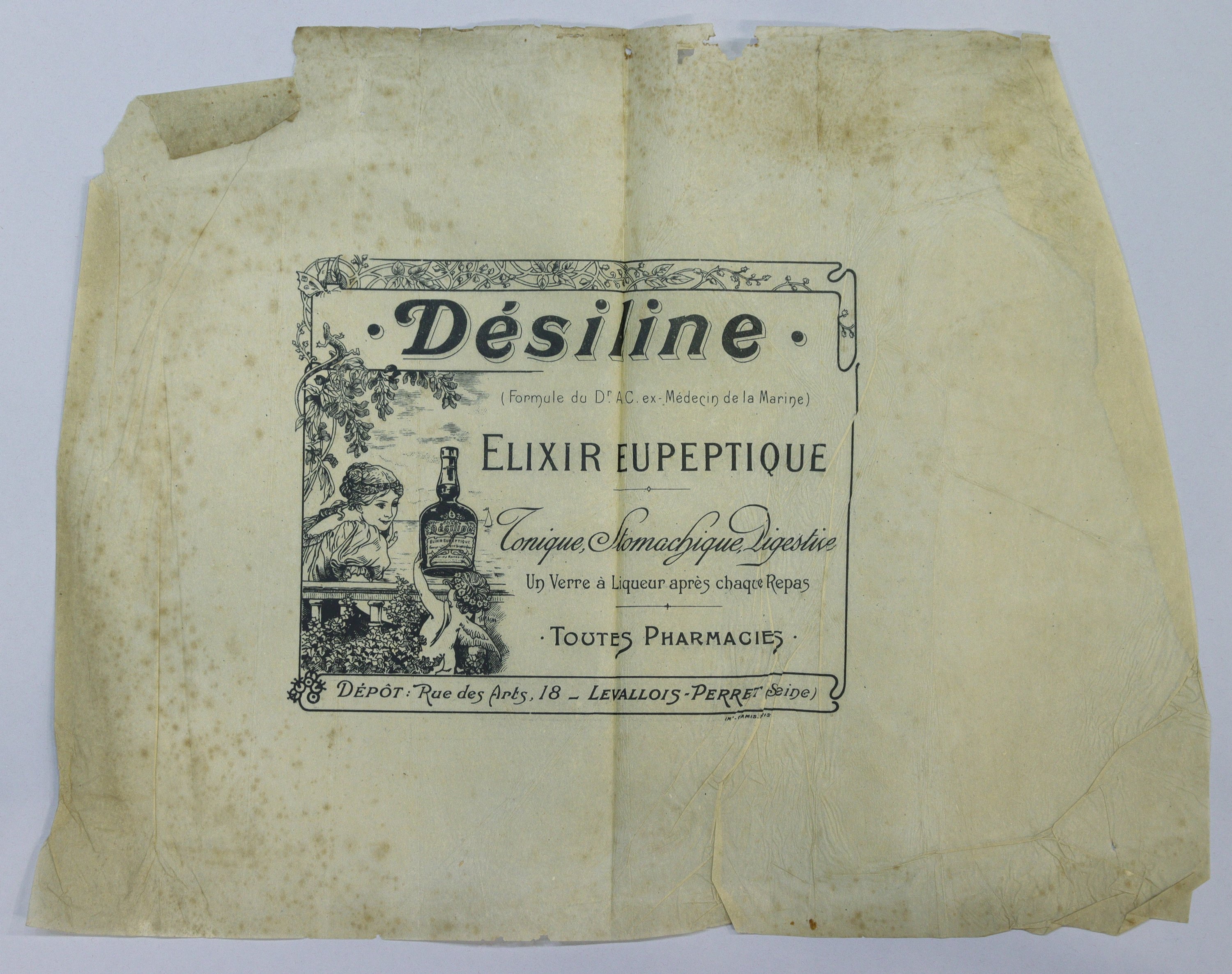 « Désiline / (Formule du Dr AC ex-Médecin de la Marine) / Elixir eupeptique / Tonique, stomachique, digestive / Un verre à la liqueur après chaque repas ». Vers 1895. Env. 37 x 46 cm (plis, rousseurs).
