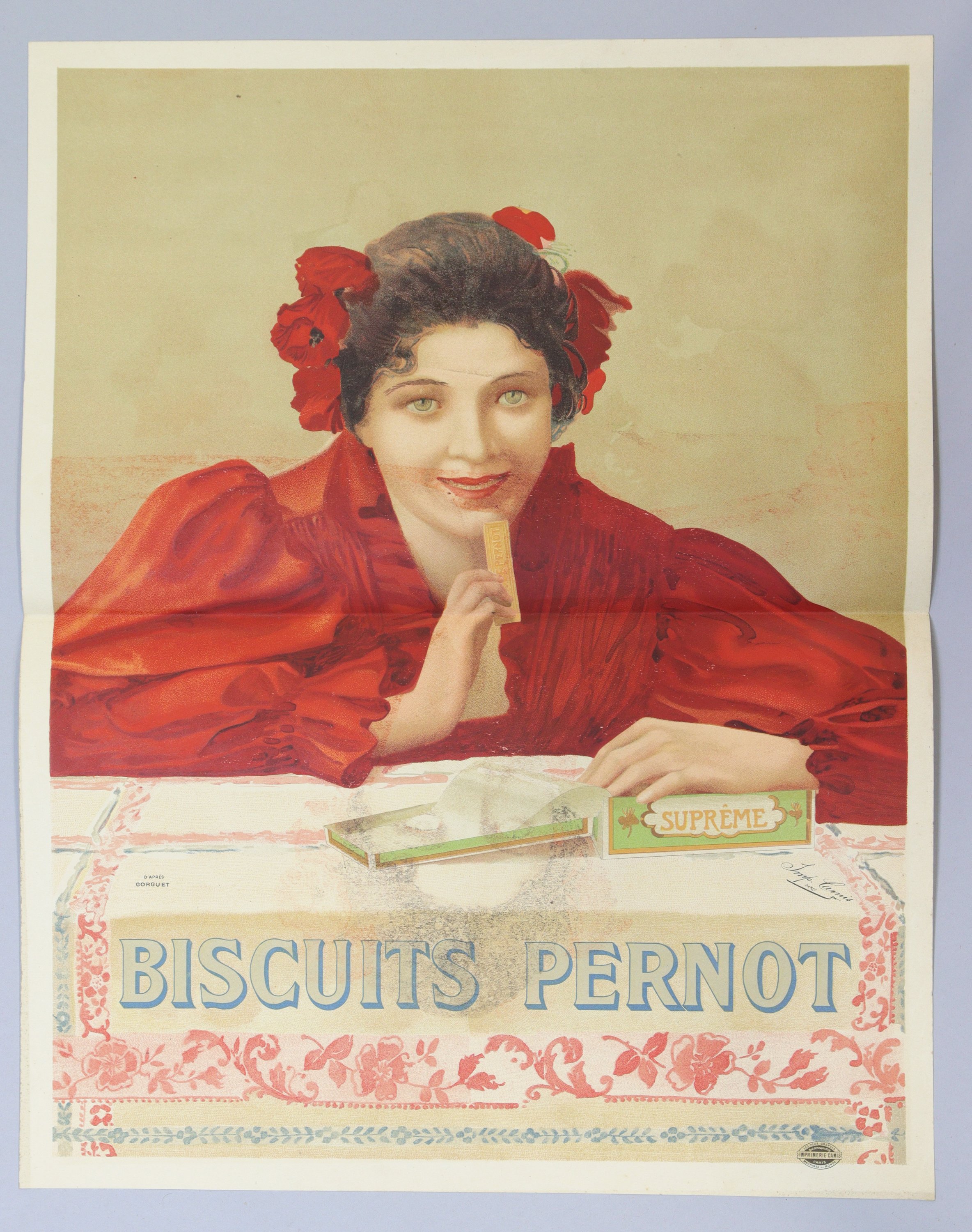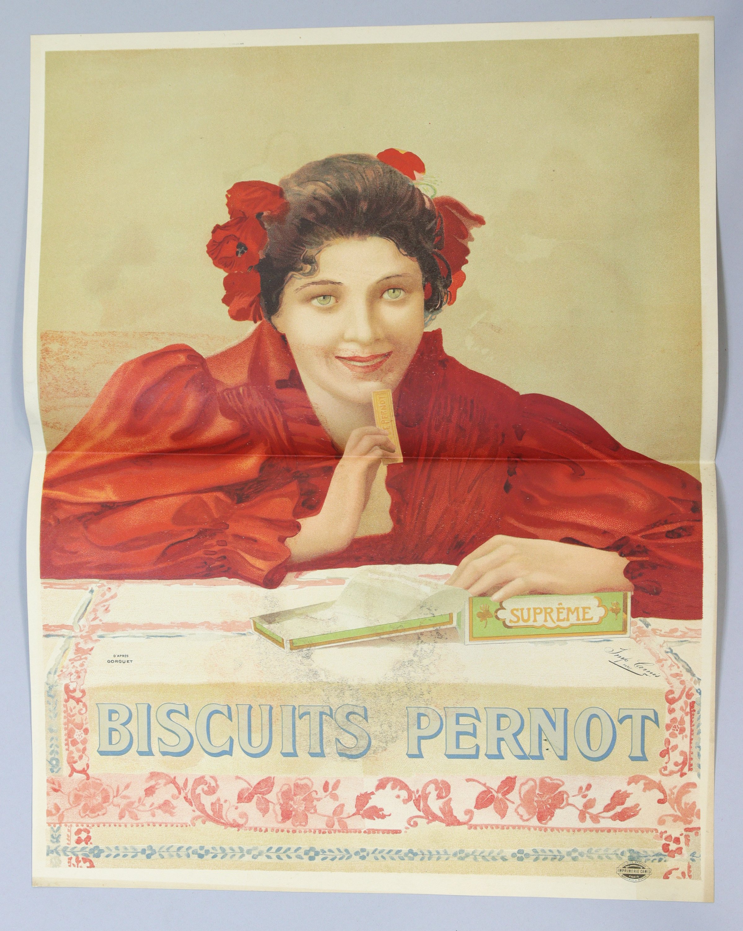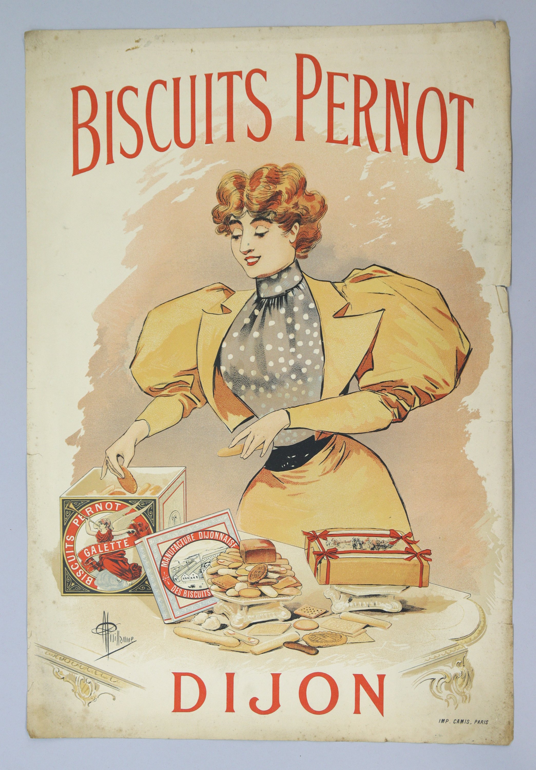 « BISCUIT PERNOT / DIJON ». Signée. Vers 1898. 53,5 x 36,5 cm (plis, petites déchirures, rousseurs/salissures).