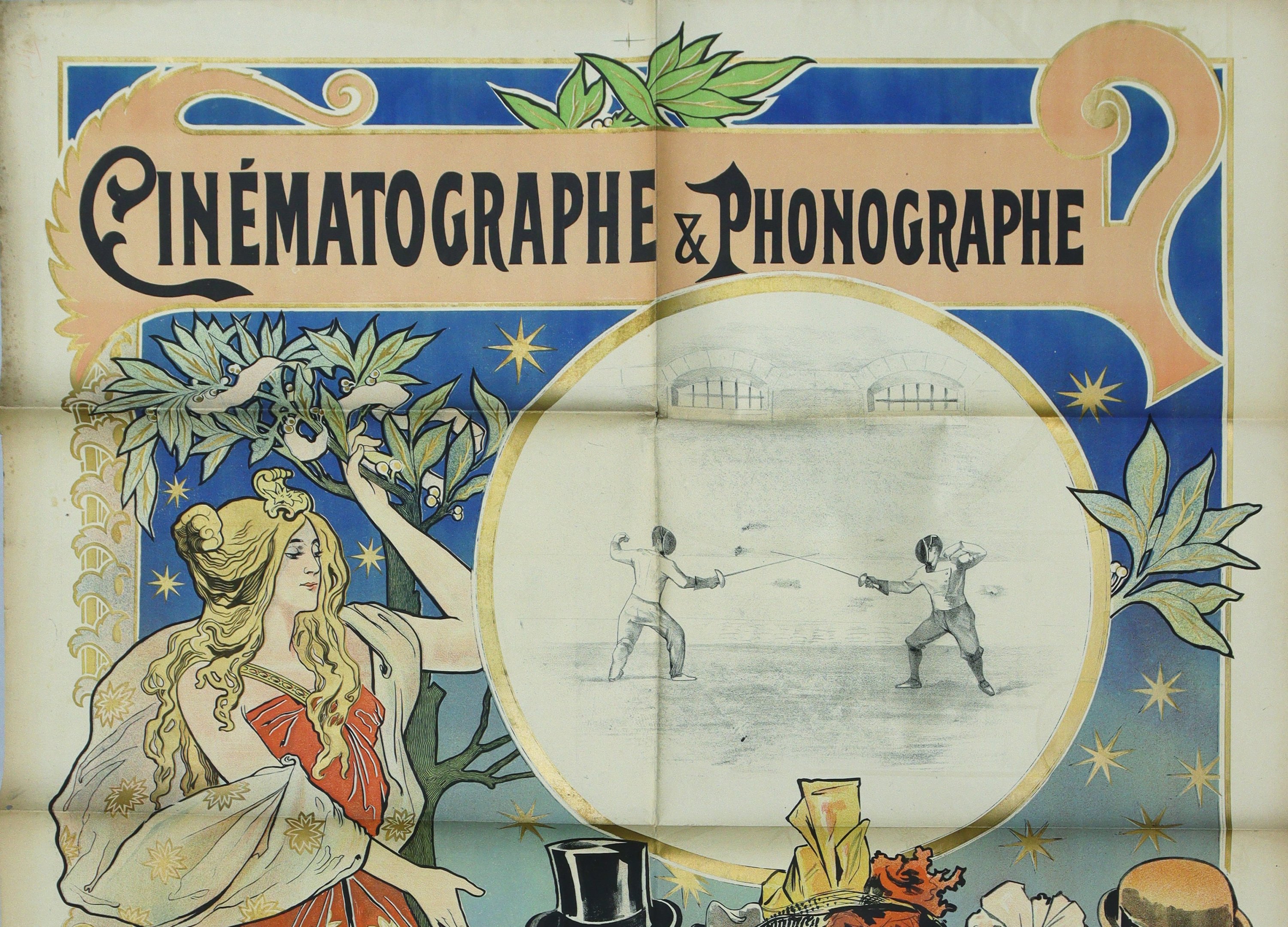 « CINEMATOGRAPHE & PHONOGRAPHE ». Signée. [1899]. Epreuve originale imprimée en couleurs, non entoilée. Env. 130 x 100 cm (plis, petites déchirures, rousseurs/salissures).