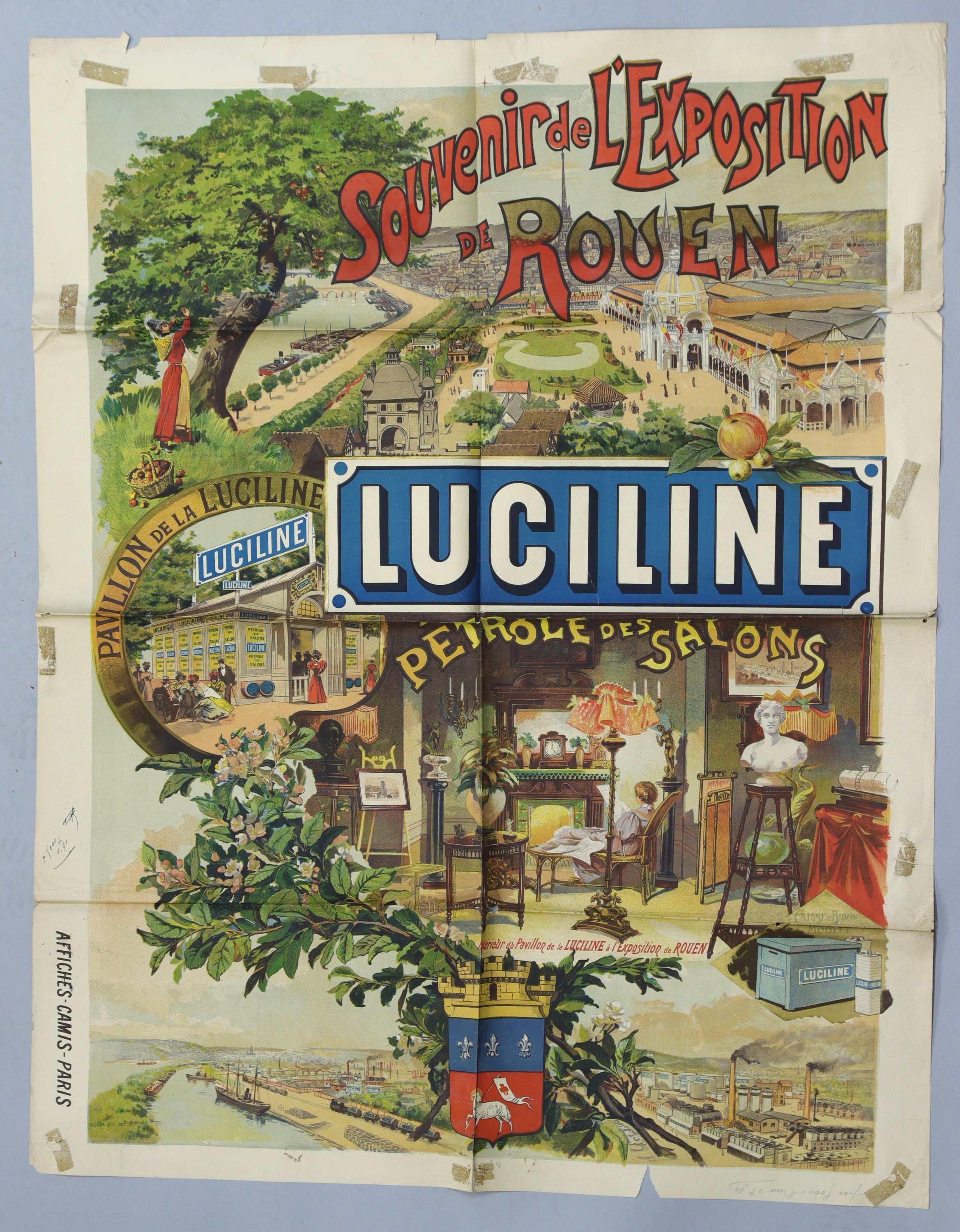 « Souvenir de l’exposition de Rouen / LUCILINE pétrole des salons ». [1896]. Env. 130 x 100 cm. En l’état (plis, déchirures, manques, rousseurs/salissures).