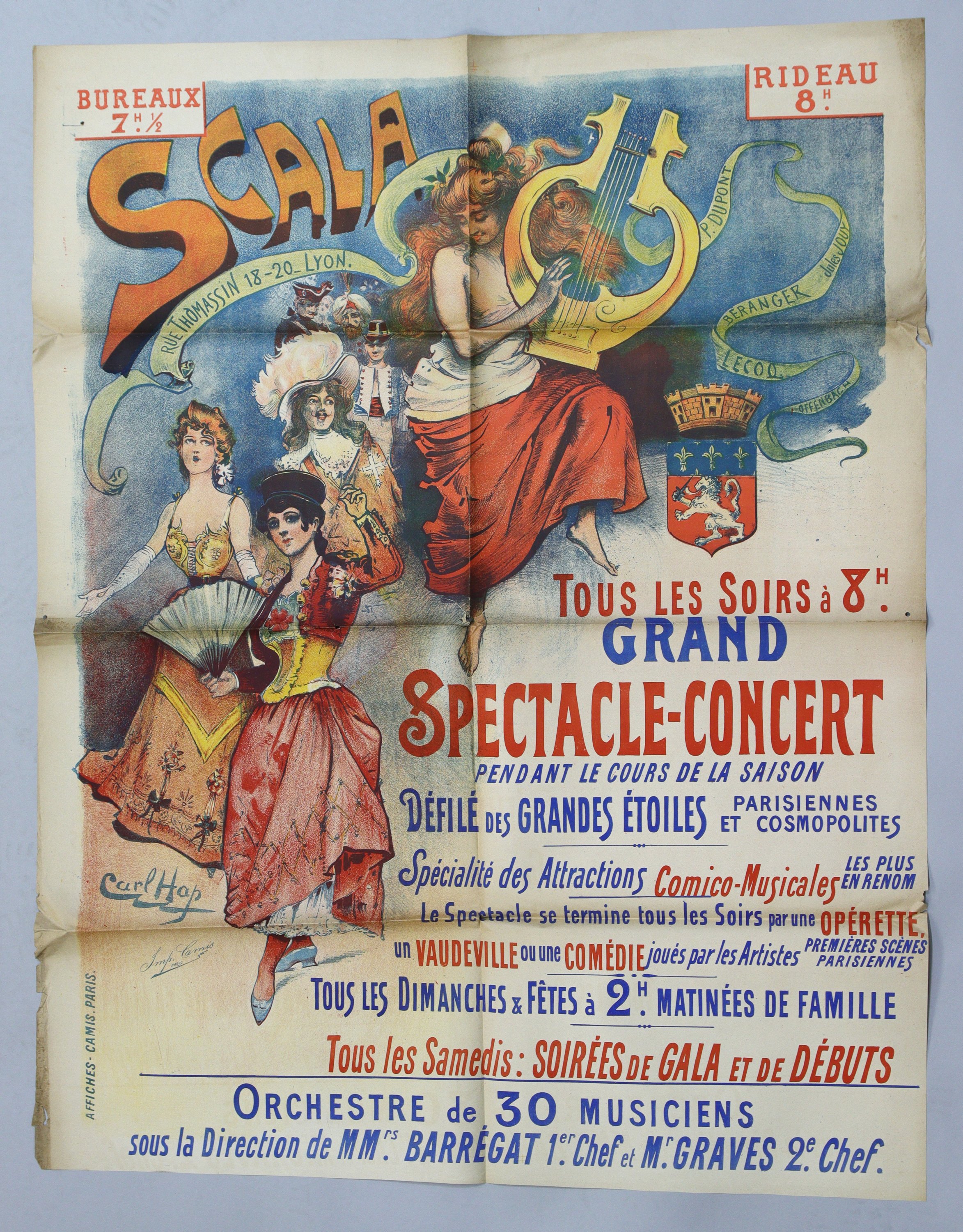 « SCALA / Rue Thomassin, 18-20, Lyon / Grand spectacle concert ». Signée. Vers 1898. Env. 130 x 100 cm. (plis, petites déchirures, rousseurs/salissures) ;