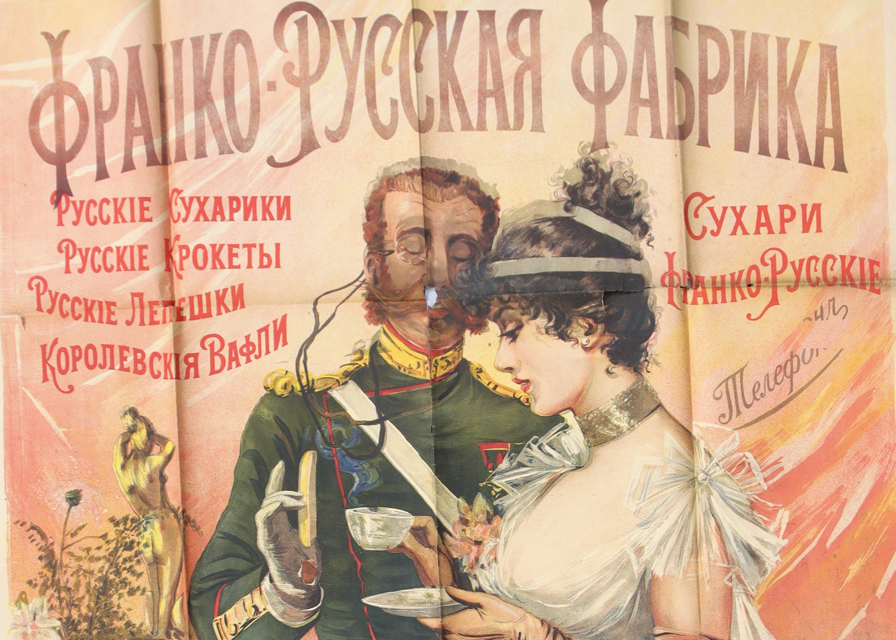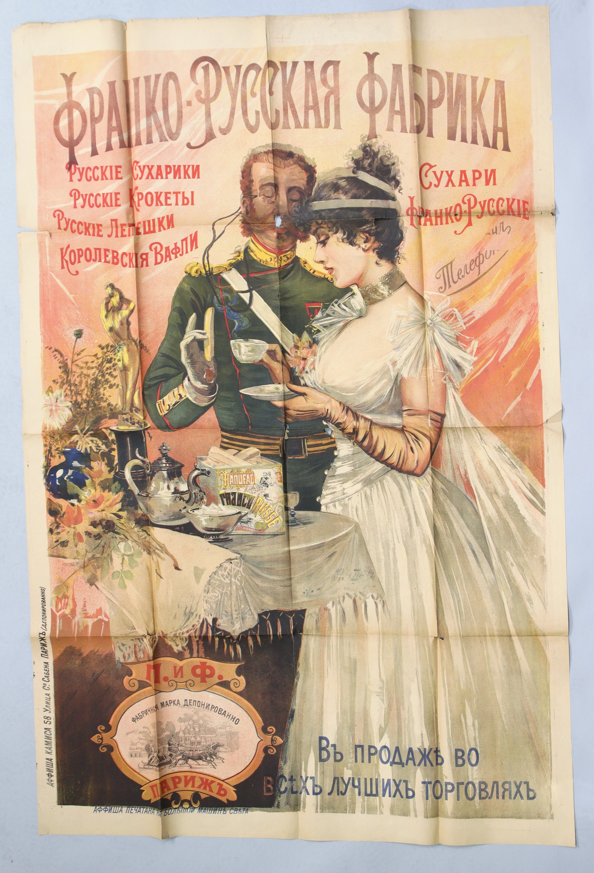 « [Manufacture franco-russe] / [Biscuits russes, Croquettes russes, Galettes russes, royale gaufrette inondés] [Paris] ». Texte en russe. Vers 1898. Env. 190 x 124 cm (plis, petites déchirures, rousseurs/salissures) ;