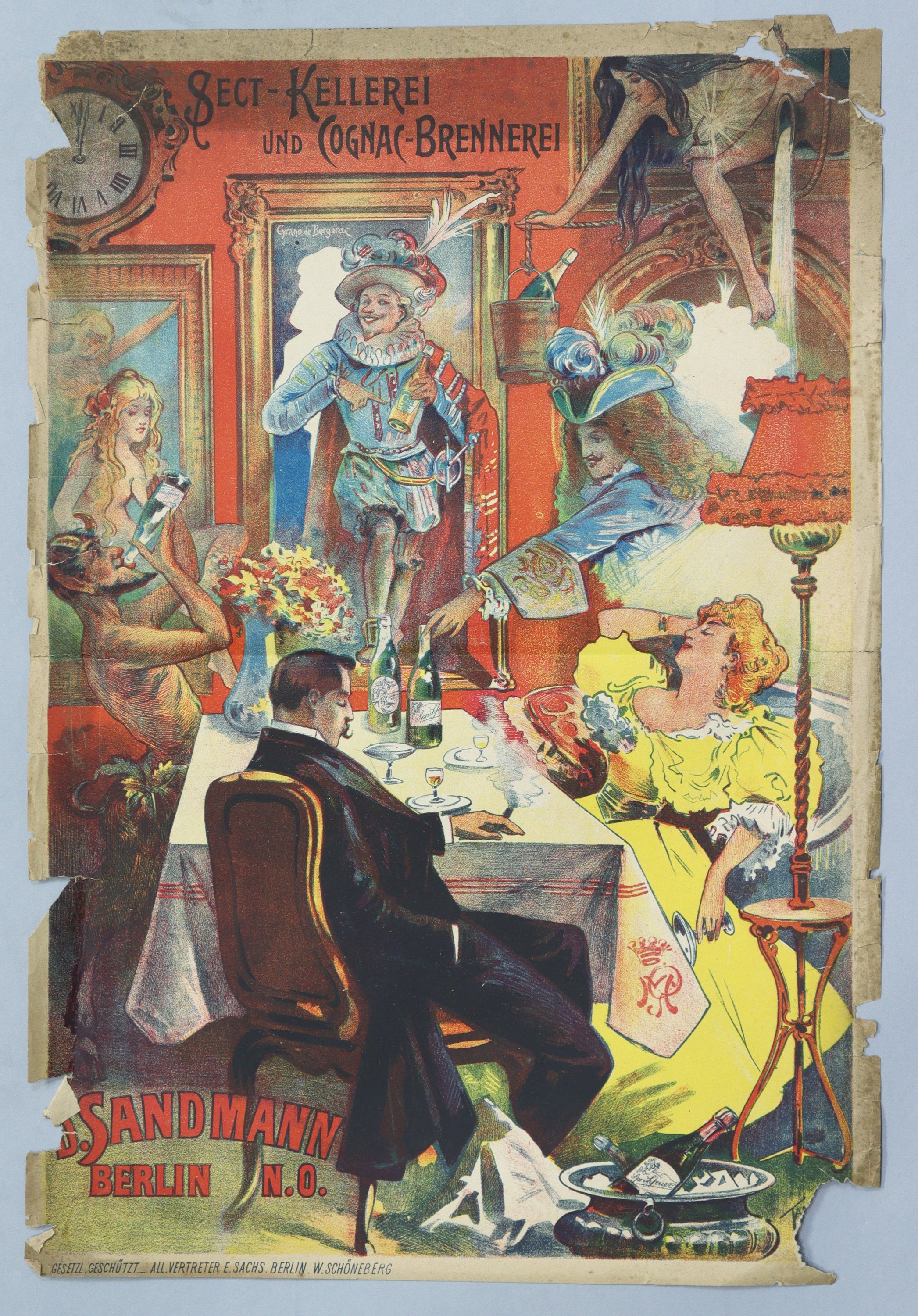 « SECT. KELLEREI UND COGNAC-BRENNEREI / D. SANDMANN Berlin ». Signée. Vers 1898. Env. 56 x 37,5 cm. En l’état (plis, manques, déchirures, rousseurs/salissures).