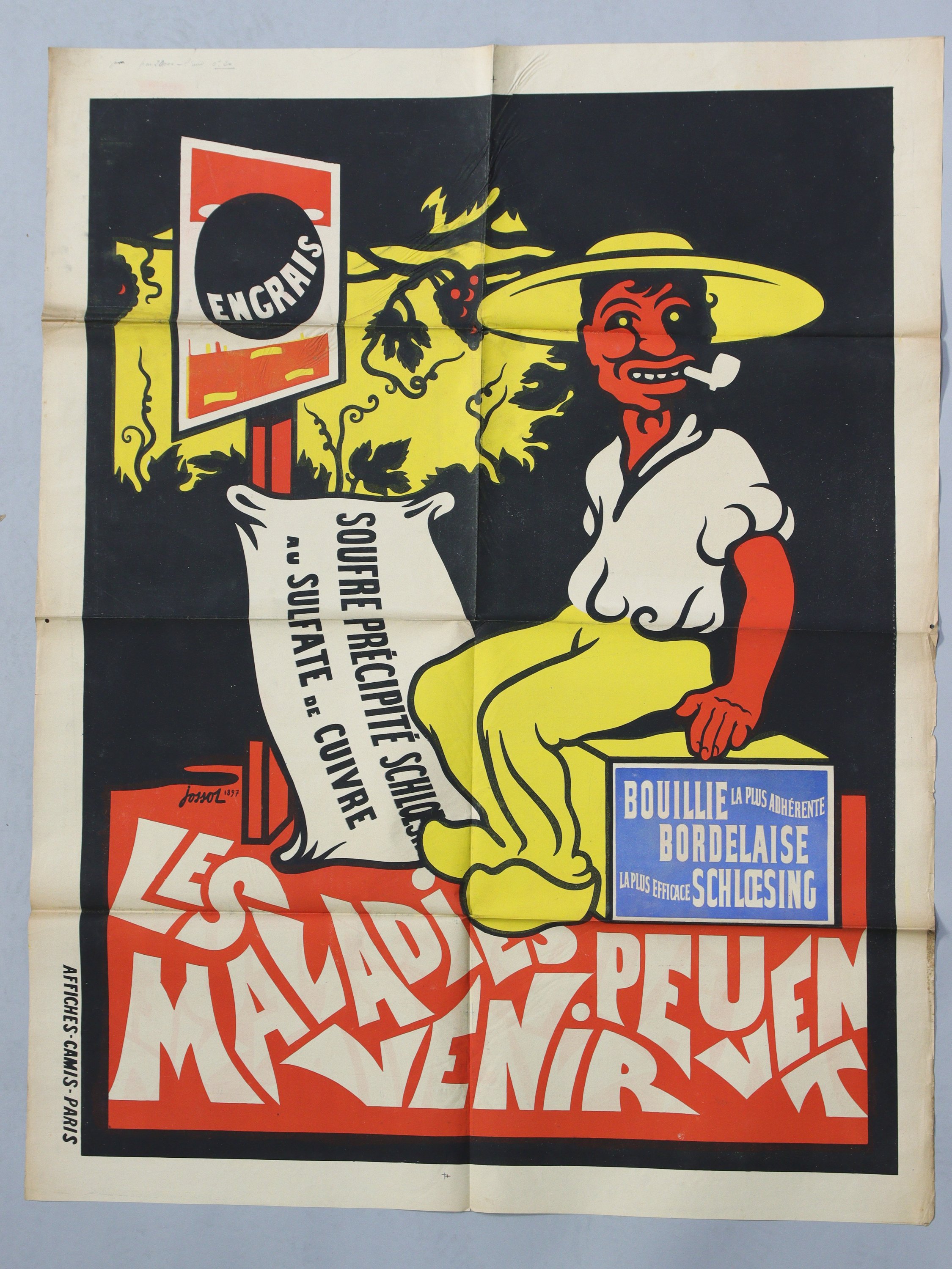 « ENGRAIS / Les MALADIES PEUVENT VENIR / Bouillie bordelaise Schloesing ». Signée et datée 1897. Env. 130 x 100 cm (plis, petites déchirures, rousseurs/salissures) ;