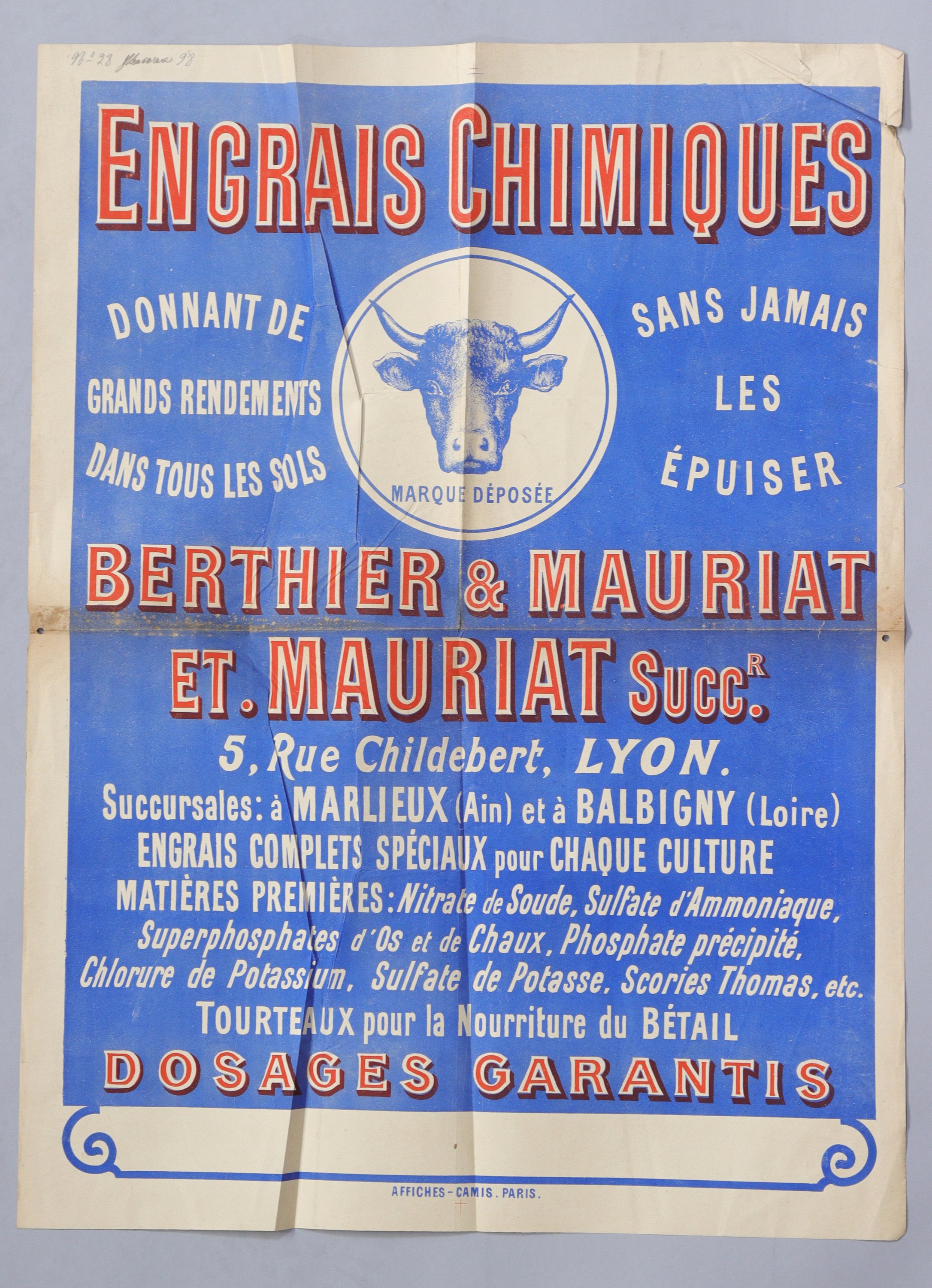 « ENGRAIS CHIMIQUES BERTHIER & MAURIAT / 5 rue Childebert Lyon ». Vers 1898. Env. 79 x 57,5 cm (plis, petites déchirures, rousseurs/salissures) ;