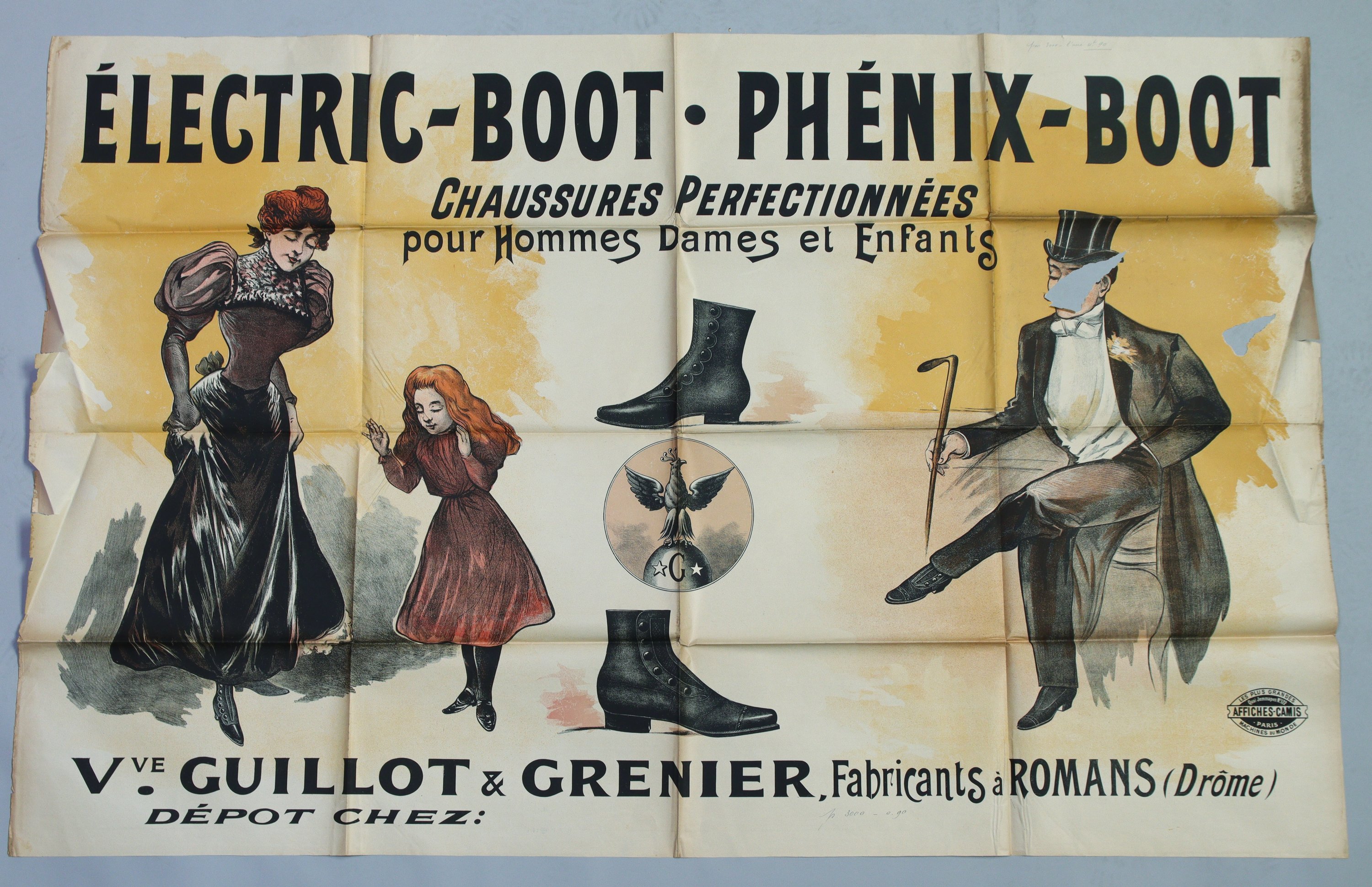 « Electric boot - Phénix boot / chaussures perfectionnées pour hommes, dames et enfants / Vve Guillot & Grenier fabricants à St Romans (Drôme) » Vers 1898. Env. 200 x 129 cm. En létat (plis, déchirures, manques, rousseurs/salissures)