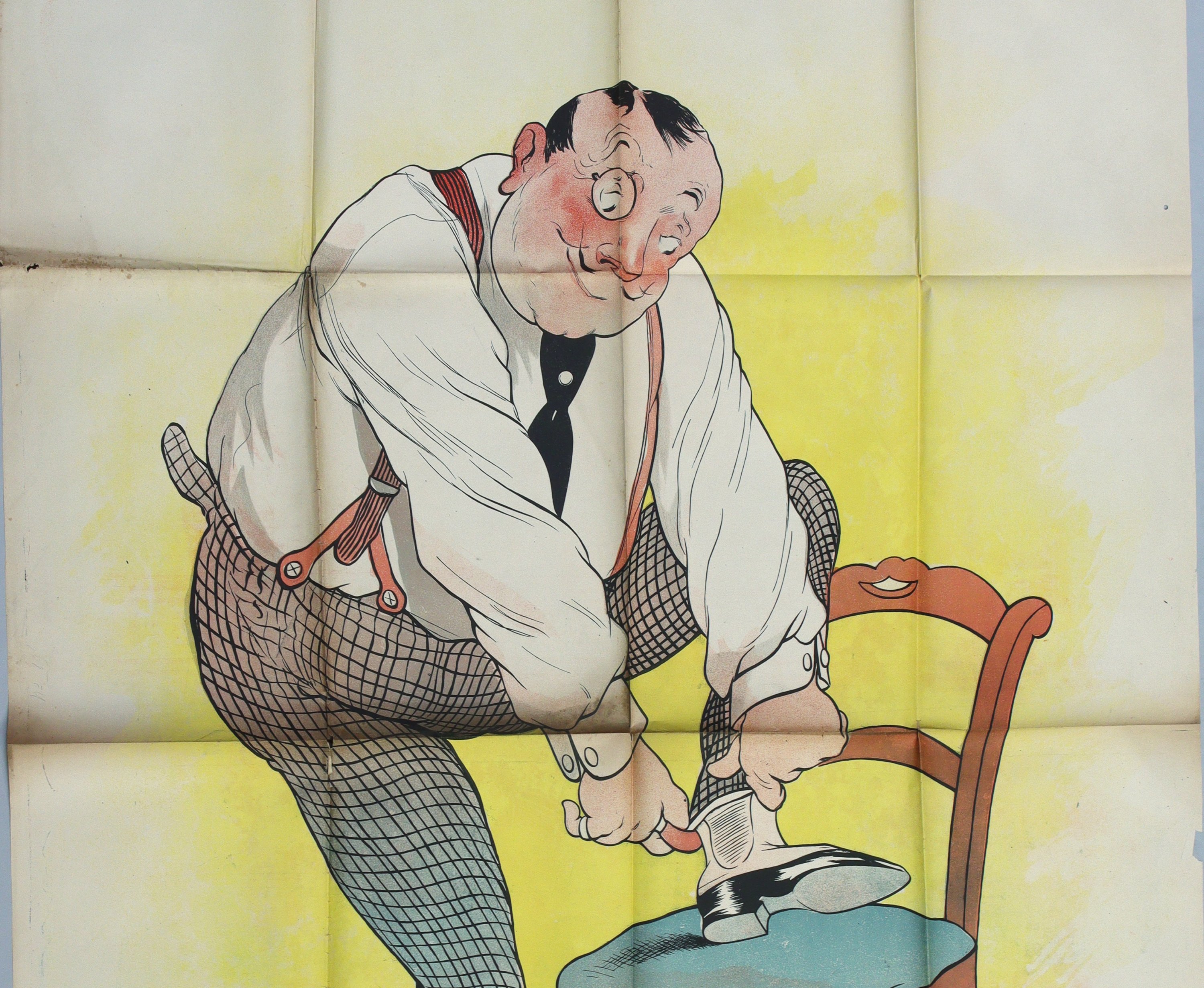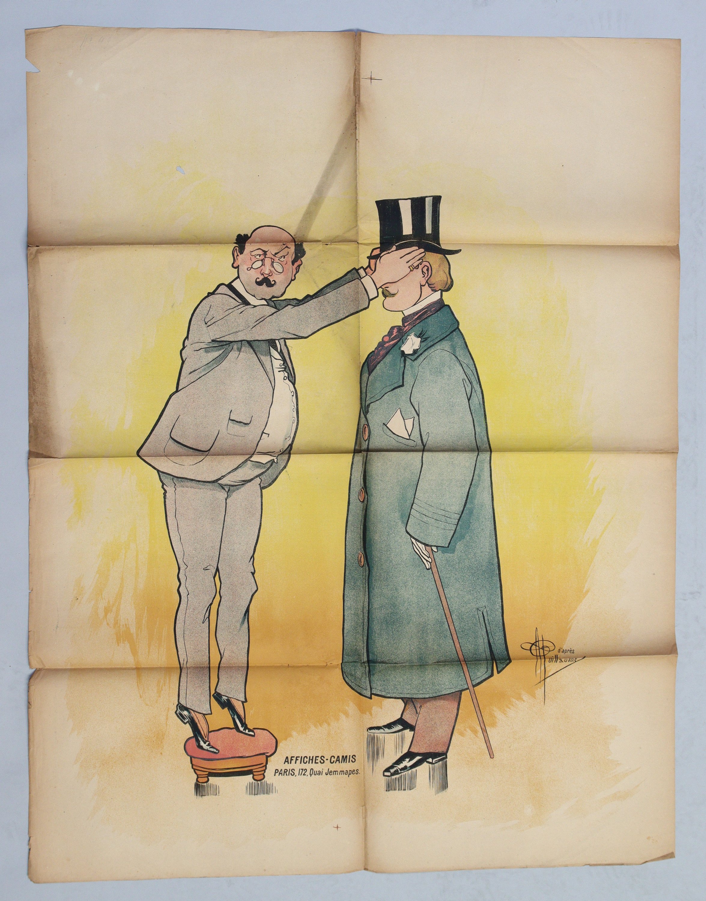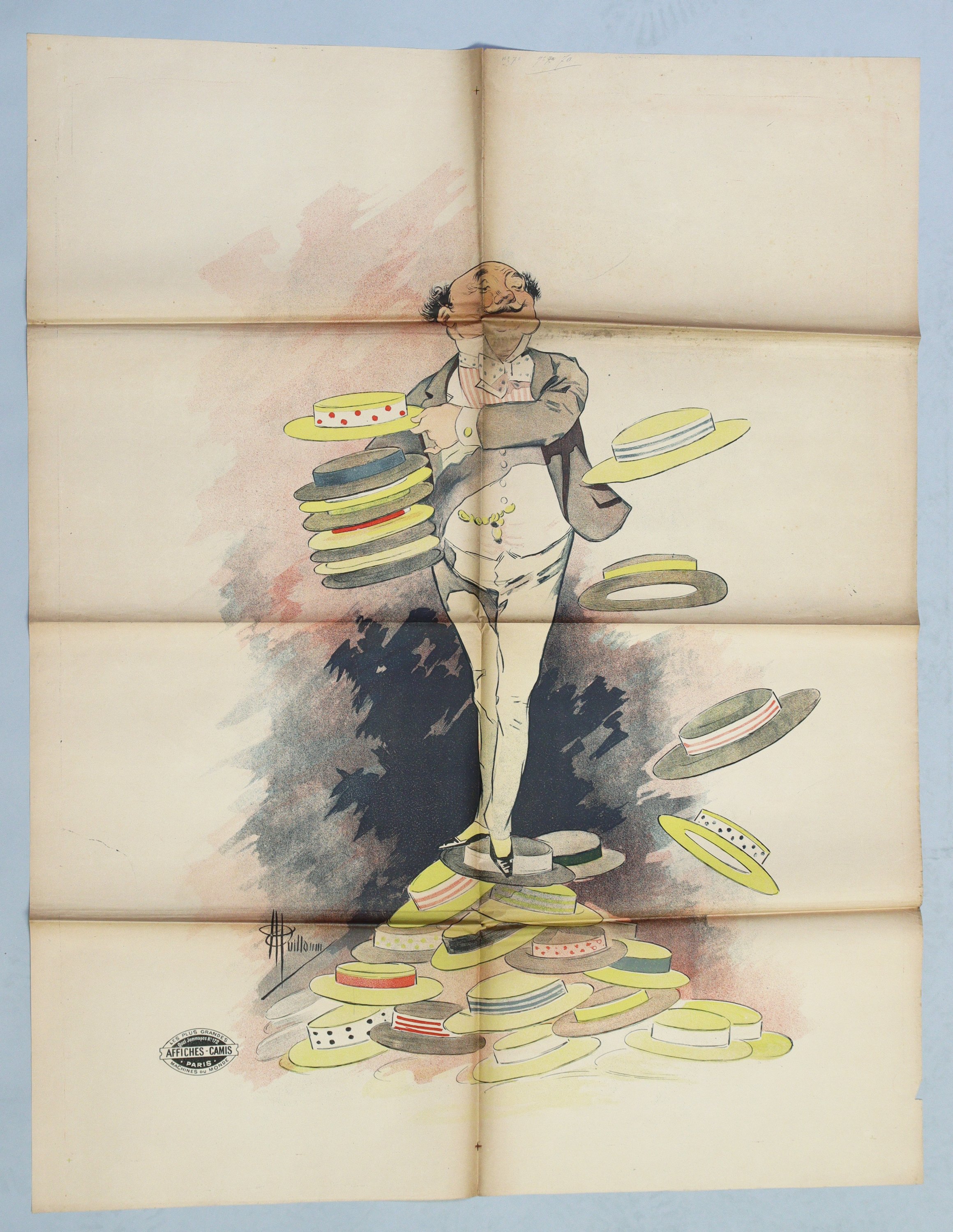 Homme trônant sur une pile de chapeaux. Signée. Vers 1898. Env. 130 x 100 cm (plis, petites déchirures, rousseurs/salissures).