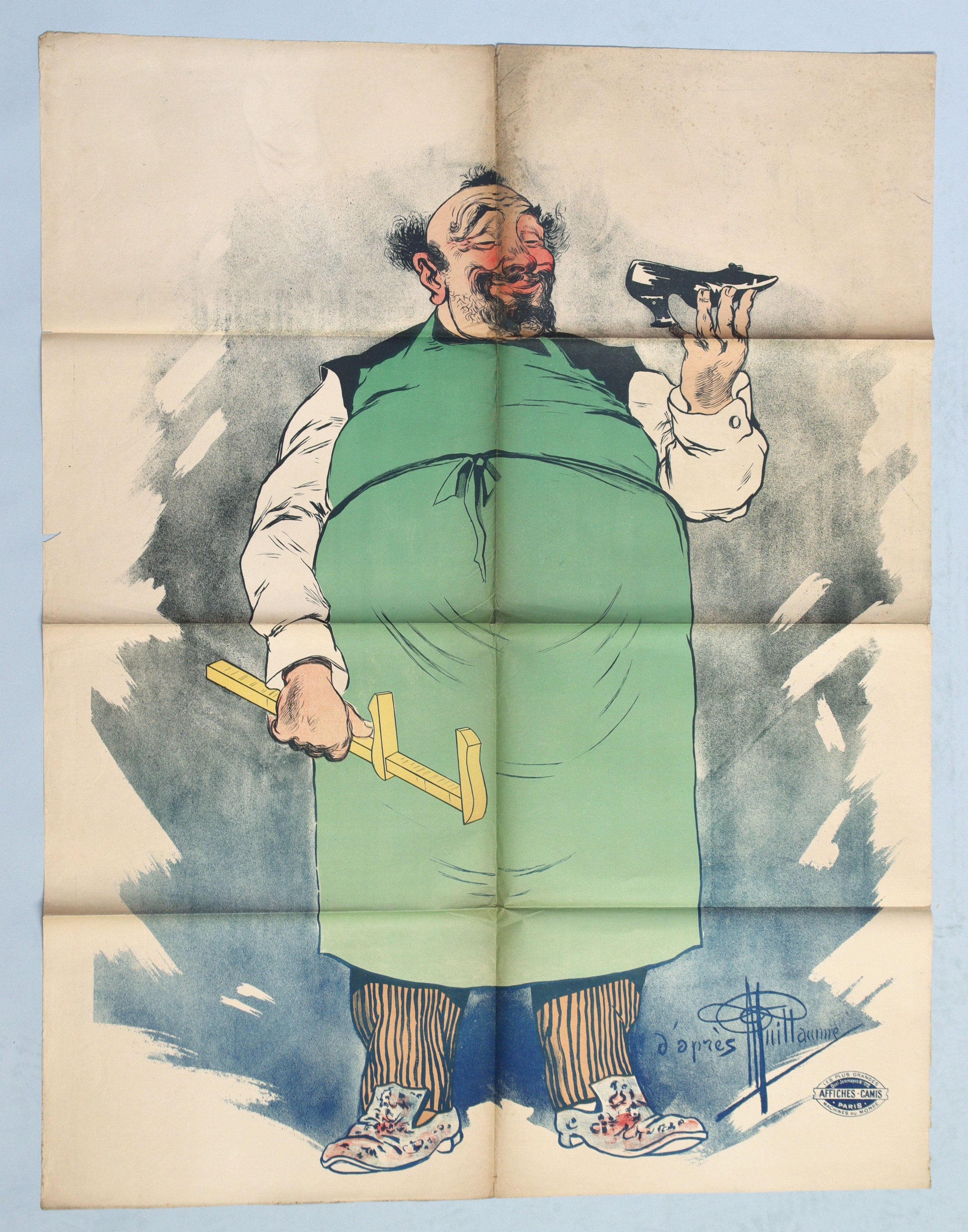 Homme présentant une paire de chaussures. Signée. Vers 1898. Env. 190 x 124cm (plis, déchirures, petits manques en marge, rousseurs/salissures).