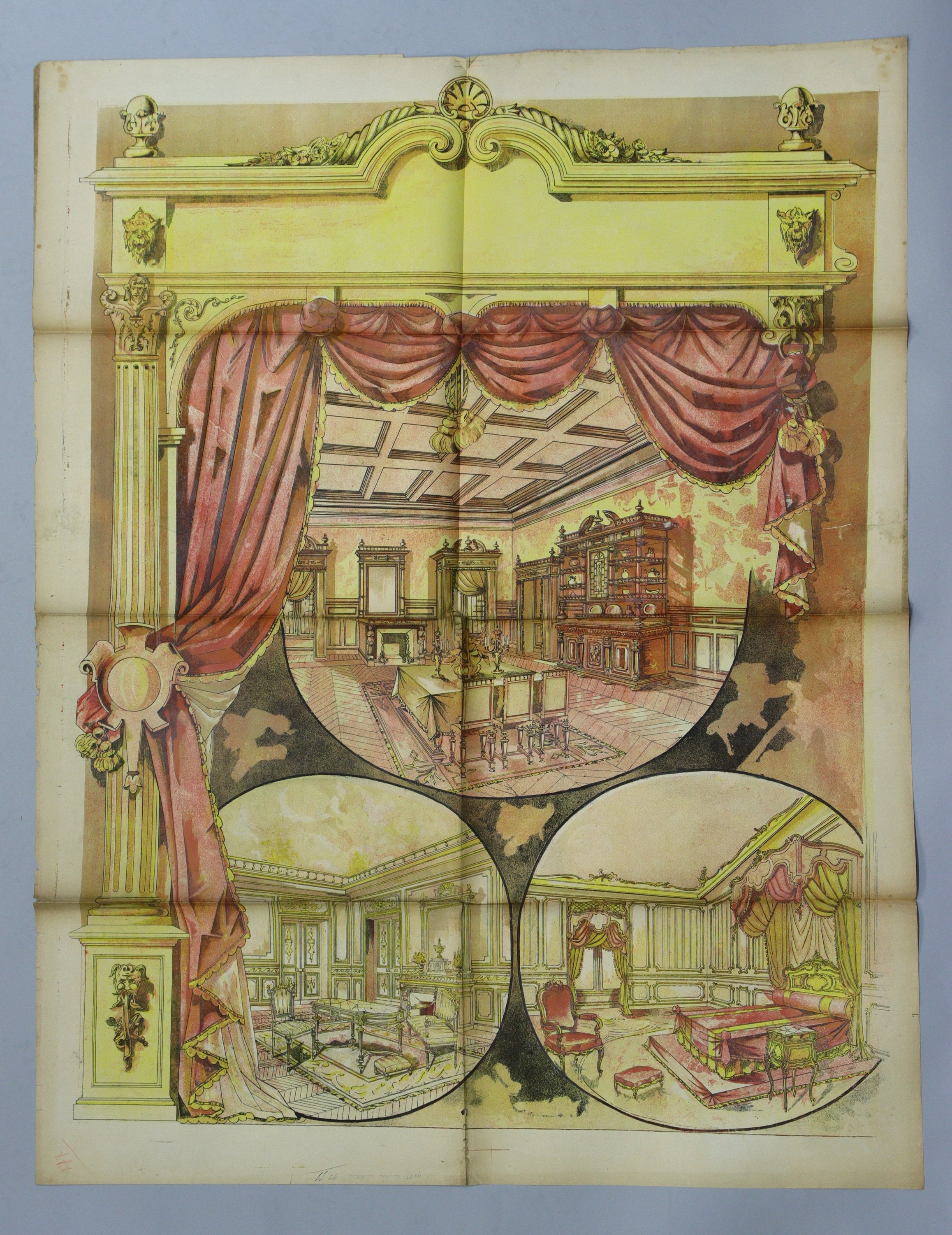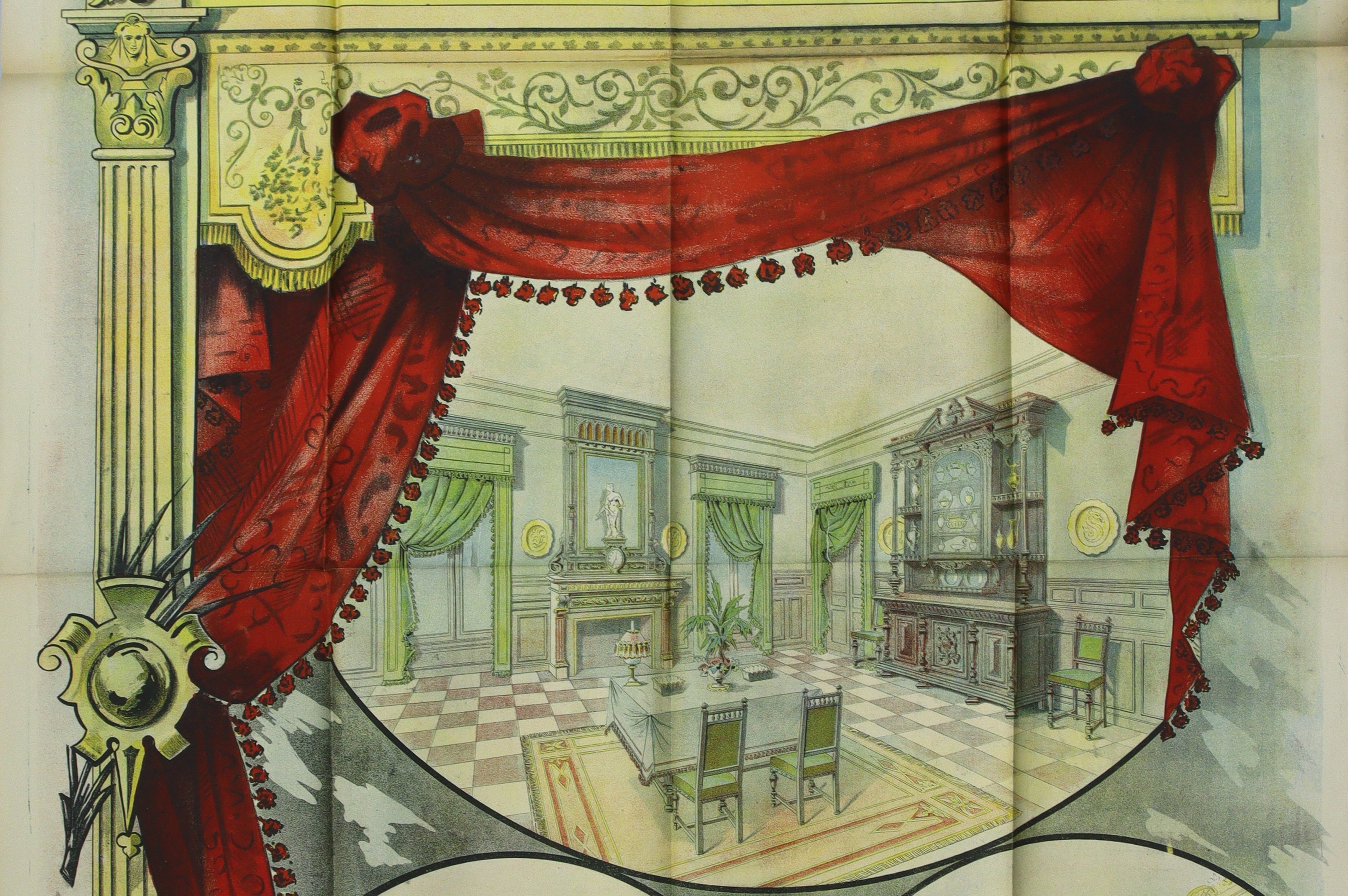 Affiches passe-partout sur le thème de la décoration et de l’ameublement, env. 130 x 100 cm (4 ex.), et 190 x 124 cm (3 ex.) (plis, déchirures, manques, rousseurs/salissures).