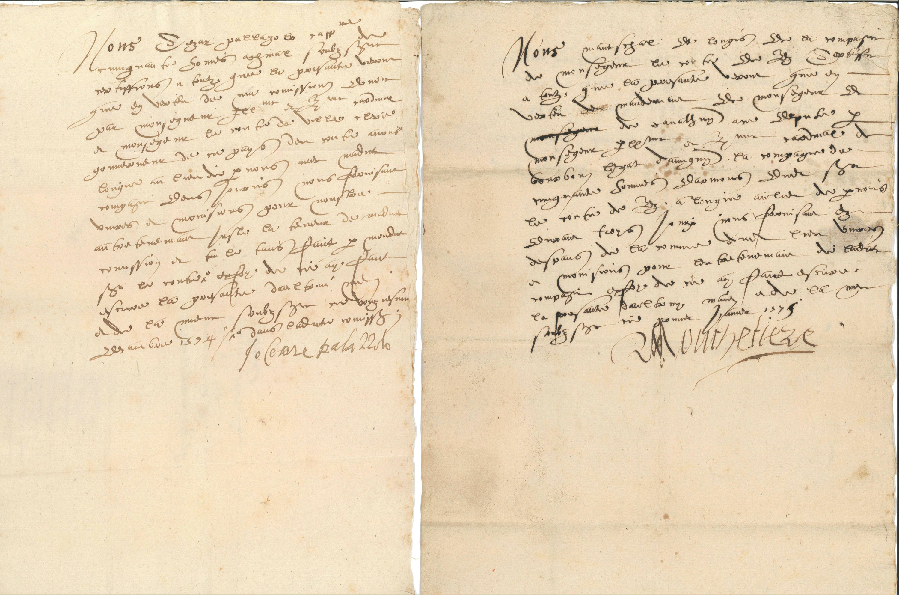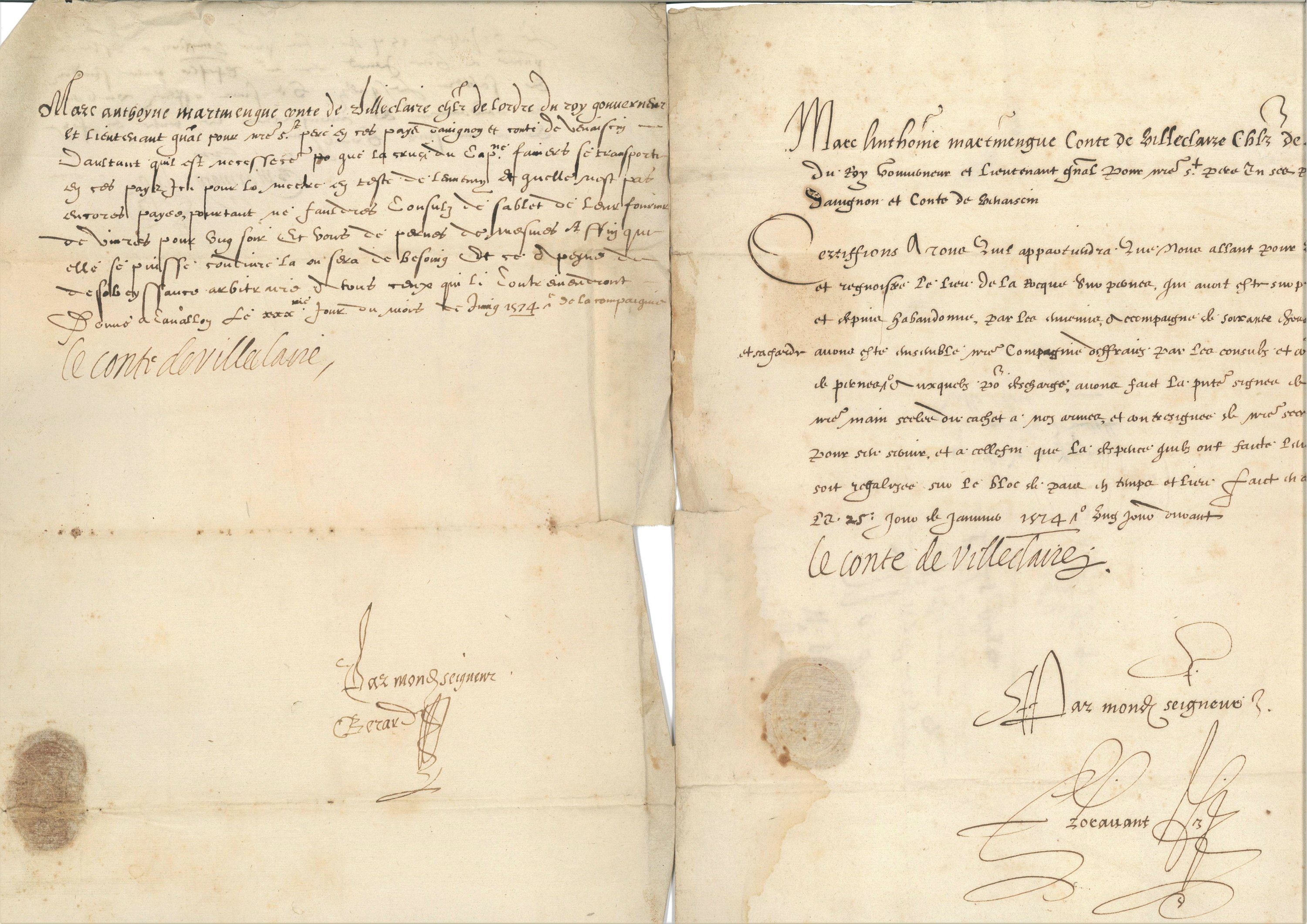 [Siège de Ménerbes] P.S., 16 juin 1578, capitaine Francolino, 2 pages in-fol. ; Collation du mandement du cardinal Georges dArmagnac