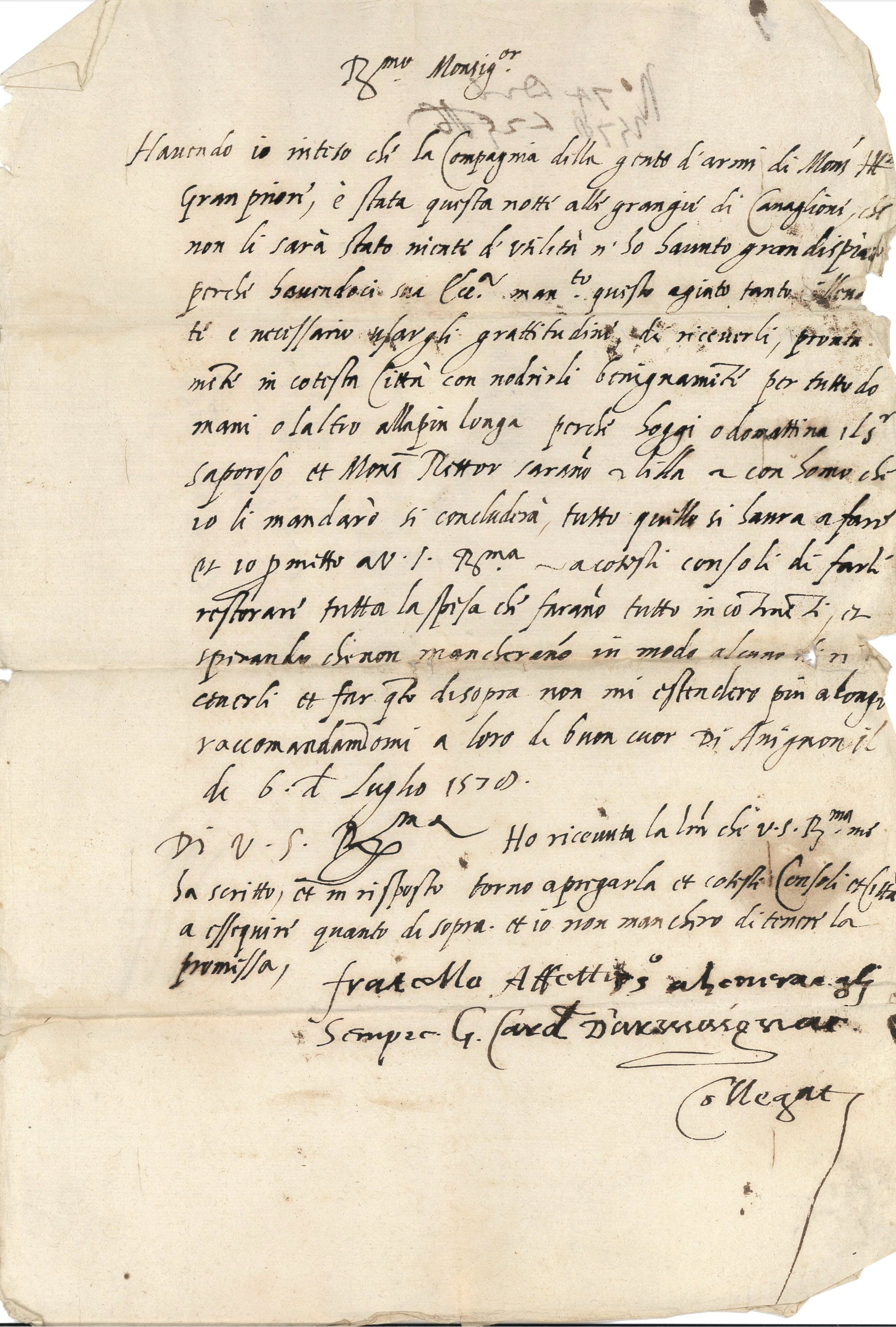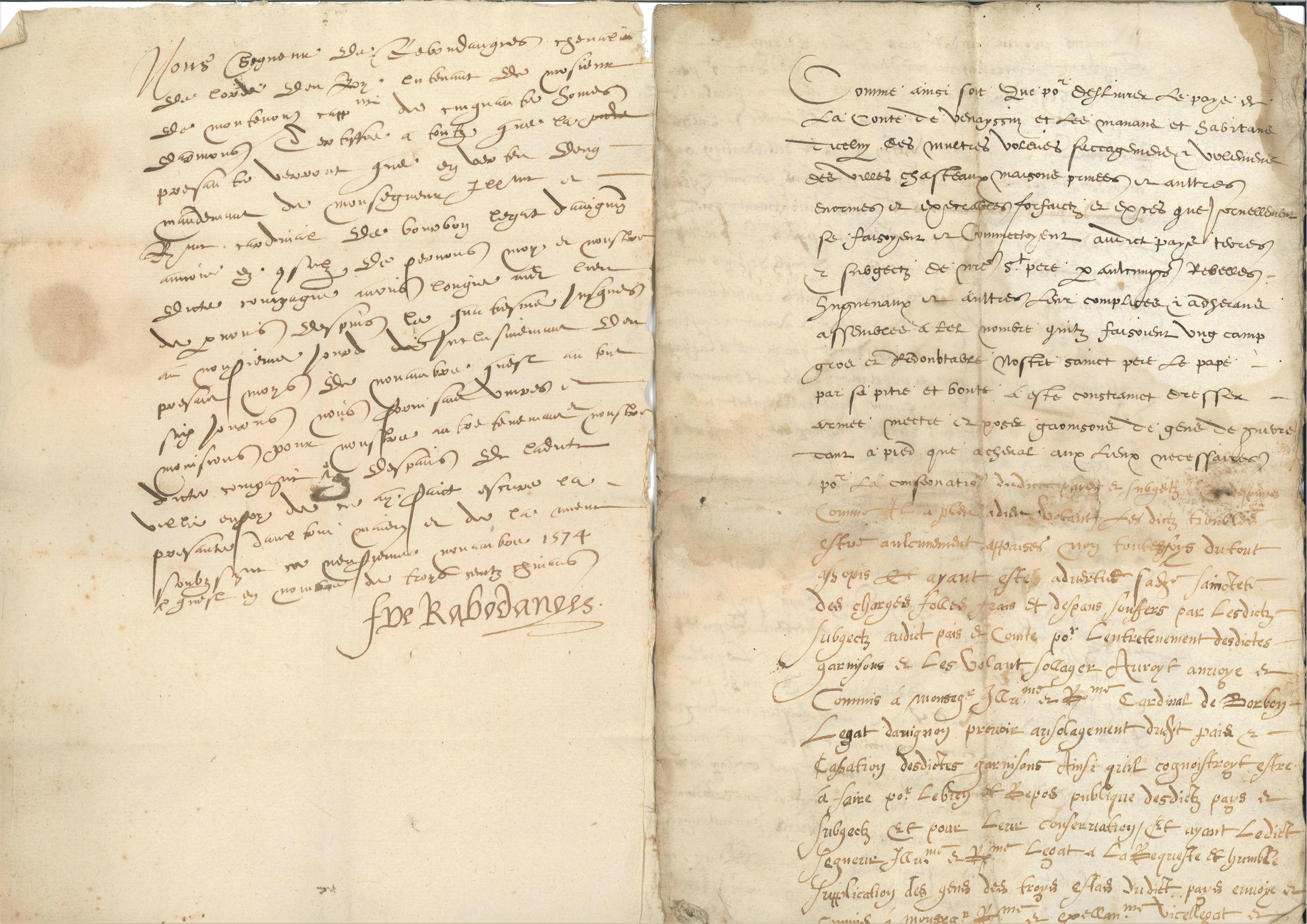 Copie d'une lettre du cardinal Charles de Bourbon, légat pontifical, adressée à Antoine Monterentio, commissaire et collatéral de Sa Sainteté, Avignon, 3 novembre 1574, concernant l'entretien de la cavalerie de monseigneur de Retz, 1 page in-fol. ; P.A.S., 9 novembre 1574, François de Rabodanges, chevalier de l'ordre du roi et gentilhomme ordinaire de sa Chambre, 1 page in-fol. ; Copie dun mandement du cardinal Charles de Bourbon légat dAvignon, fait au palais archiépiscopal le 28 décembre 1574