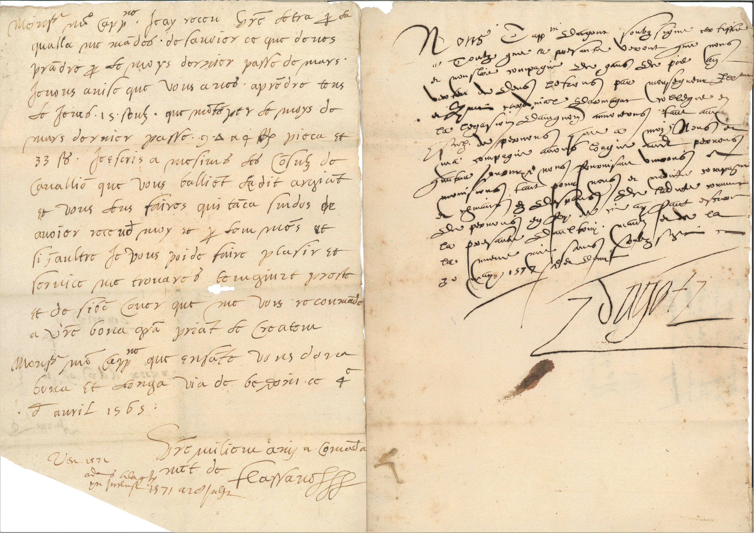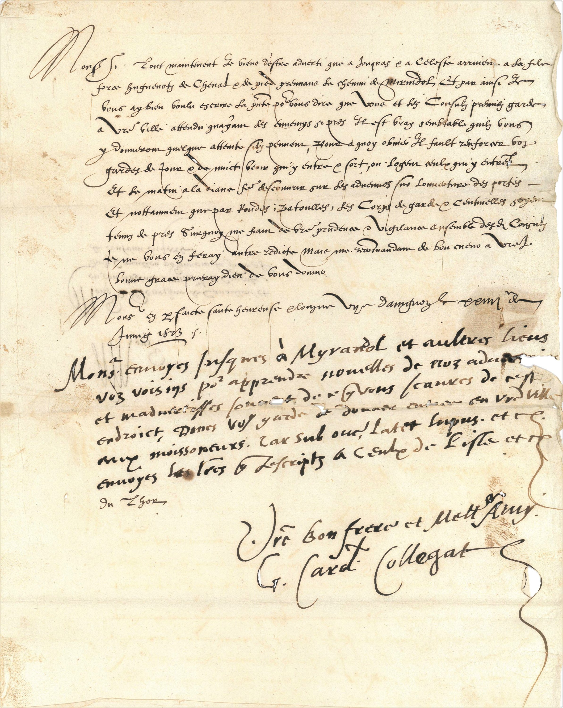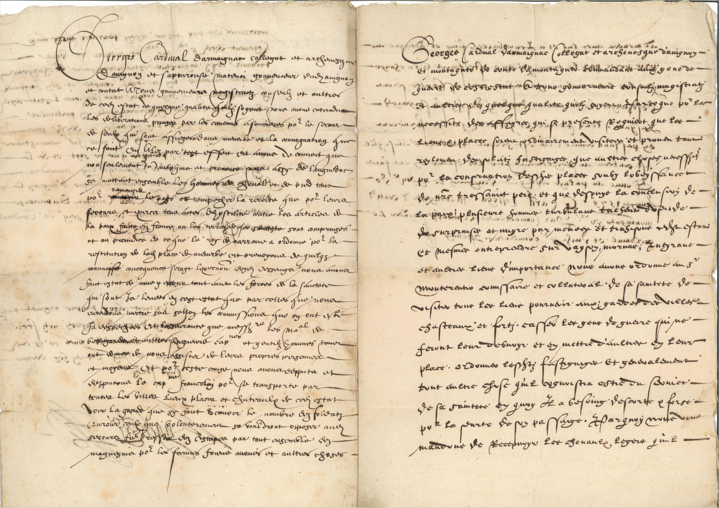 6 L.S. et P.S., 1573-1574, Georges d'Armagnac (1501-1585), cardinal, colégat de 1565 à 1572 puis légat du pape à Avignon de 1572 à 1585, archevêque d'Avignon et commandant en chef de l'armée pontificale dans l'Etat du Comtat-Venaissin, 8 pages in-fol., avec sceau aux armes pour certaines, dont : L.S., Avignon, 24 juin 1573, adressée à lévêque de Cavaillon