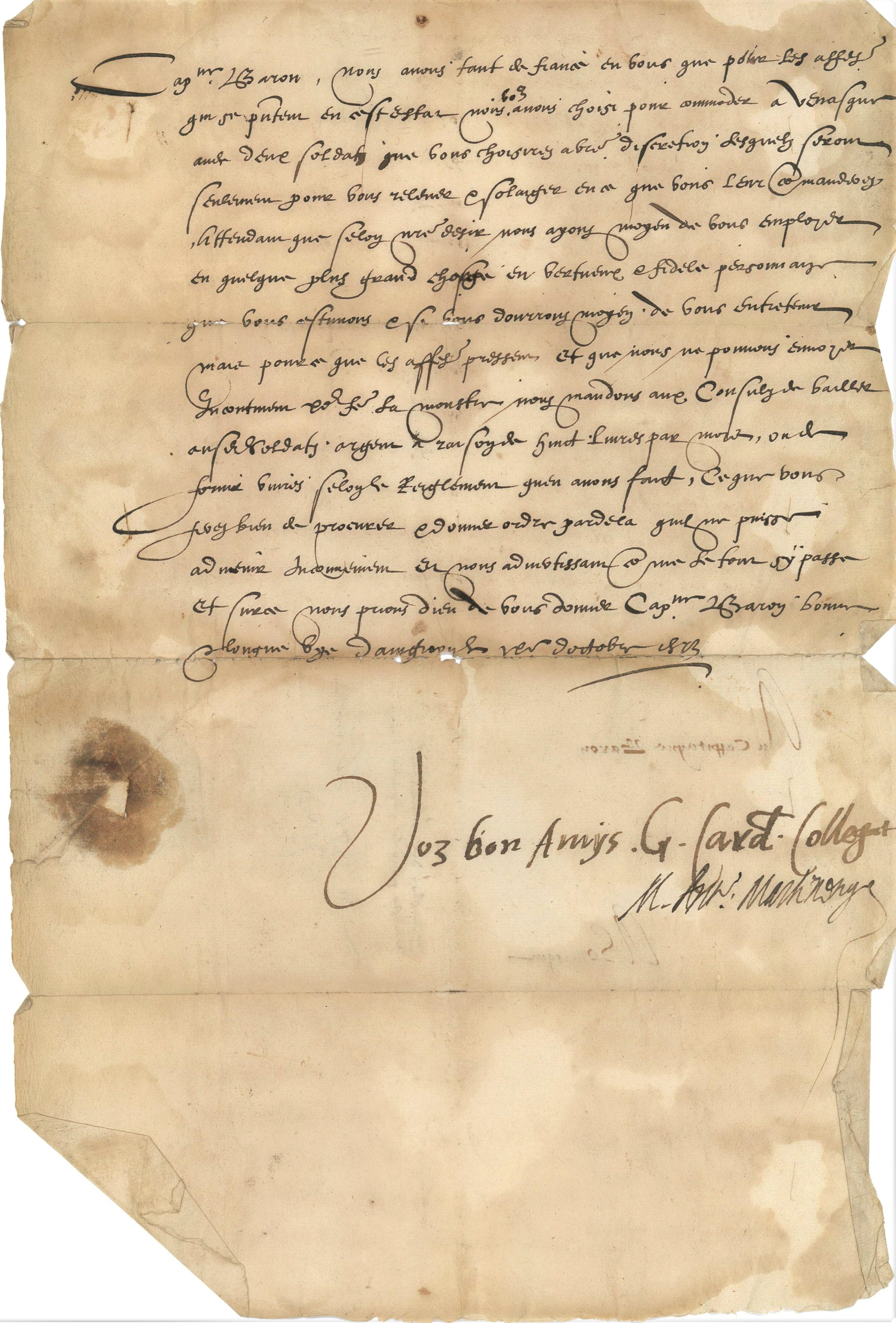 18 certificats, 1571-1589, signés par des capitaines ou des sous-officiers de compagnie (chaque compagnie composée de 150 hommes) par suite des ordres du gouverneur et lieutenant général des armées pontificales dans le Comtat-Venaissin