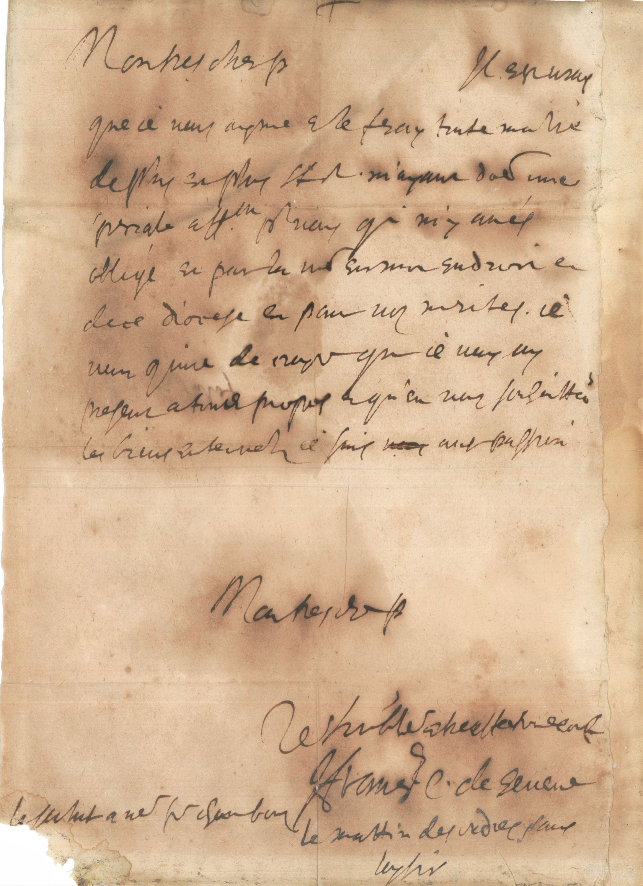 L.A.S., s.l., s.d., 1 page in-8 (en l’état), adressée à un ecclésiastique : « Mon très cher f(rère), Il est vray que je vous ayme et le feray toute ma vie de plus en plus et m'ayant donné une spéciale affection pour vous qui m'y avez obligé et par la vôtre en mon endroit et de ce diocèse et paié vos mérites. Je vous (con)jure de croyre que je vous ay présenté à tous propos et qu’en vous souhaitt(ant) les biens eternelz, je suis avec passion Mon très chère f(rère), Votre humble et très affectionné confrère / Le salut à notre frère Chambon / Le matin des ordres, sans loysir. »