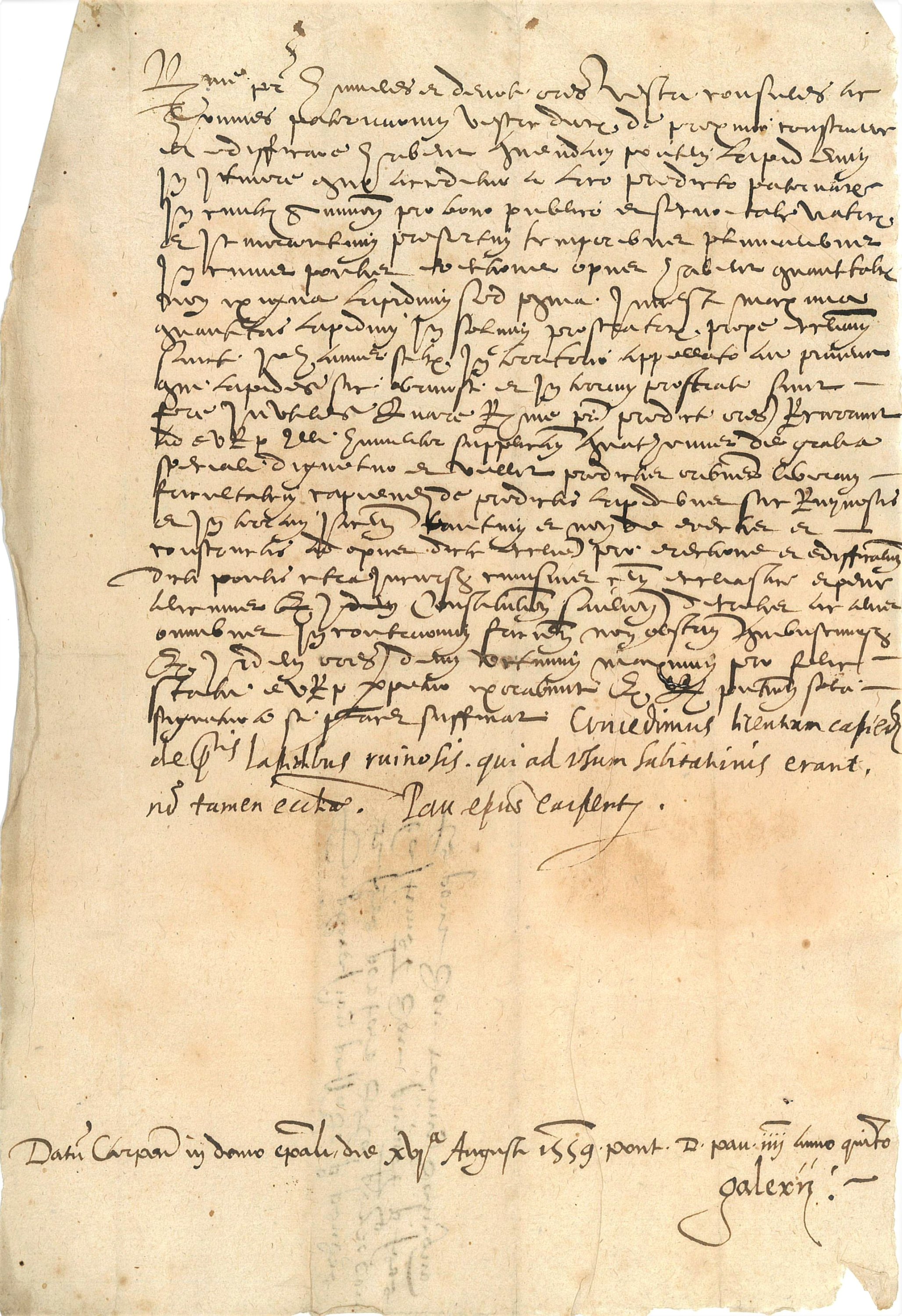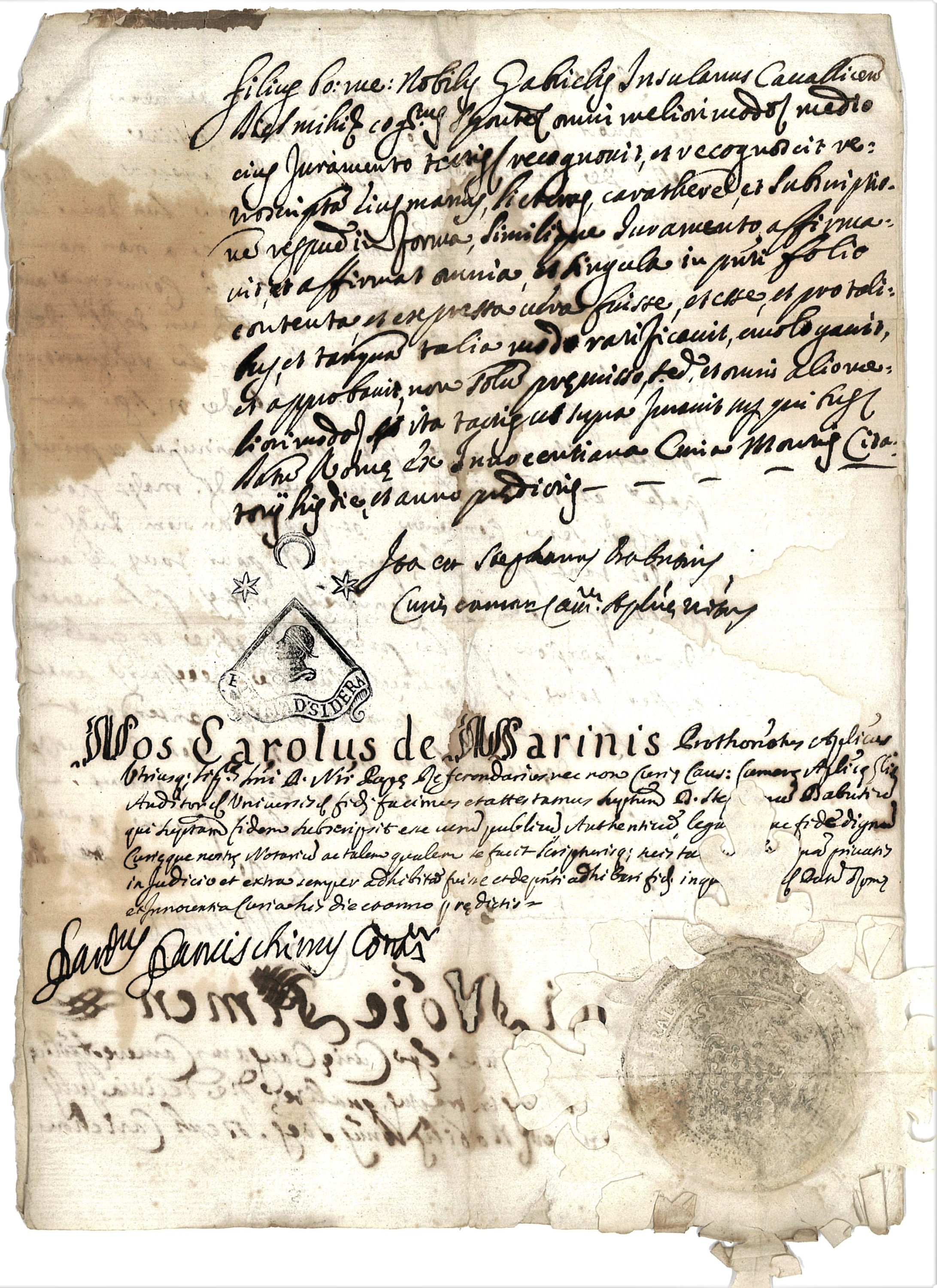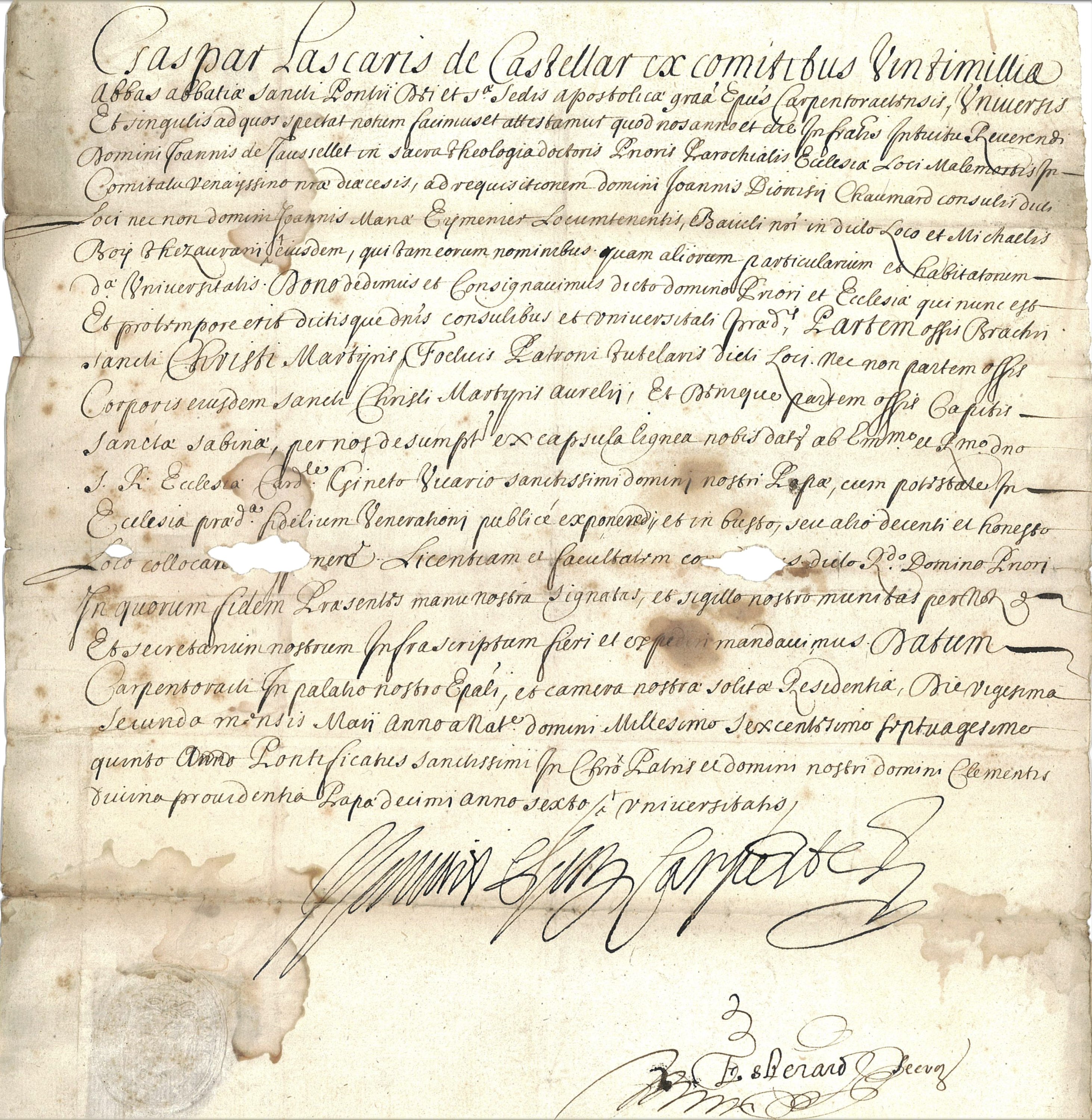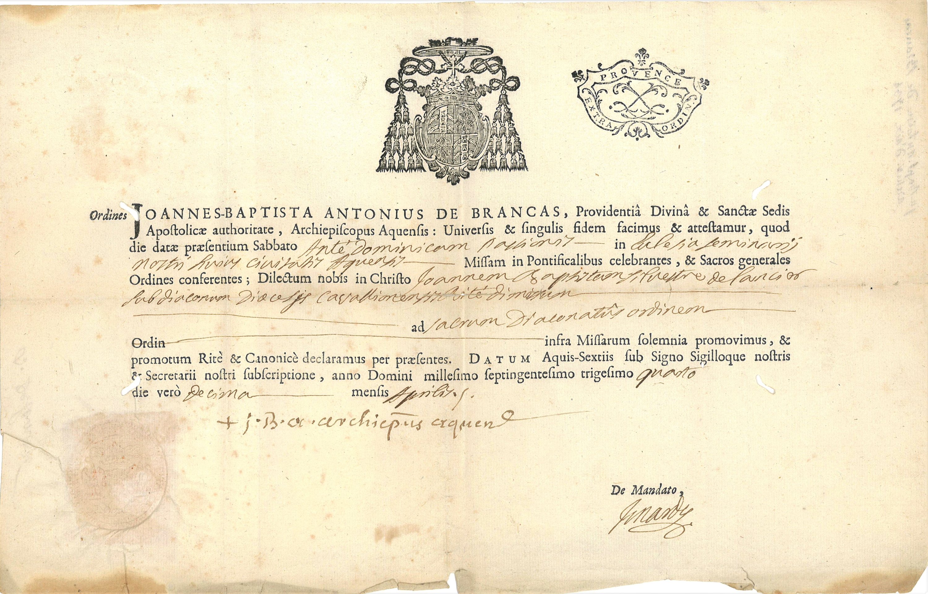2 L.A.S. avec sceau, Rome, 31 janvier et 15 février 1502, Bernardin ou Béranger Gambéria évêque de Cavaillon adressées à noble Hélie du Puy ; 2 L.A.S. du 17 janvier 1582 et du 12 février 1583 du doyen chanoine du chapitre cathédral de Saint Pierre dAvignon ; Quittance du 11 août 1586 du prieur du couvent des Chartreux de Villeneuve les Avignon ; Quittance du 17 août 1658 de la supérieure du couvent de Saint Joseph du Tiers-Ordre de lIsle sur Sorgues ; Copie manuscrite du texte sur les indulgences accordées par le pape, 1665, 2 pages in-4 ; P.A. du 10 mars 1679 du couvent des Récollets de Pernes ; Lettre dindulgences sur vélin du 28 avril 1683 accordée à léglise de Pernes les Fontaines ; P.S., Rome, 10 juillet 1705, Jean Joseph Carichon et contresignée par le cardinal Carlo Maria Marini (1667-1747) auditeur à la Chambre de la curie romaine, superbe sceau, réception de loffice de vice-régent de la chambre apostolique au palais pontifical dAvignon ; Quittance du 20 juin 1709 signée par la supérieure du couvent des Visitandines de Carpentras ; Quittance du 21 mars 1745 par la supérieure du couvent des Ursulines de Pernes ; 6 quittances, 1750-1751, signées par Françoise de Molettte de Morangiès supérieure du couvent de Notre Dame des Ursulines dAvignon ; P.S. du 21 septembre 1752 signée par le prieur et religieux du couvent des Augustins de Castellane faisant réception de la profession dun novice du couvent de Pernes ; Occasion de la réforme des mineurs conventuels dits Cordeliers en France, manuscrit anonyme, 2 pages in-4 ; etc.