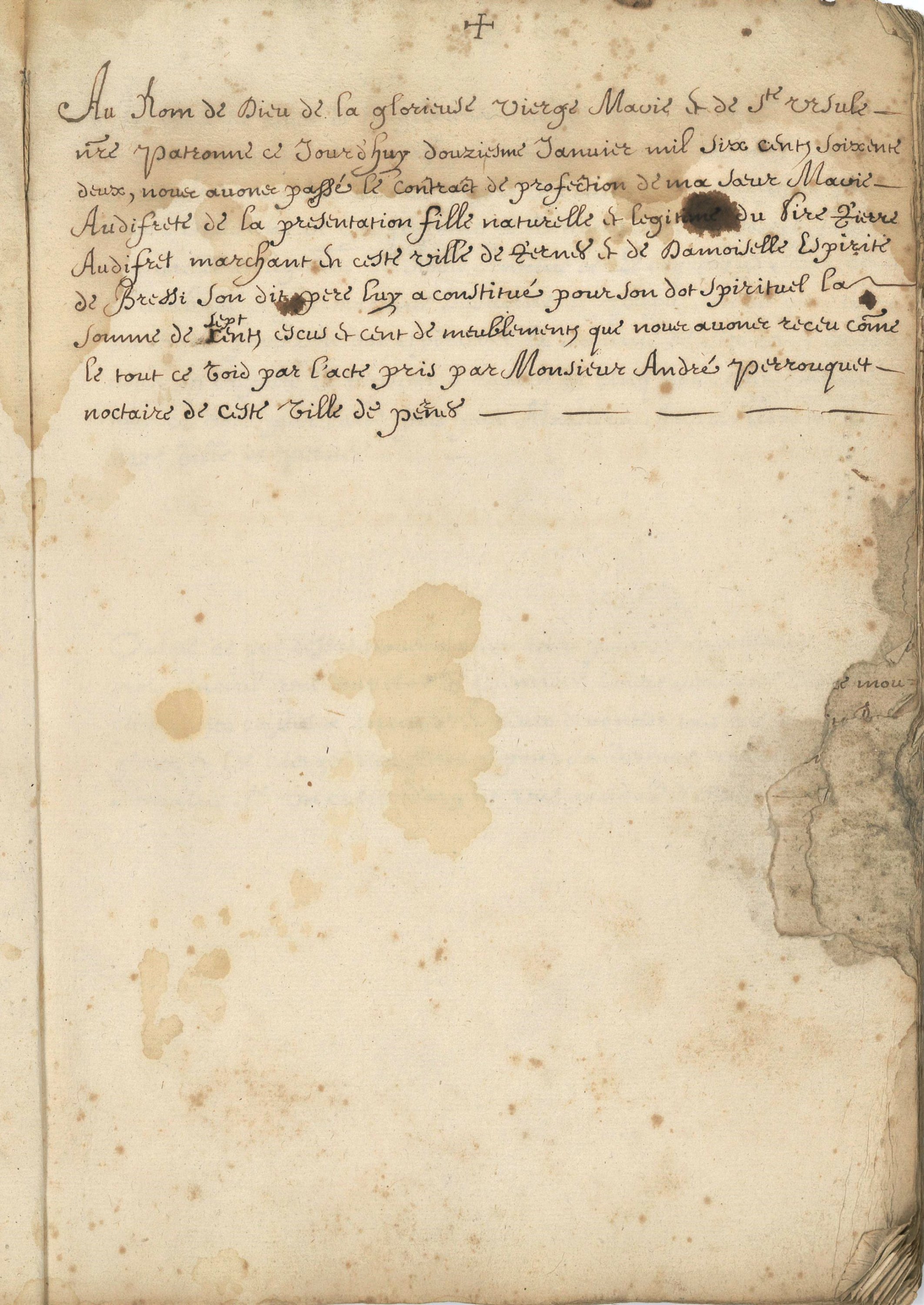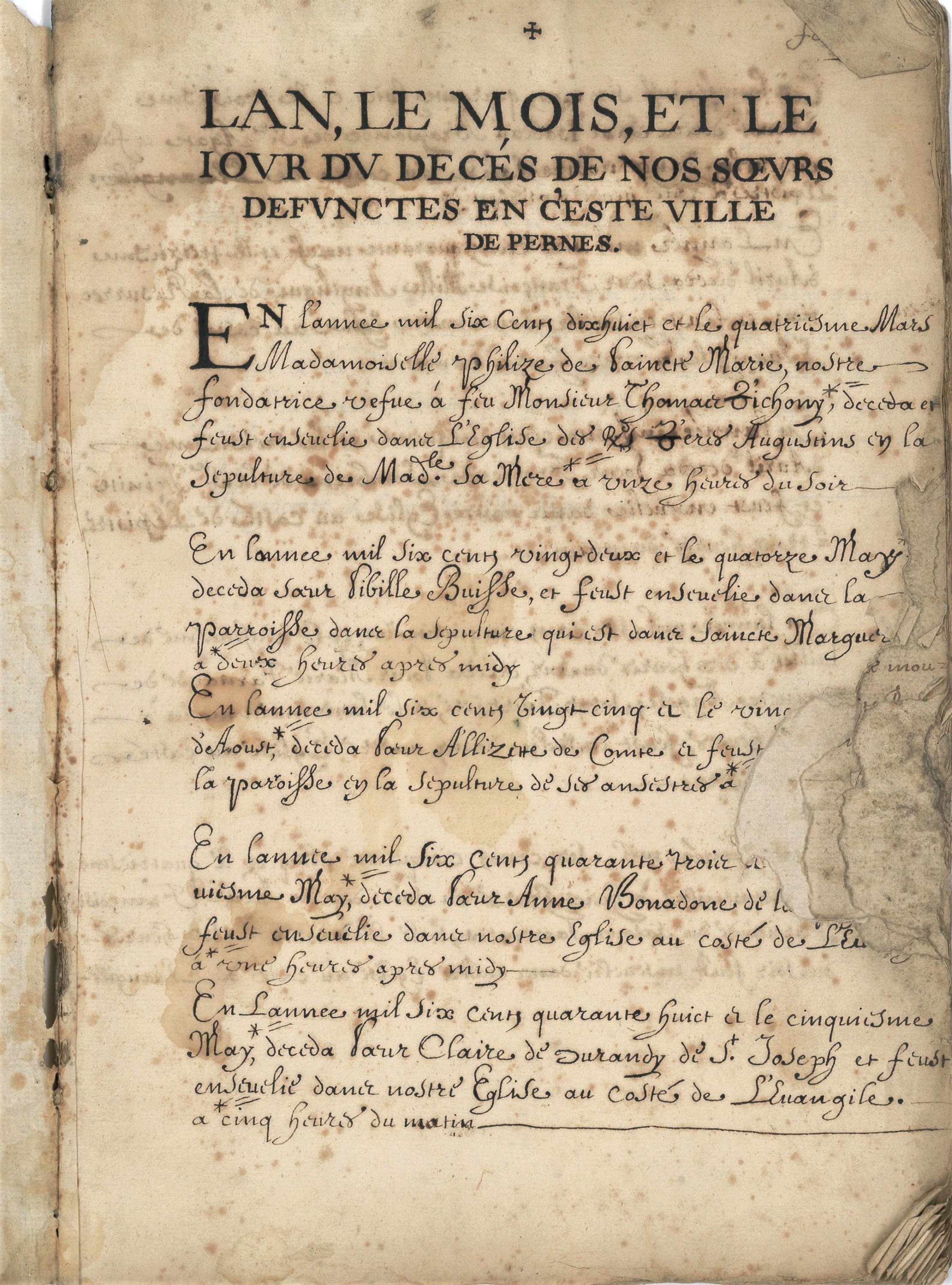 Registre détaillant les sépultures de 1618 à 1656, la réception des professions et leurs dots de 1662 à 1685, des religieuses de la congrégation de Sainte-Ursule de la ville de Pernes ; cahier manuscrit 30 pages in-4 (manques et tâches) ;