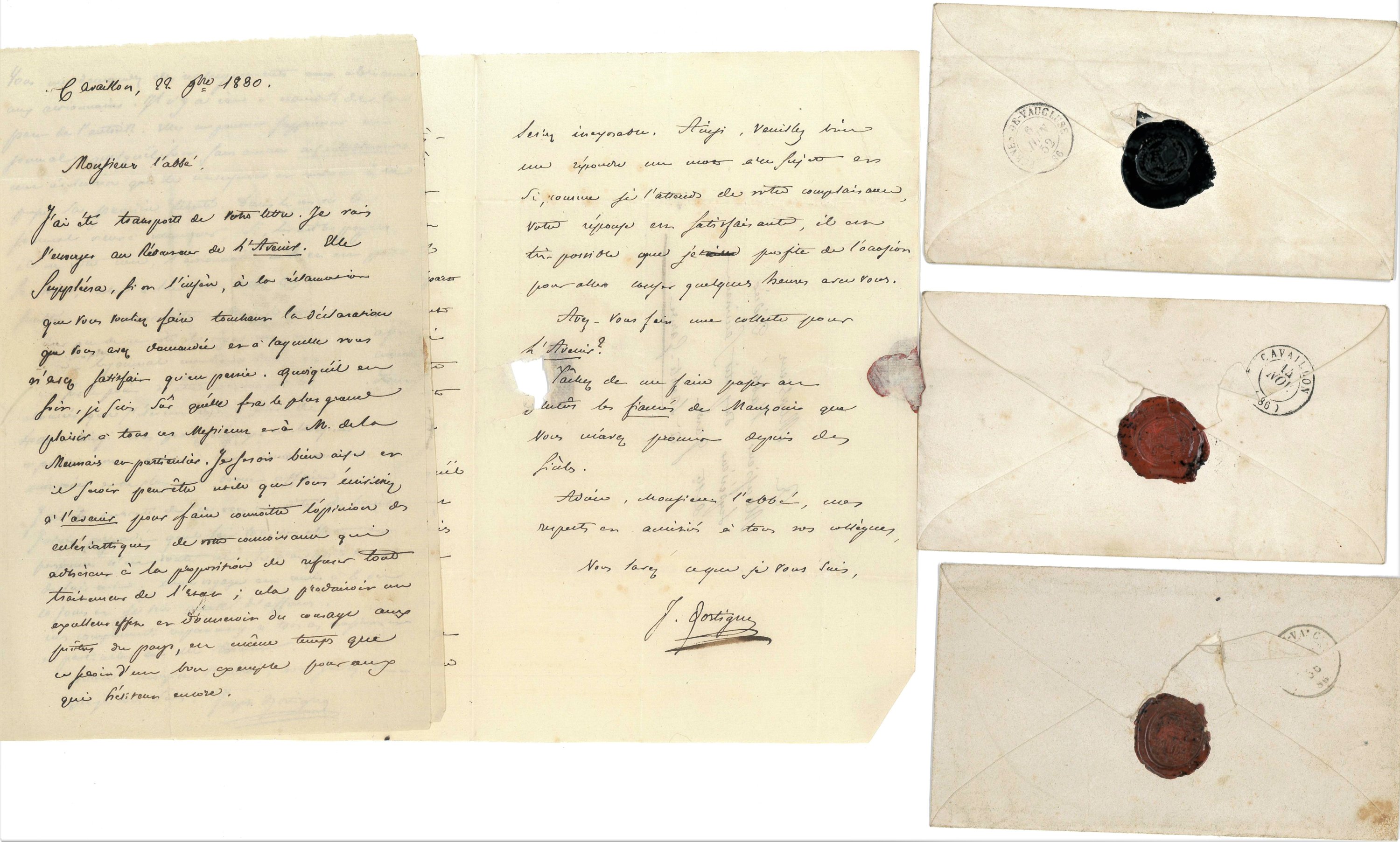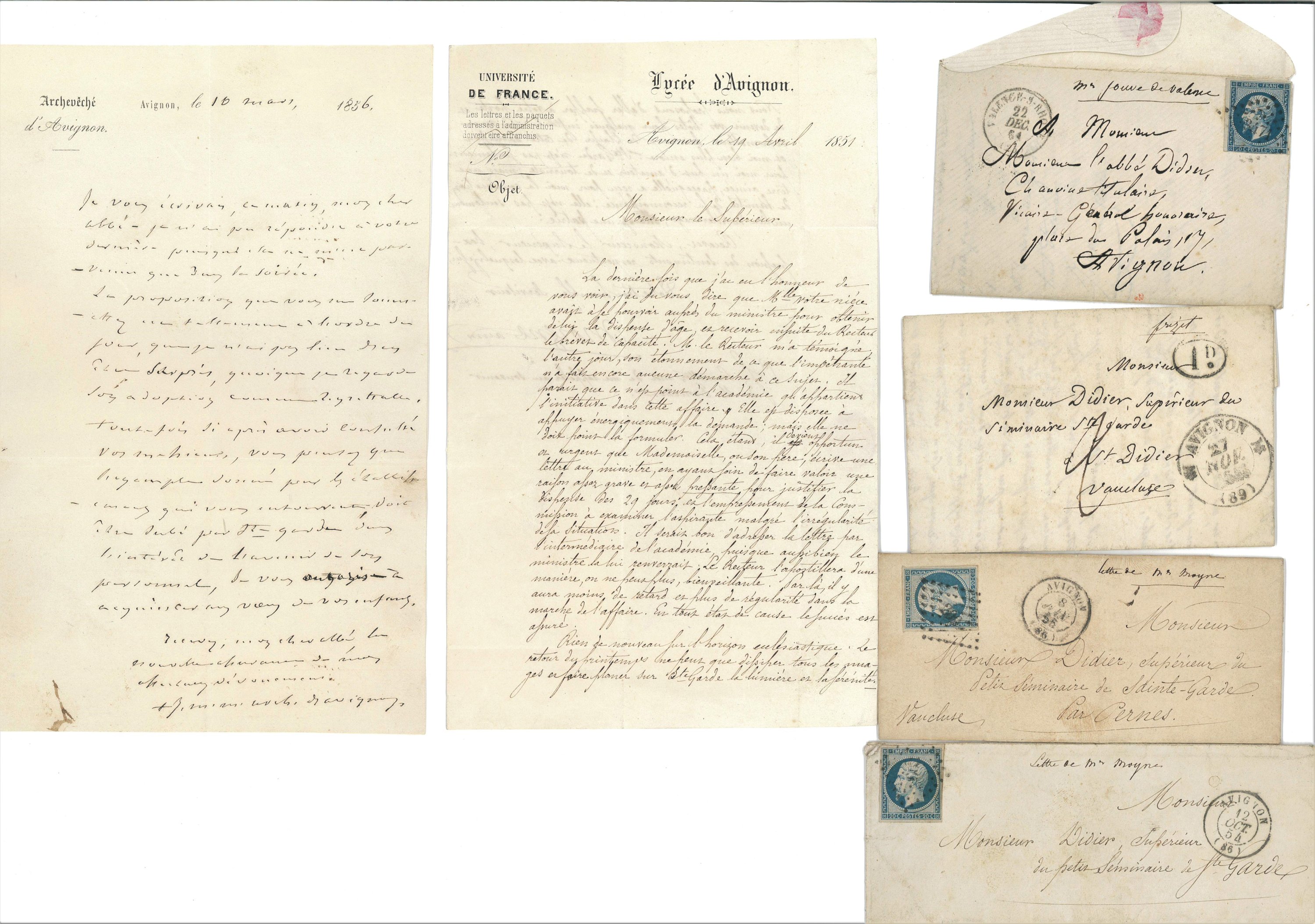 Dont 12 lettres de larchevêque de Cavaillon, avec enveloppes et cachet de cire ; 4 lettres de laumônier du lycée dAvignon ; lettre du général Joseph Chabran maire de Cavaillon ; 2 lettres de Joseph dOrtigue (1802-1866), écrivain et compositeur musical.
