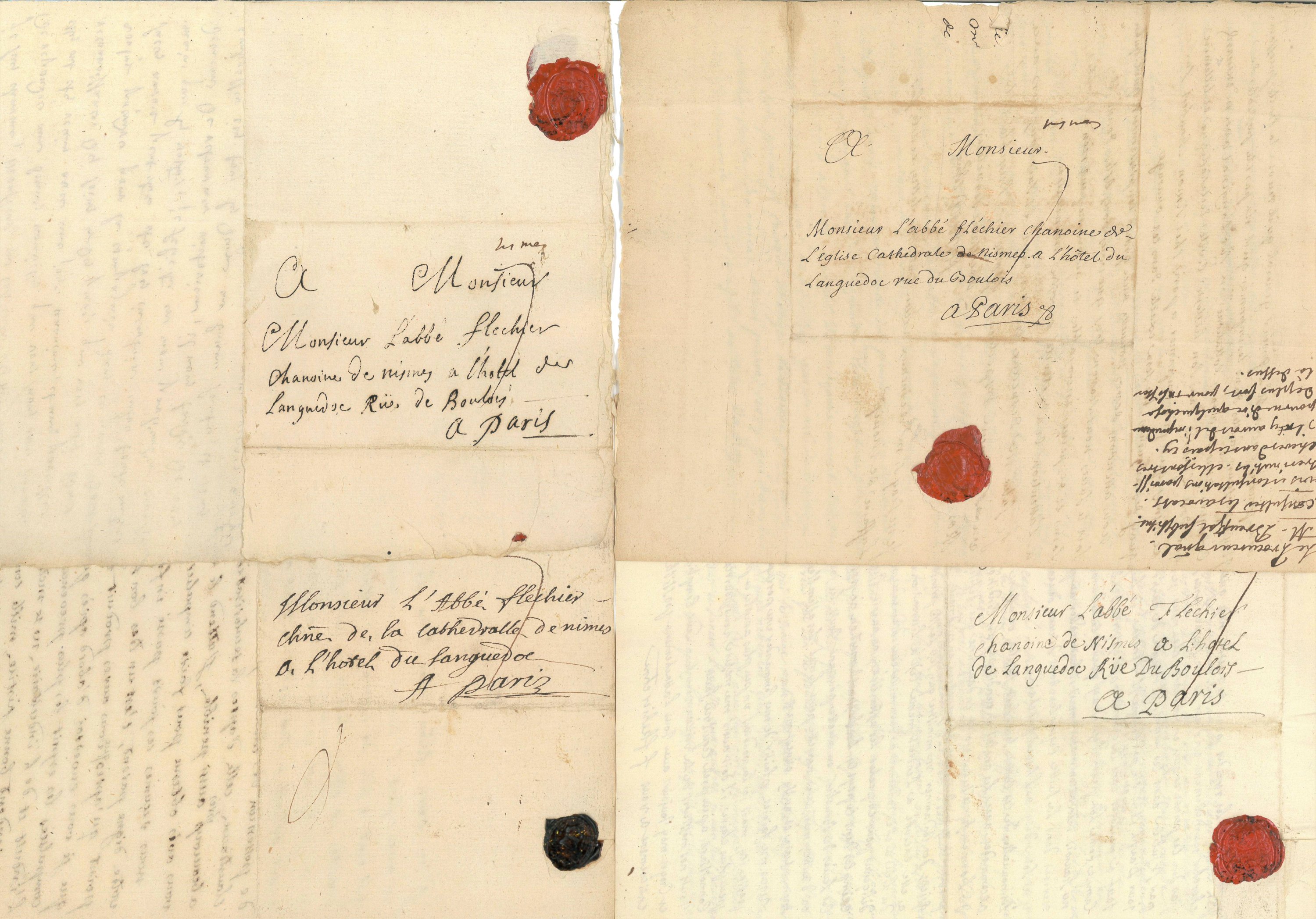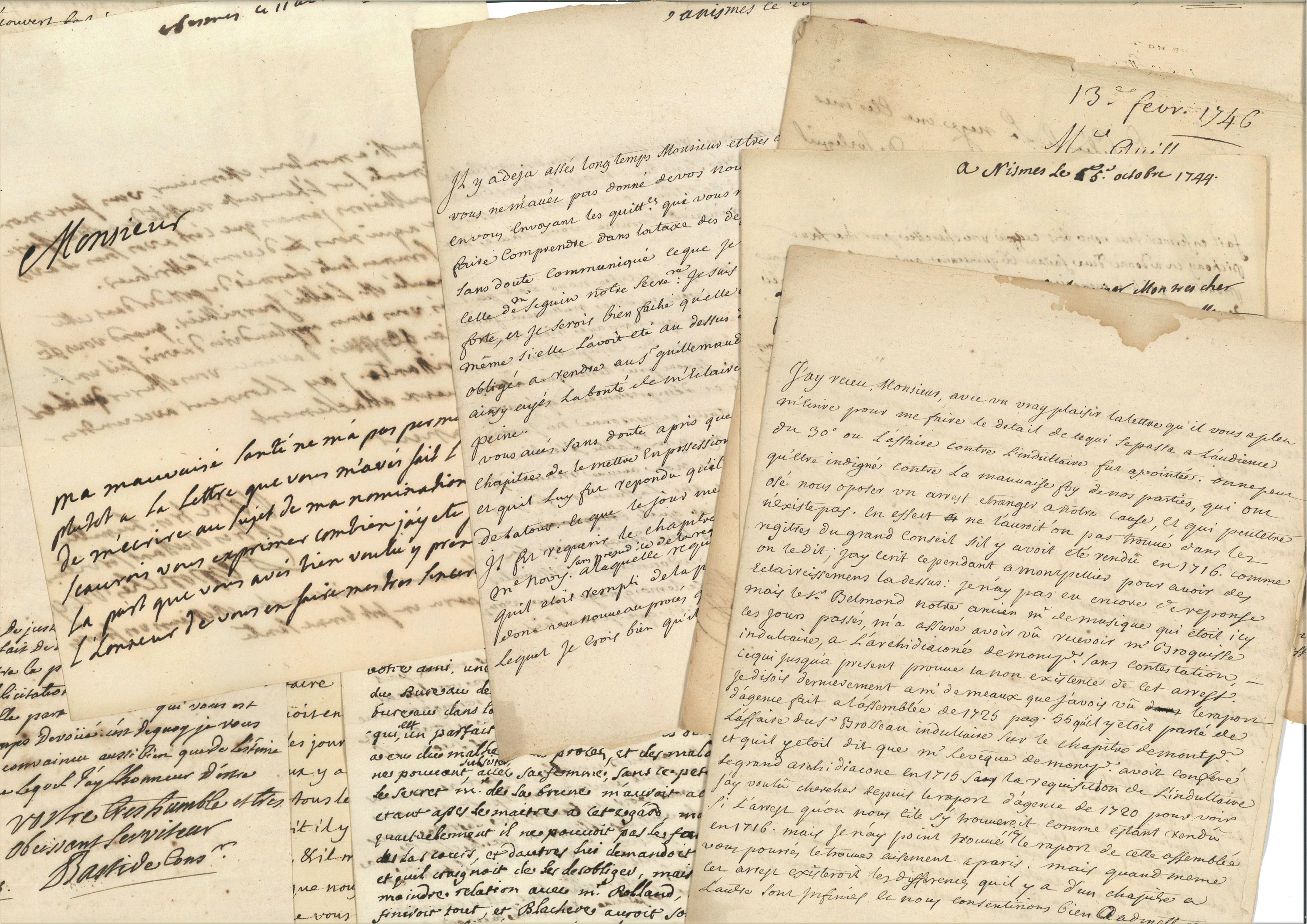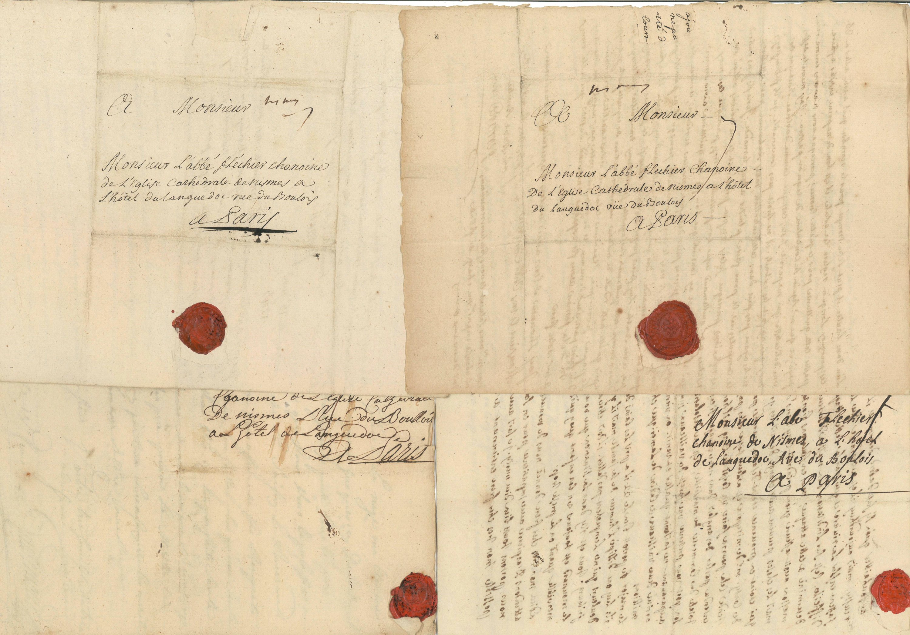 Chapitre collégial de Notre-Dame de Nîmes, 24 L.A.S., 1744-1750, écrites en majorité de Nîmes par les chanoines du chapitre, adressées à labbé Pierre Fléchier, chanoine du chapitre, à lhôtel du Languedoc à Paris, 44 pages in-8, la plupart avec cachets de cire aux armes ; correspondance passive relatant principalement les affaires du chapitre et quelques événements tels que le siège de Coni, la lutte contre les protestants