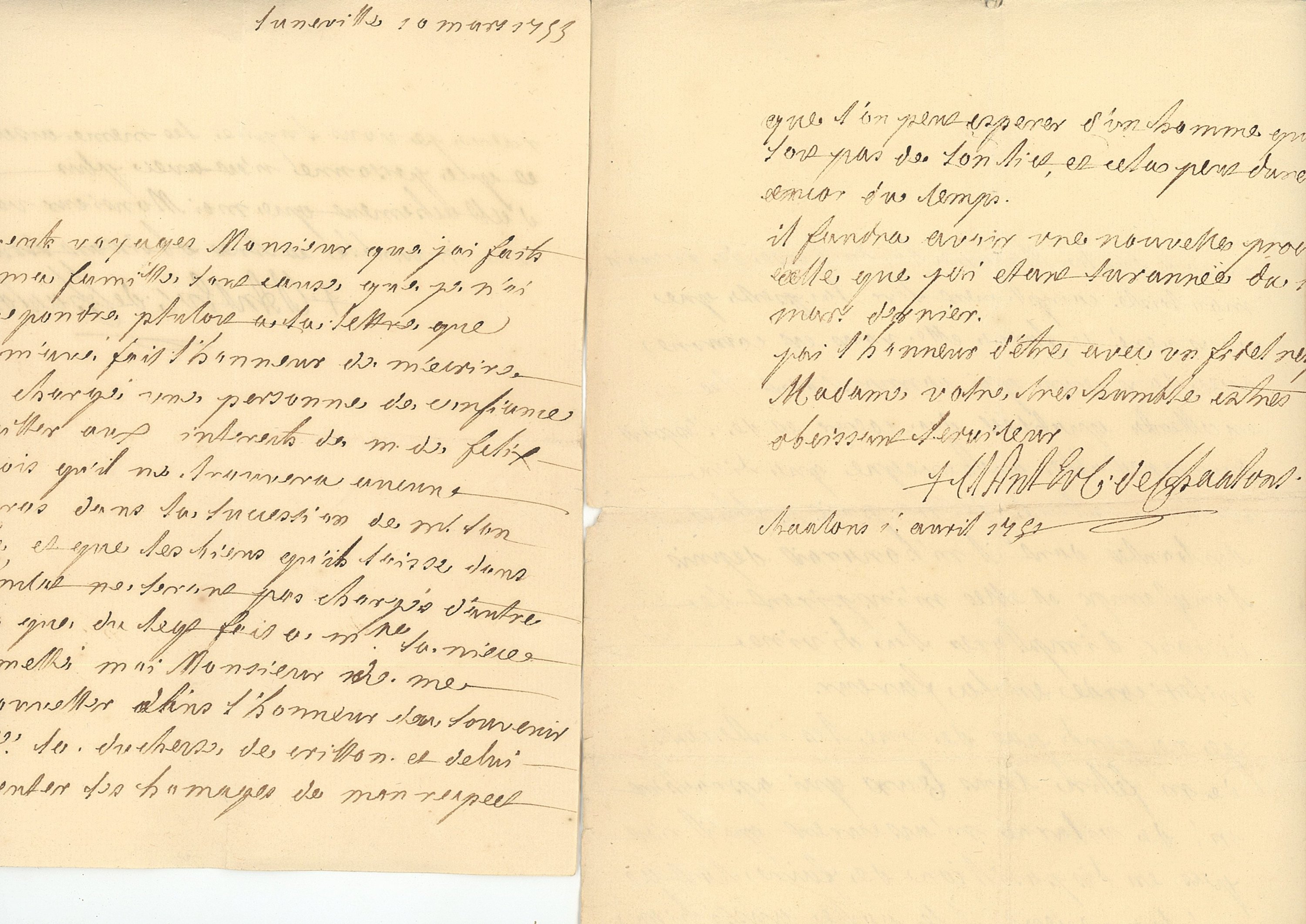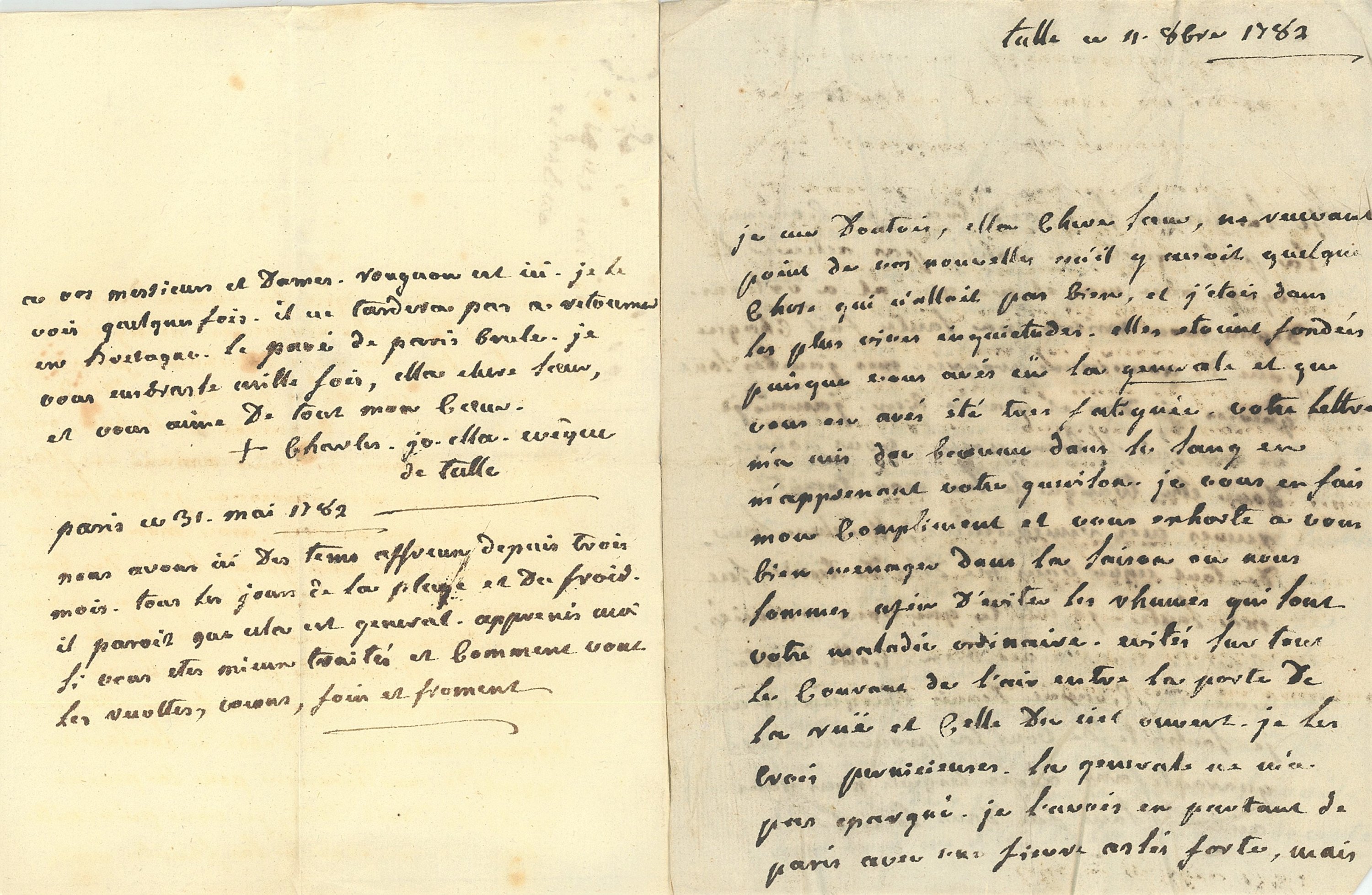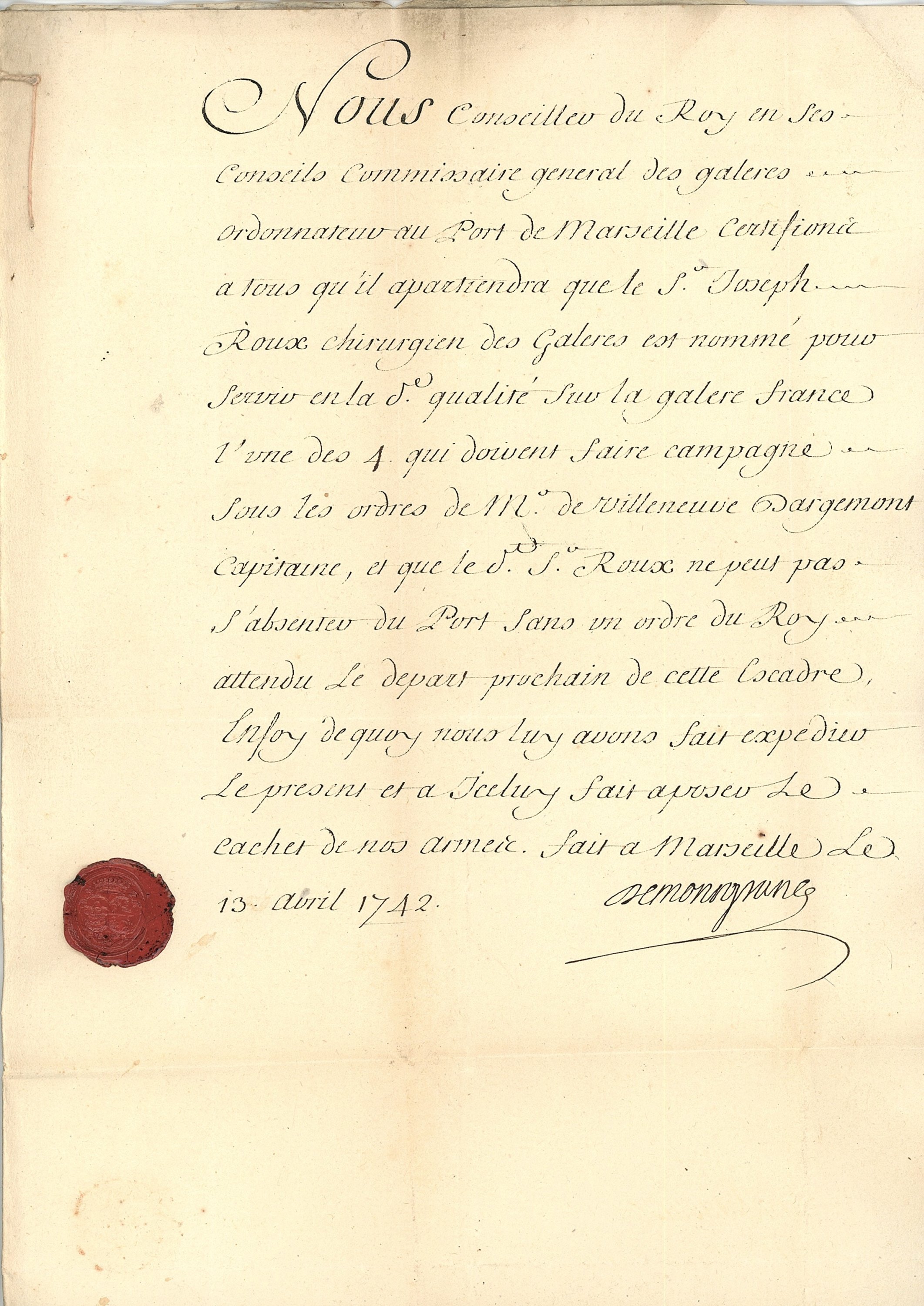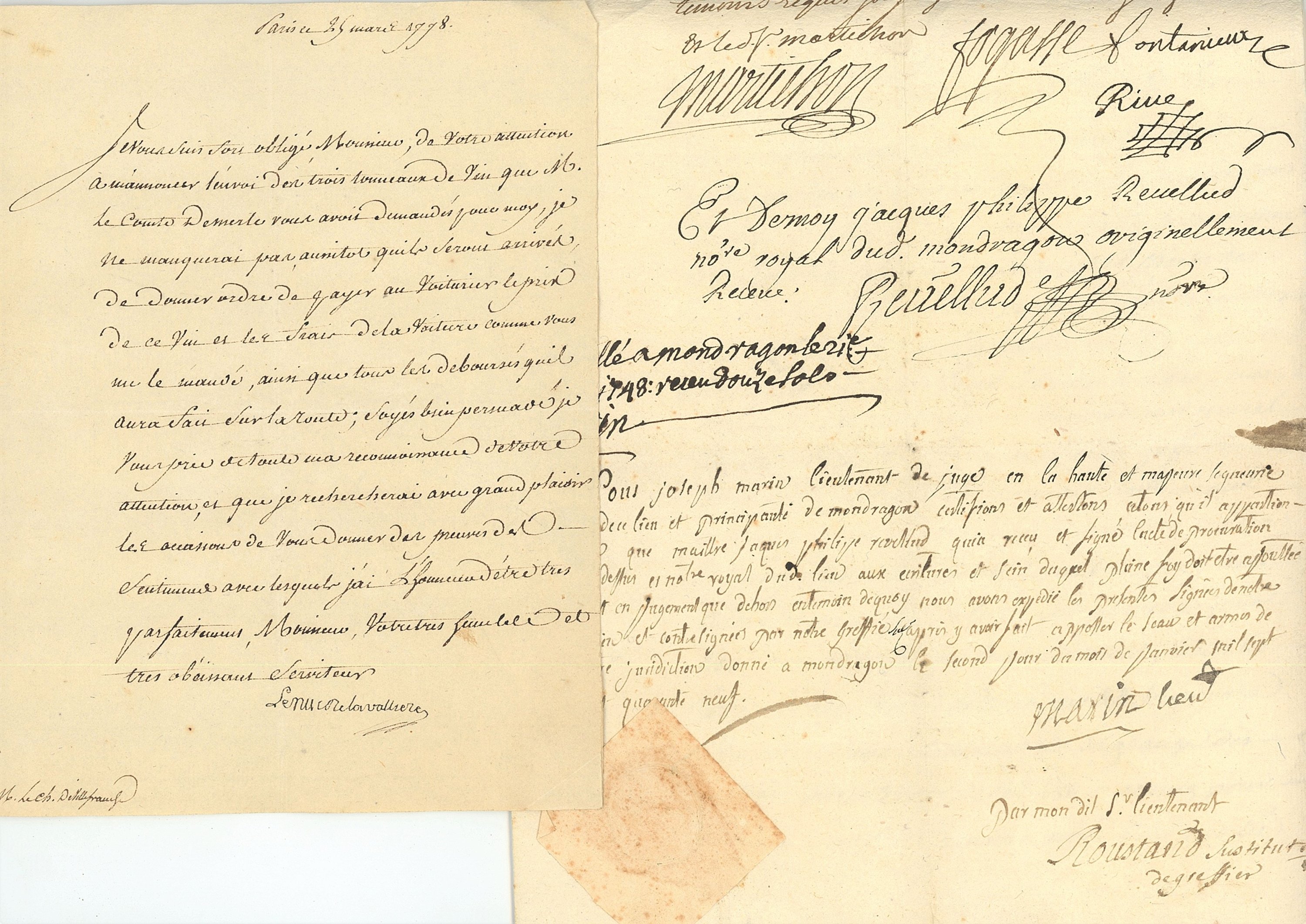 P.S., Marseille, 13 avril 1742, Jean Baptiste de Montgrand commissaire général des galères et ordonnateur du port de Marseille, 1 page in-fol. avec beau cachet aux armes de cire rouge, nomination de Joseph Roux chirurgien des galères pour servir sur la galère France ; P.S., Mondragon, 19 décembre 1748, Paul Charles de Fougasse prince de Mondragon ; 3 L.A.S., 1750-1755, Claude-Antoine de Choiseul-Beaupré, pair de France et évêque de Châlons-sur-Marne de 1733 à 1763, 6 pages in-8 ; 2 L.A.S., 1762, Antoine Joseph Auguste de Teste, avocat et professeur en droit civil, promoteur de la manse archiépiscopale, 5 pages in-8 ; 2 lettres, de 1765 et 1777, adressées au sieur du Puy Montbrun capitaine au régiment dAunis dont L.S., Paris, 22 octobre 1777, Antoine Marie dHozier de Sérigny (1721-1801), héraldiste 6e juge darmes de France, 2 pages in-8 ; L.A.S., Avignon, 29 octobre 1776, Levieux recteur de lhôpital Sainte Marthe, 3 pages in-8 ; 4 L.A.S., 1781-1782, Charles Joseph de Raffélis de Saint Sauveur, évêque de Tulle de 1764 à 1791, 13 pages in-8 ; P.A.S. ? (ou copie manuscrite ?) de Jean Baptiste Tourteau de Septeuil, premier valet de chambre du roi Louis XVI ; quittance du 2 mai 1787 délivrée au sieur du Puy Montbrun ; 3 mémoires manuscrits relatifs aux biens de la famille Clément au Crestet (Vaucluse) poursuivie pour troubles de possession, seconde moitié du 18e siècle, 130 pages in-4 ;
