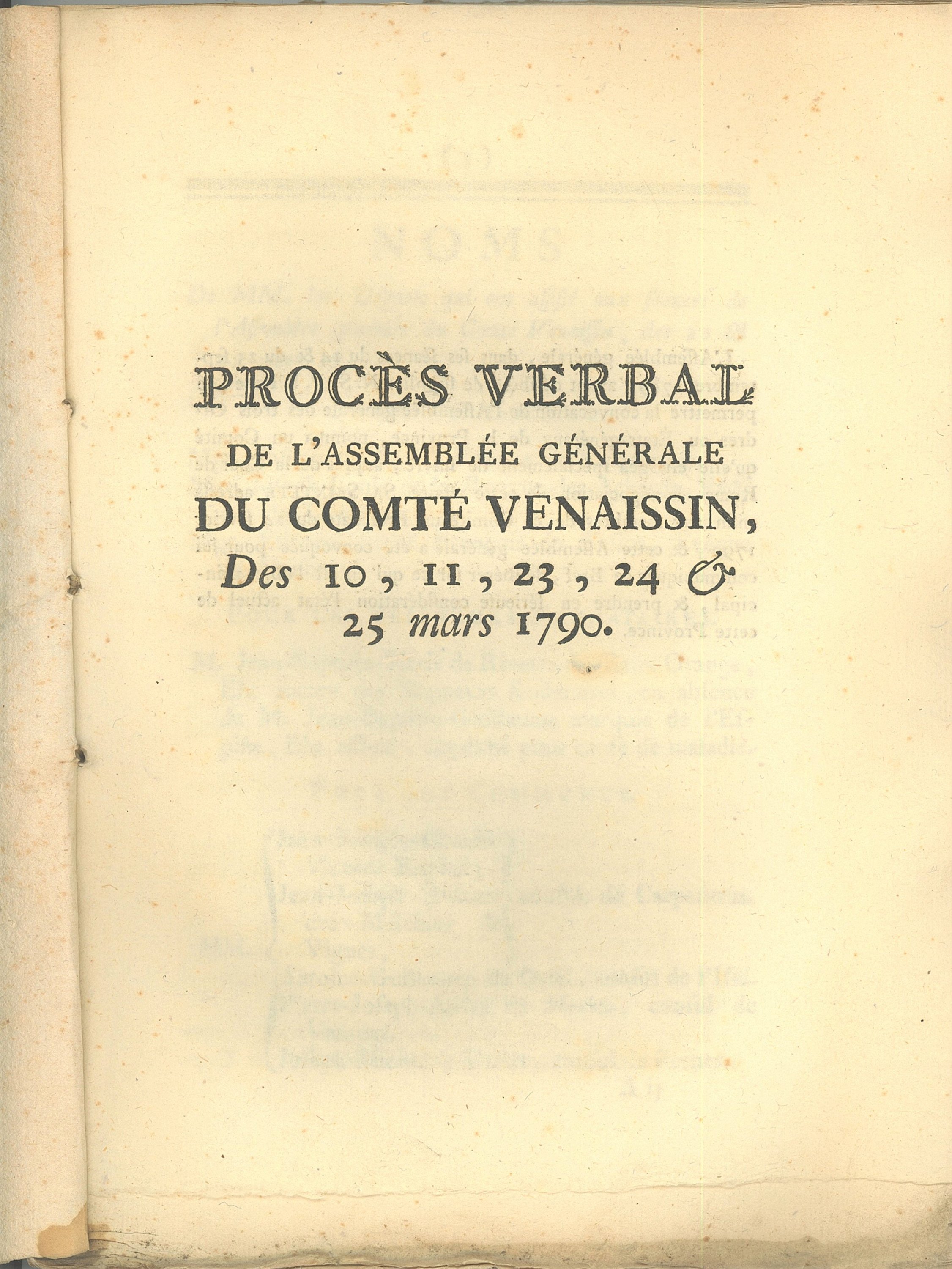 5 pièces imprimées : Procès-verbal de lassemblée générale du Comté Venaissin des 10, 11, 23, 24 & 25 mars 1790, D. G. Quenin à Carpentras, 76 pp. in-4 ; Discours prononcé par M. le Baron de Sainte-Croix, à la séance du matin du 25 mars 1790 de lassemblée générale des Etats du Comté Venaissin, Impr. D.G. à Carpentras, 8 pp. in-4 ; Arrêté de lassemblée représentative du Comté Venaissin concernant lorganisation des municipalités, 22 juin 1790, Impr. D.G. Quenin à Carpentras, 22 pp. in-4 ; Démission de M. Audiffret le jeune de sa charge dofficier municipal de la commune dAvignon, septembre 1790, 16 pp. in-4 ; Observations du conseil municipal de la ville de Cavaillon sur les divers chefs de demande renfermés dans une pétition signée Forbin Oppède, adressée au citoyen préfet du département du Vaucluse, Impr. J.A. Proyet à Carpentras, 44 pp. in-4 ; Notes manuscrites du 19e s., 48 pp. in-fol. ; Transcriptions autographes dextraits de documents et correspondances administratifs concernant lhistoire de la commune de Pernes et son canton durant la période révolutionnaire.