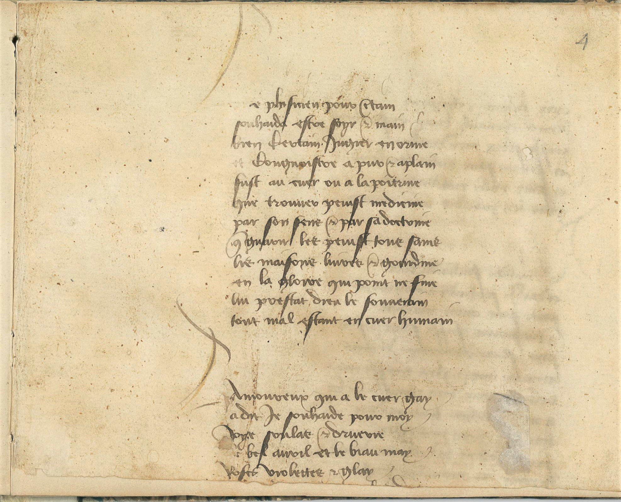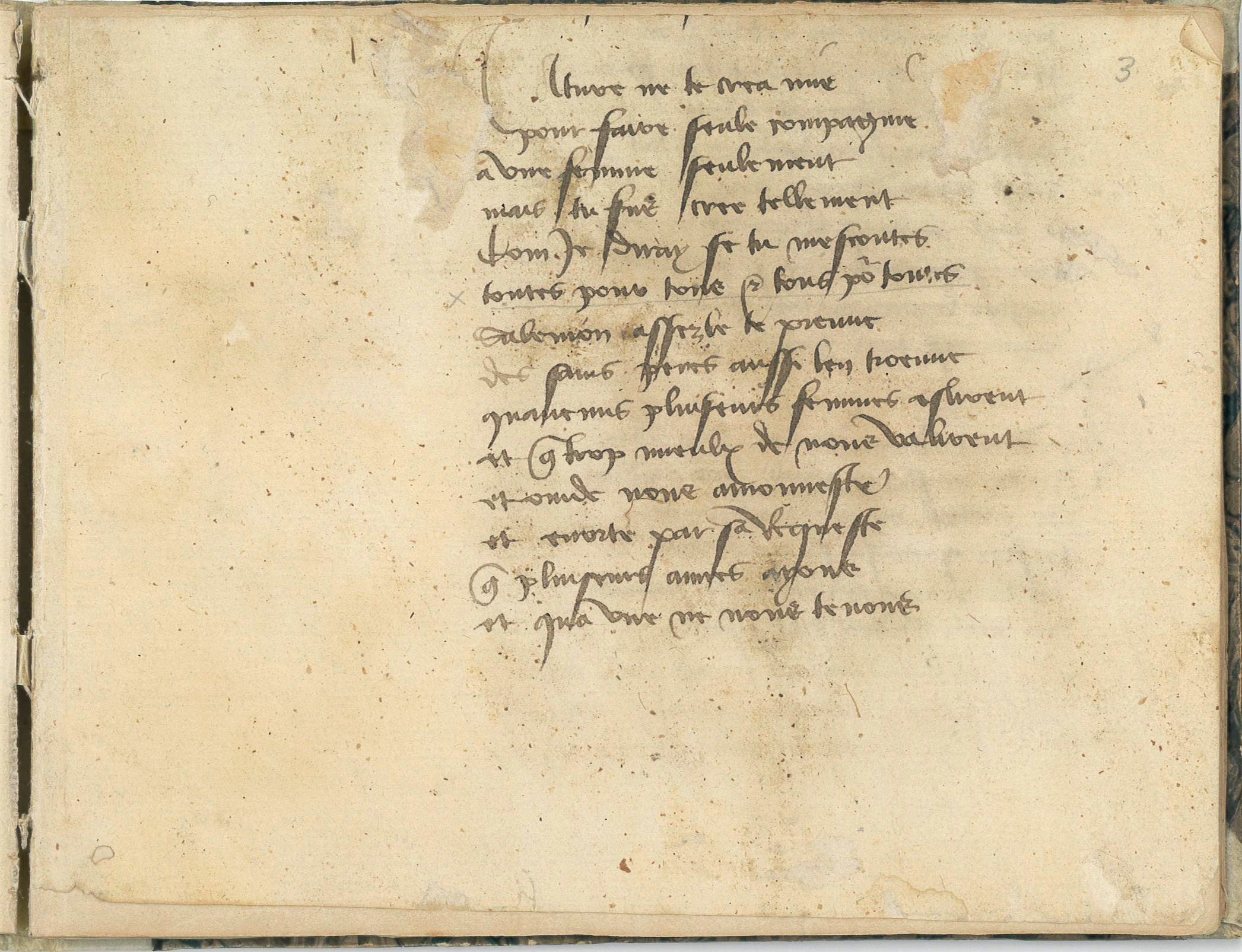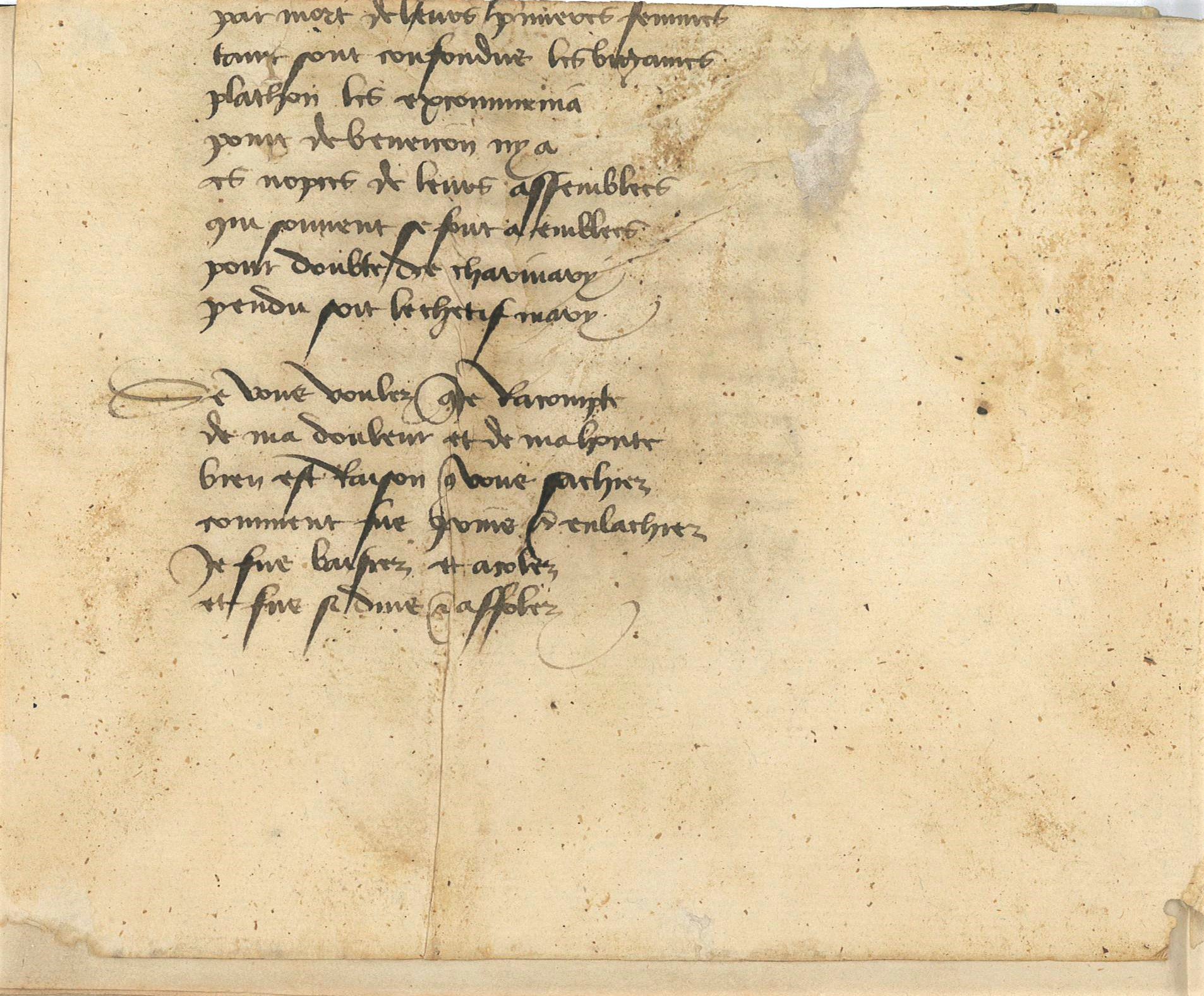 ]. Environ 337 vers en français recopiés d'une version du célèbre Livre des lamentations de Mathéolus (également connu sous le nom de Matthaeus Bononiensis, Matthieu de Boulogne-sur-Mer), un traité manuscrit en latin sur la misogynie, composé entre 1295 et 1300, connu en un seul exemplaire à Utrecht.