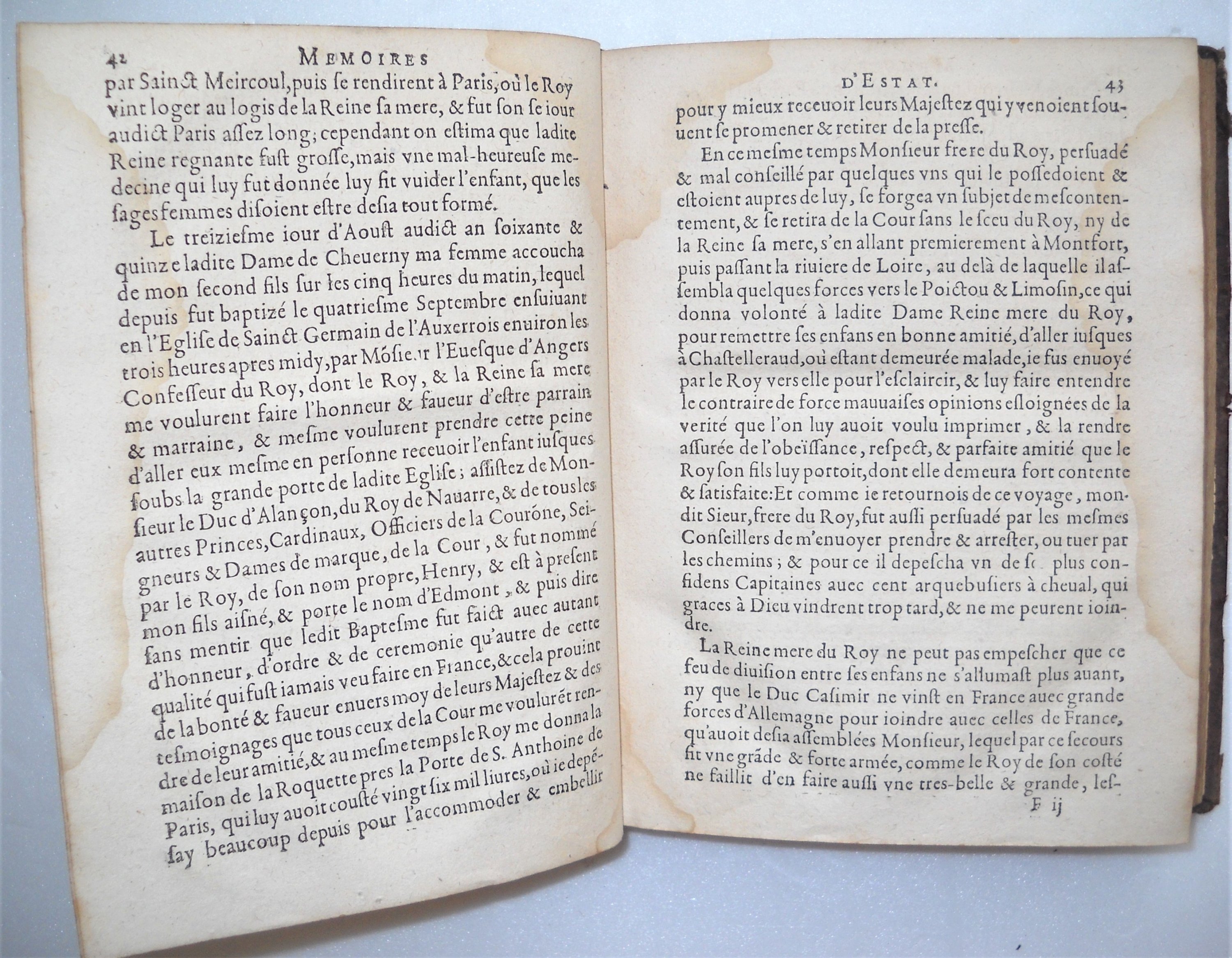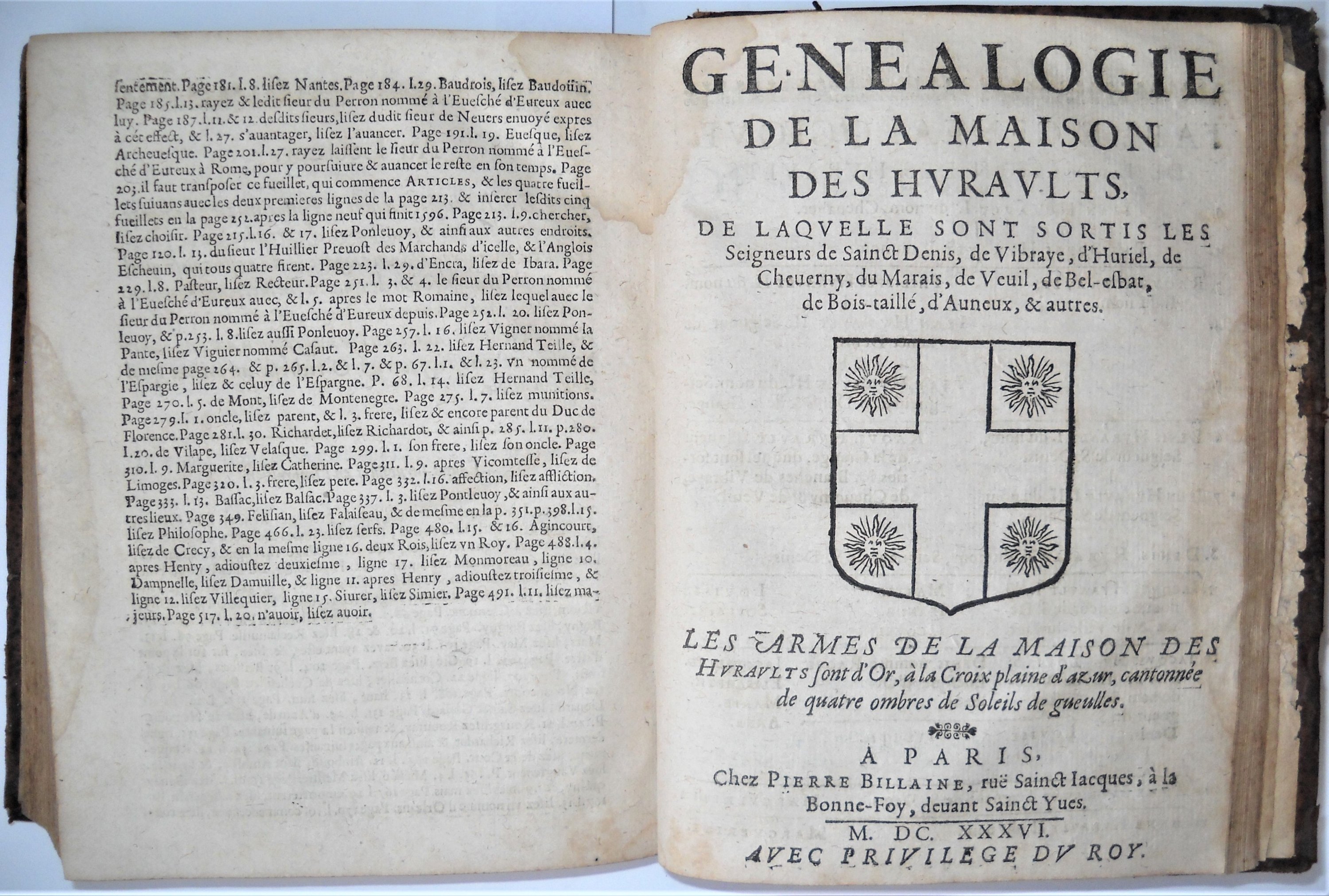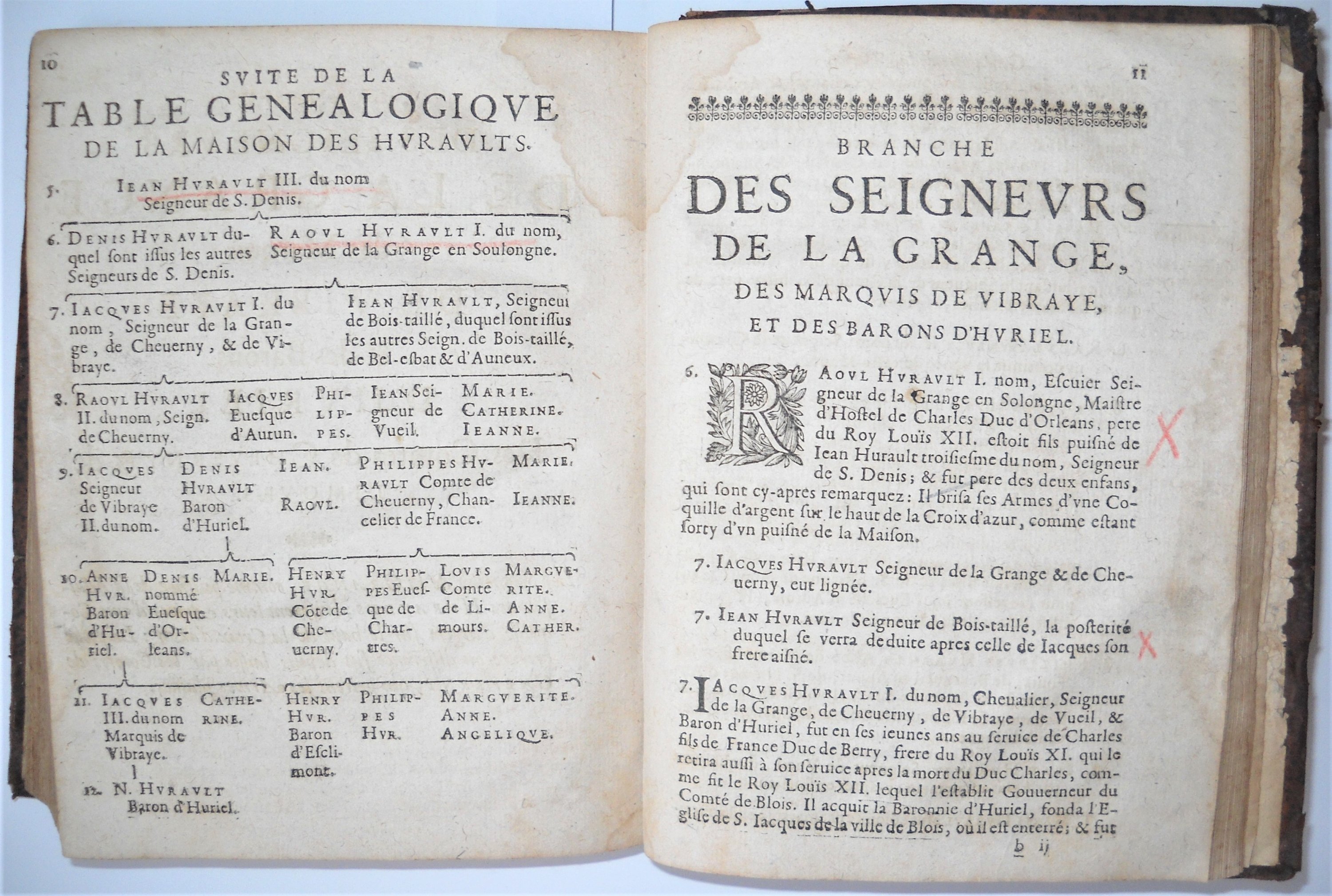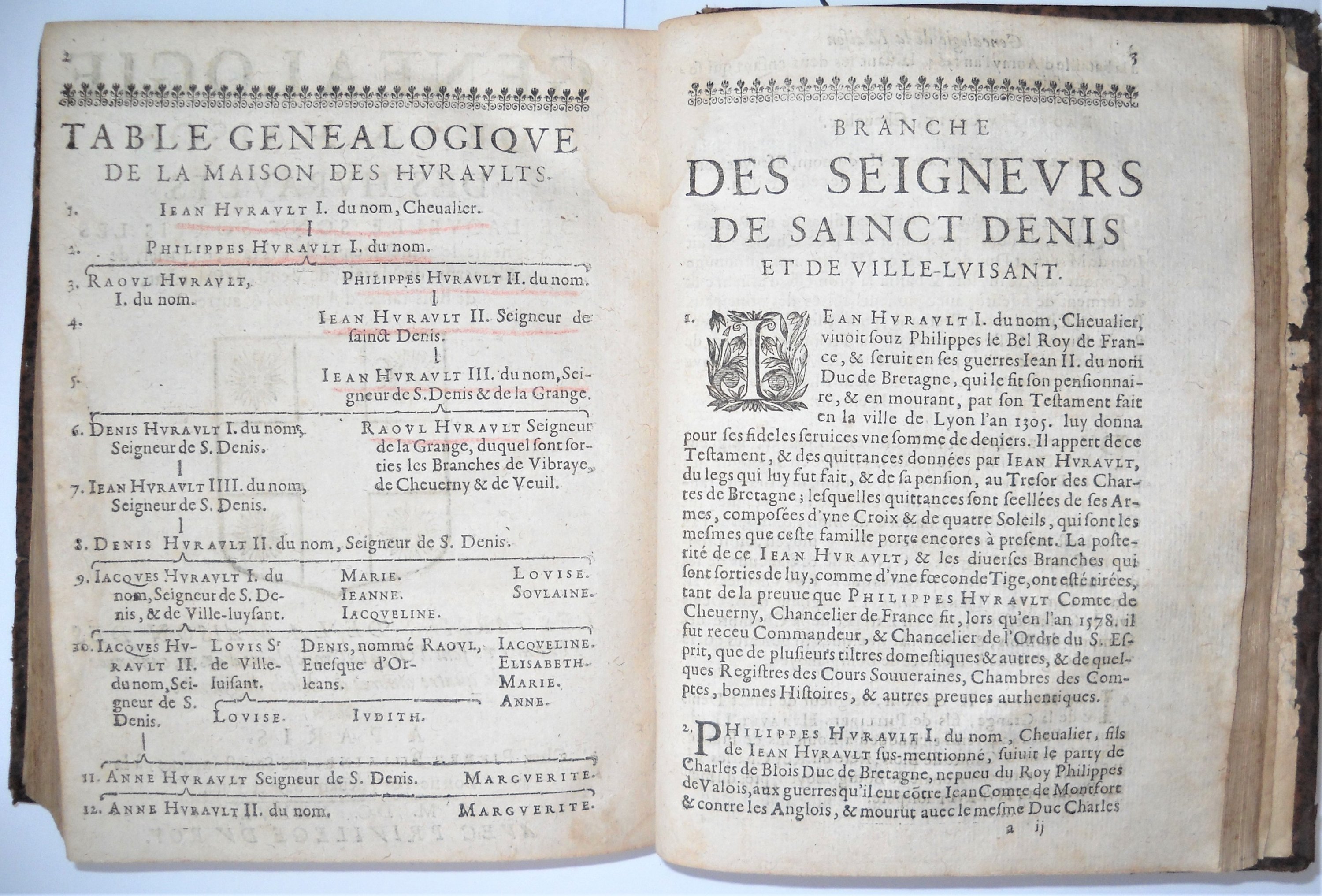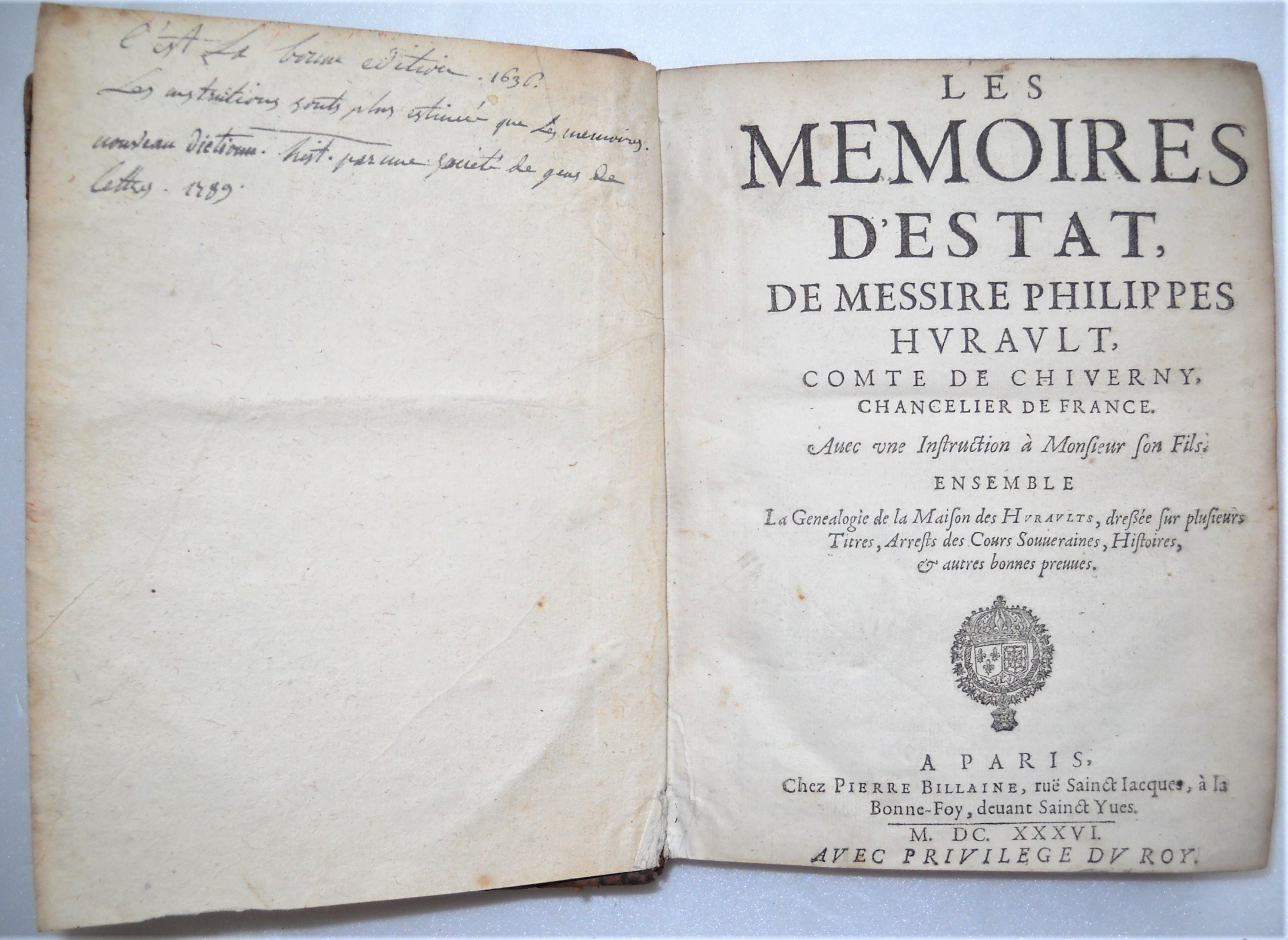 Les mémoires d'estat, de messire Philippes Hurault, comte de Chiverny, chancelier de France. Avec une instruction à Monsieur son Fils. Ensemble la genealogie de la maison de Huraults, dressée sur plusieurs titres, arrests des Cours souveraines, histoires, & autres bonnes preuves, inclus Genealogie de la maison des Huraults, de laquelle sont sortis les seigneurs de Sainct Denis, de Vibraye, d'Huriel, de Cheverny, du Marais, de Veuil, de Bel-esbat, de Bois-taillé d'Auneux, & autres, Paris, Pierre Billaine, 1636, rel. plein veau dépoque (en létat) in-8, (5) ff.-584 pp.-(1) ff.-54 pp.-(2) ff. (mouillures).