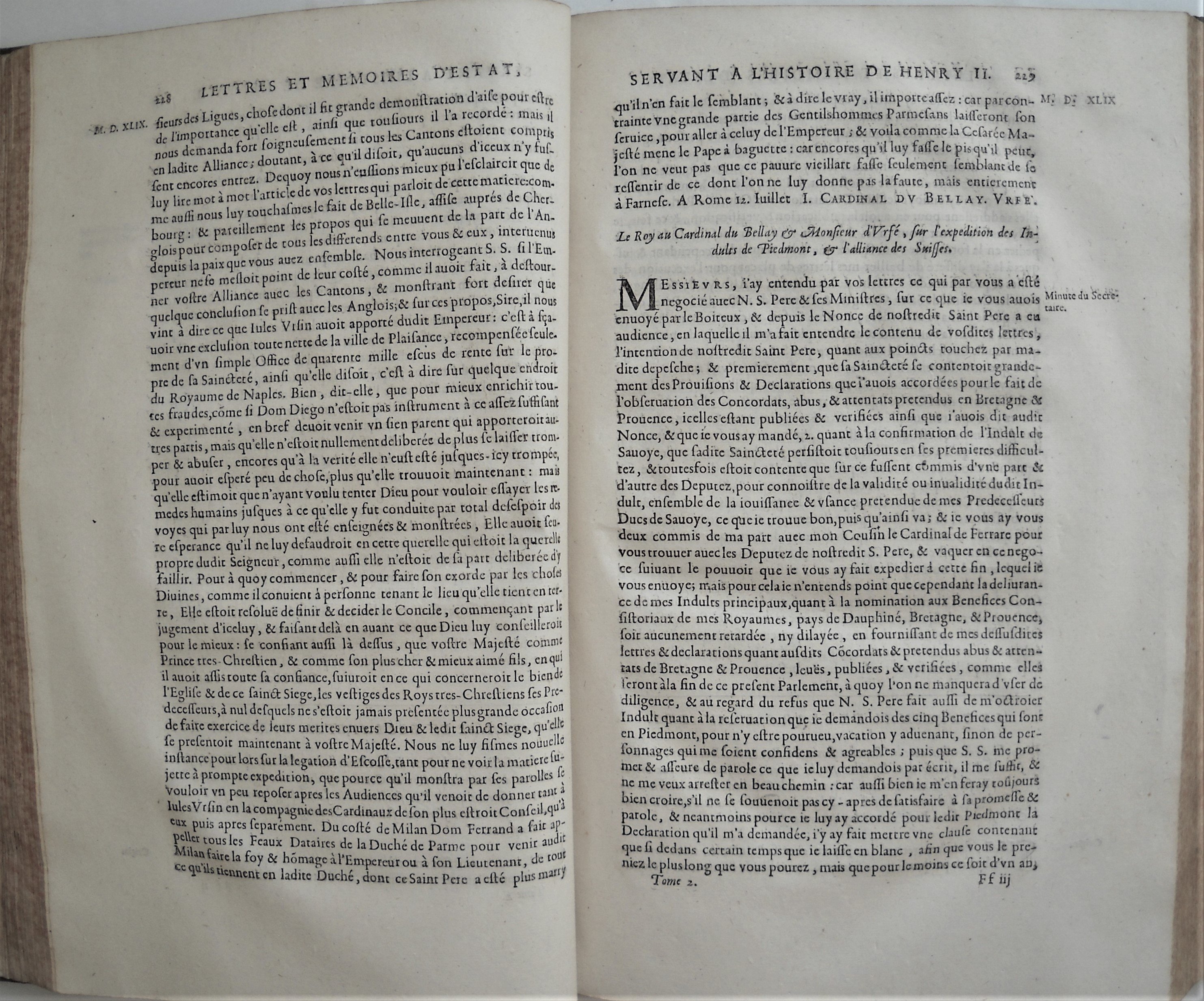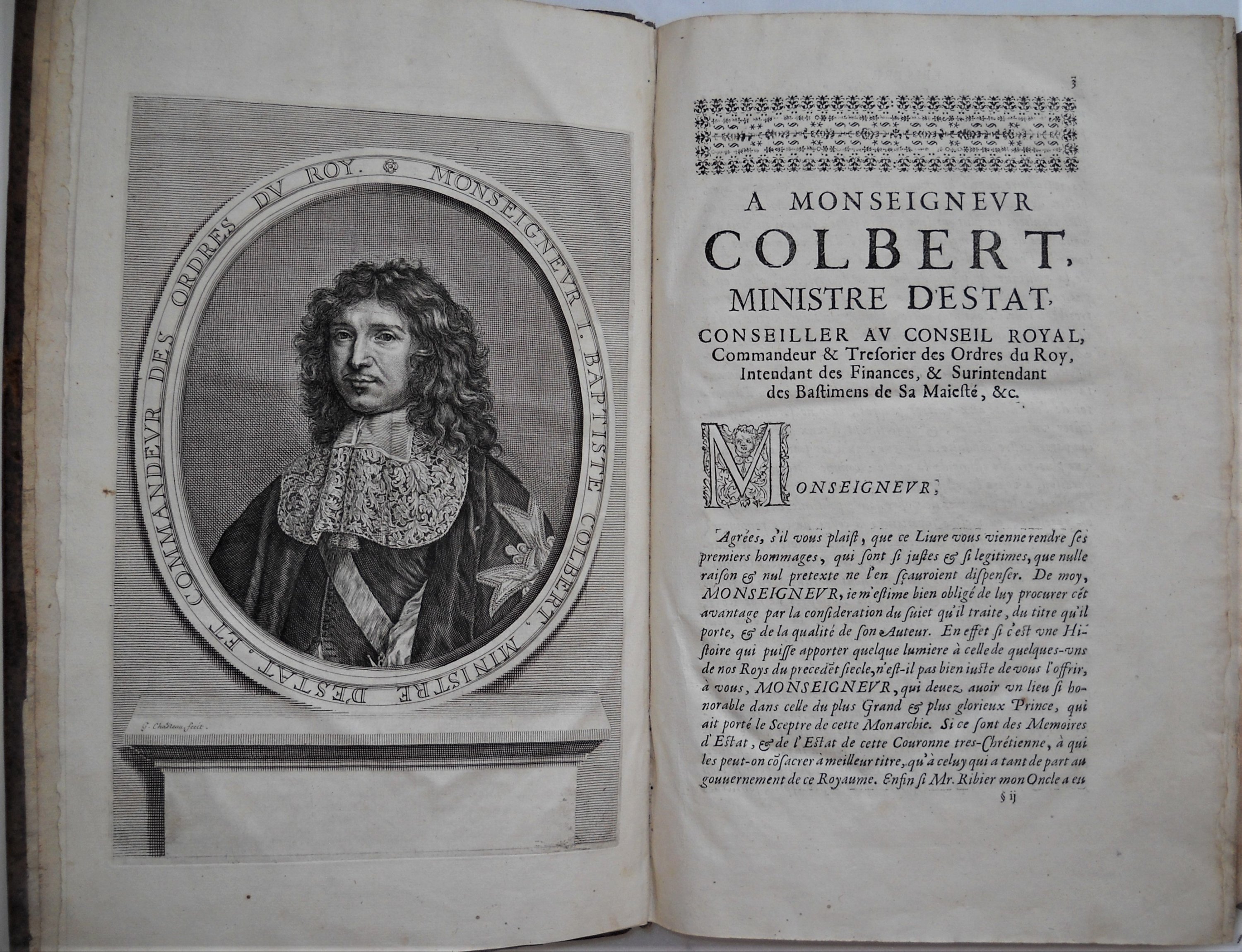 Lettres et mémoires d'estat des Roys, Princes, Ambassadeurs et autres Ministres, sous les règnes de François Ier, Henry II et François II contenans les intelligences de ces Roys avec les Princes de l'Europe contre les menées de Charles Quint ; principalement à Constantinople auprès du Grand Seigneur ; en Angleterre avec Henry VIII, en Allemagne avec les Princes de l'Empire ; en Italie avec le Pape et les Vénitiens... ouvrage composé de pièces originales, la pluspart en chiffres... et mesme de Minutes de nos Roys... formant un corps d'histoire, 2 vol., chez Jules Hotot, Blois, 1666, rel. plein cuir in-fol. (en létat, importantes épidermures), 642-22 et 842-20 pp., avec portraits gravés de Colbert et de Guillaume Ribier.