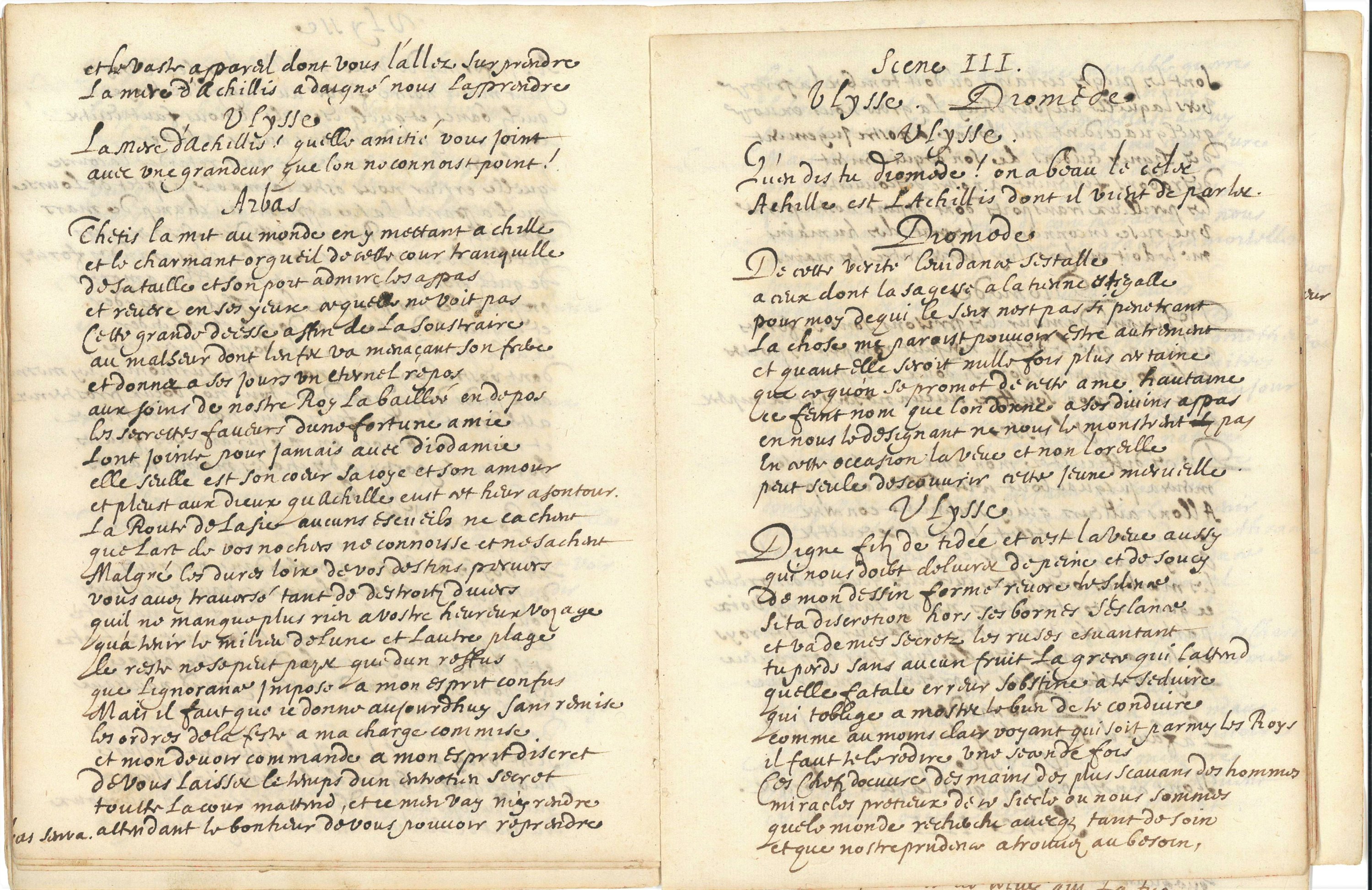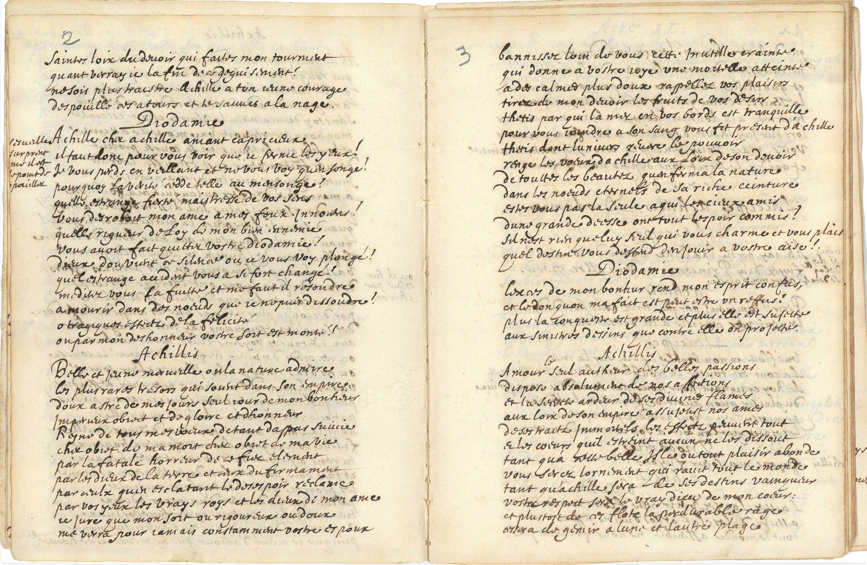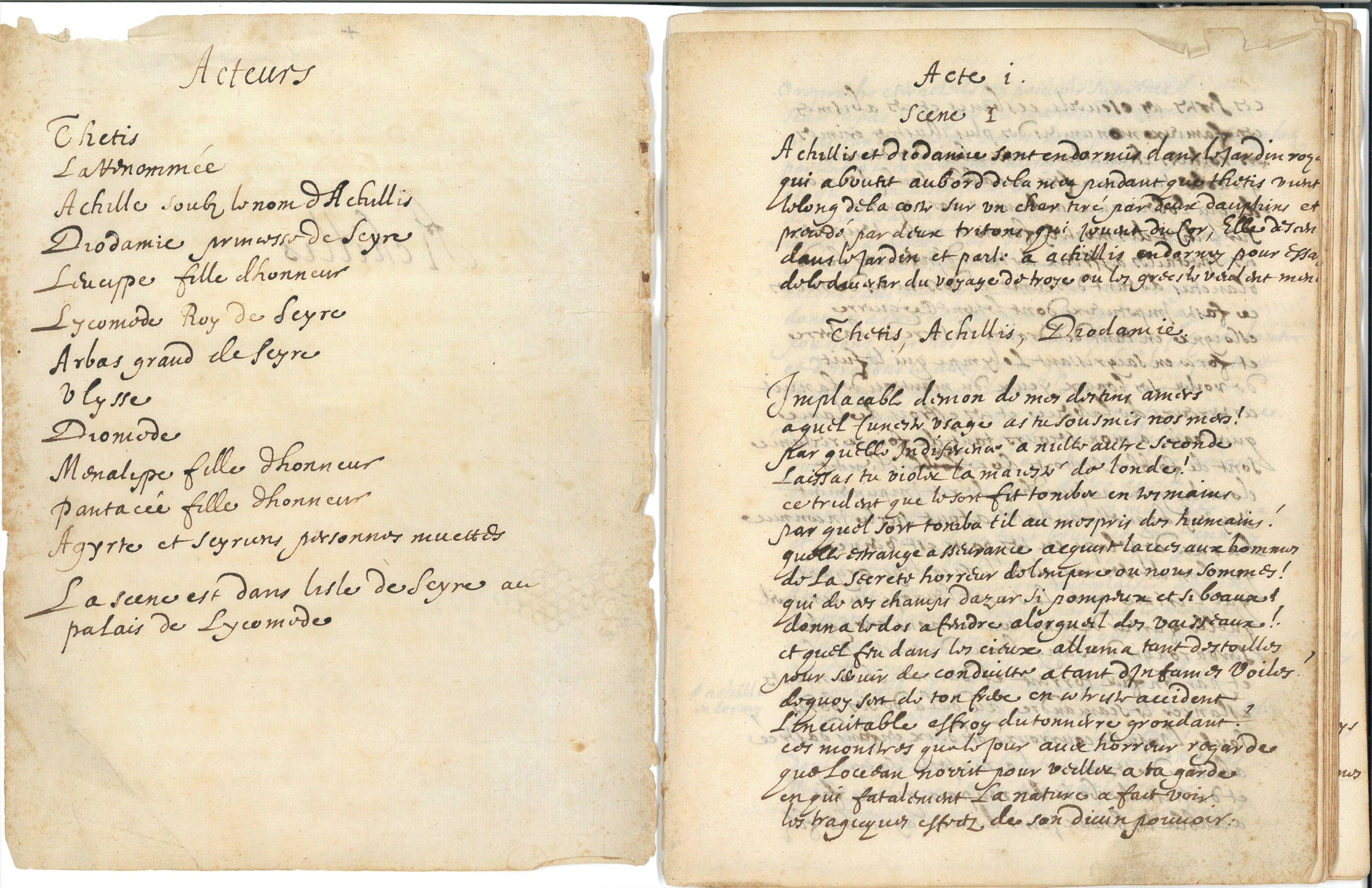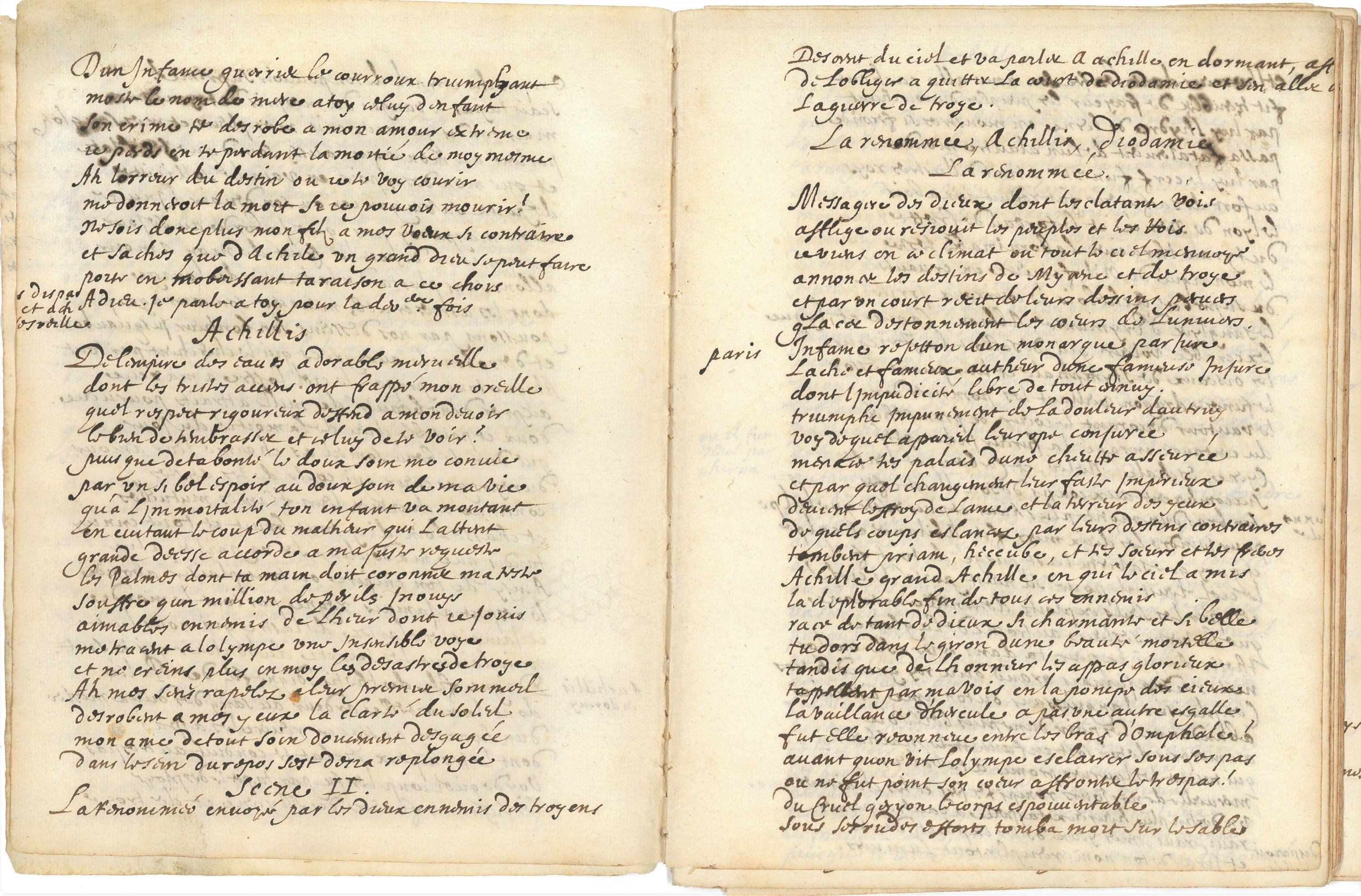 Achillis, manuscrit à l’encre brune sur papier vergé filigrané, 58 pp. in-8 ; texte inédit de composition d’une tragédie en vers inspirée du célèbre poète grec Homère, et plus particulièrement l’épisode de l’idylle amoureuse entre Achille et la princesse Déidamie, dont la scène se déroule dans l’île de Scyre [Skyros] au palais du roi Lycomède. Cette pièce s’inscrit parfaitement dans l’esprit de l’époque, faisant apparaître le héros homérique sous un nouveau jour, celui de la sensibilité et de la beauté, habituellement intrépide et colérique, dont la valeur militaire va de pair avec la puissance et l’orgueil.