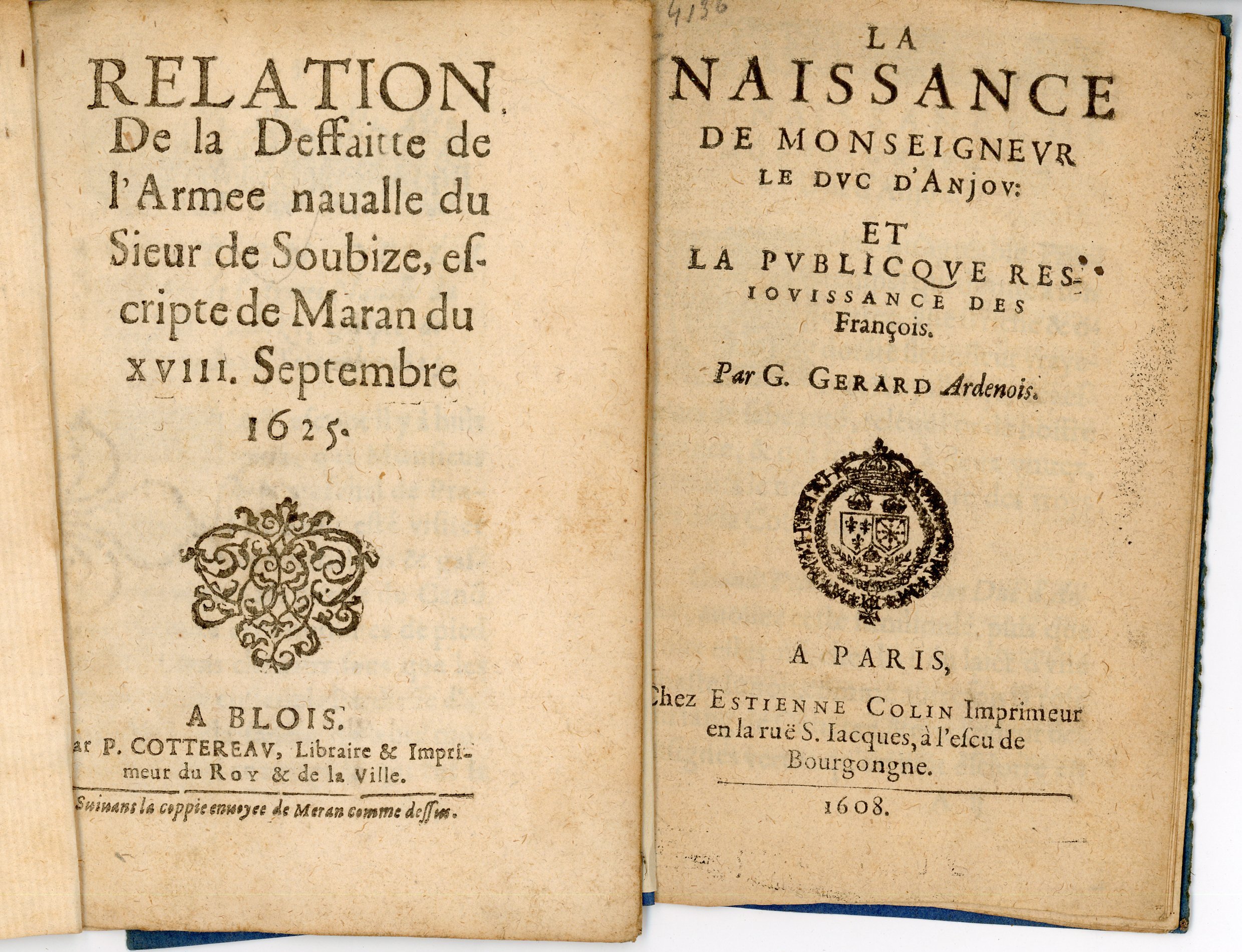 Ardenois G. Gérard, La naissance de monseigneur le duc dAnjou et la publicque resjouissance des François, Paris, Etienne Colin, 1608, in-12, 16 pp. ;